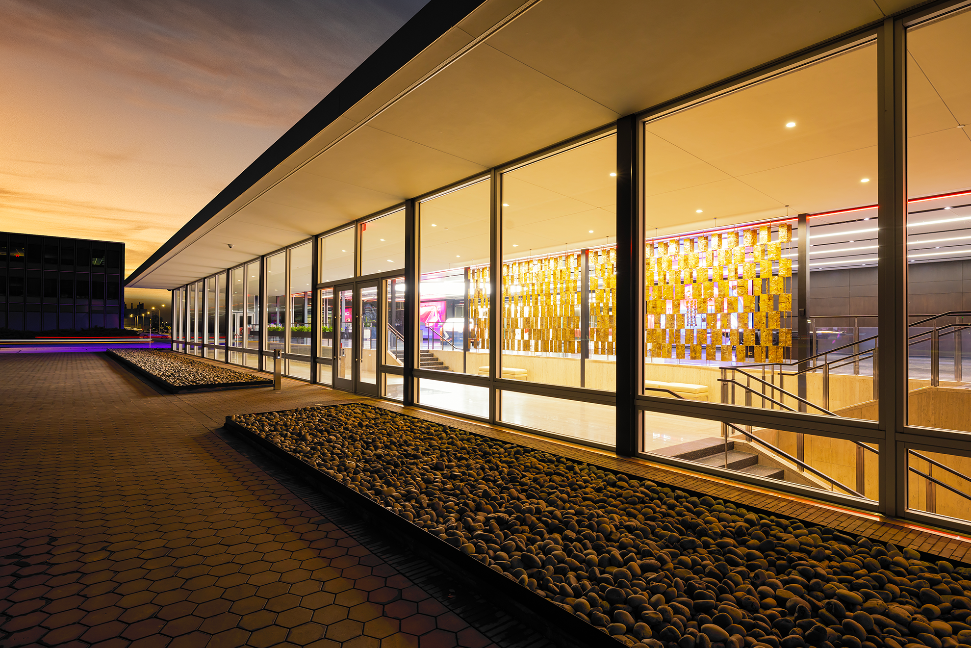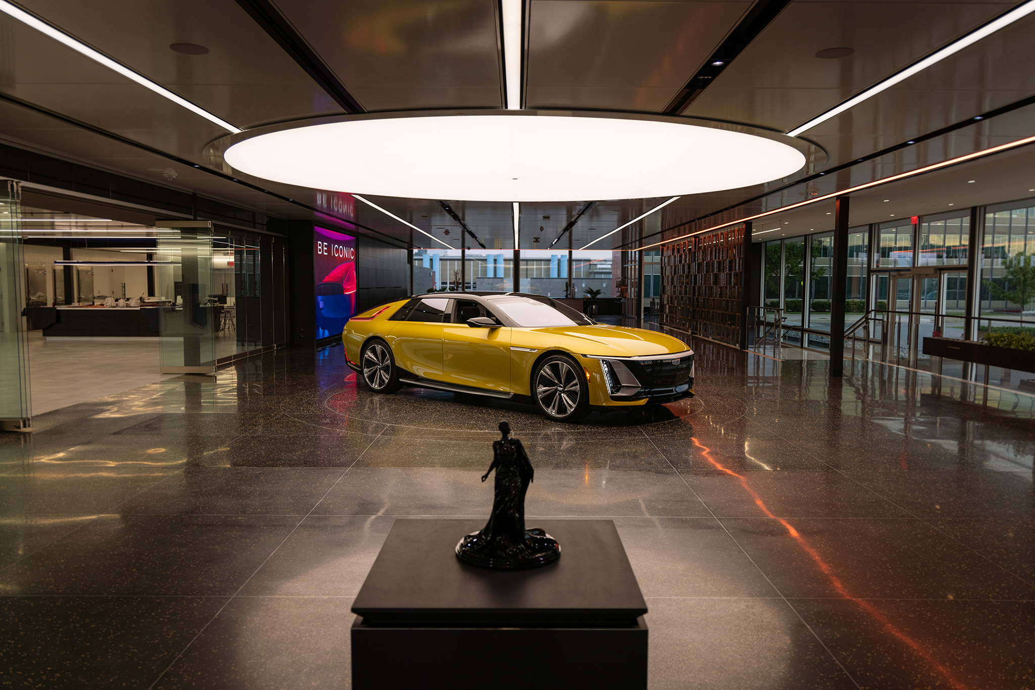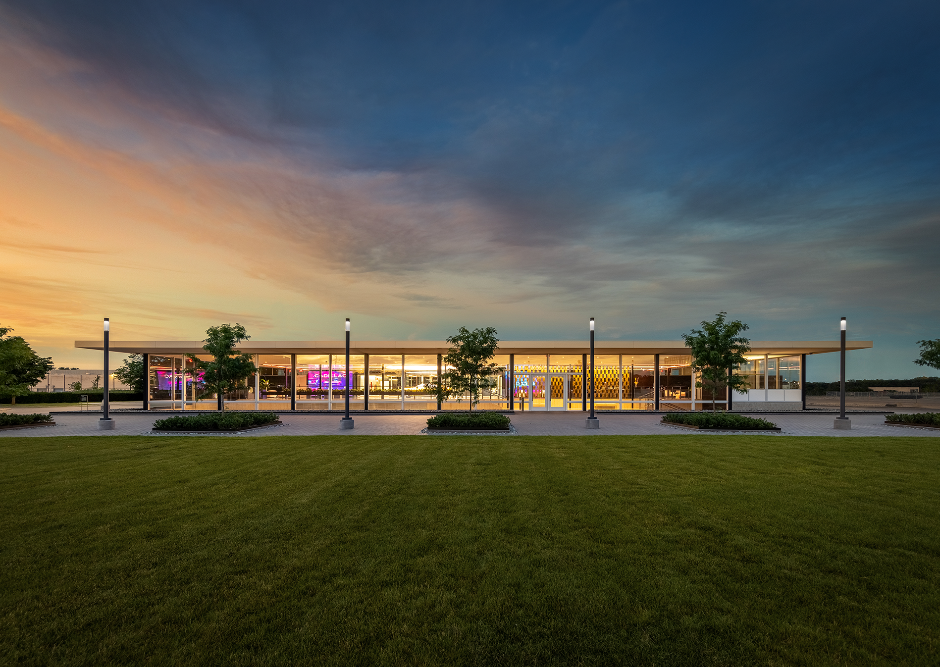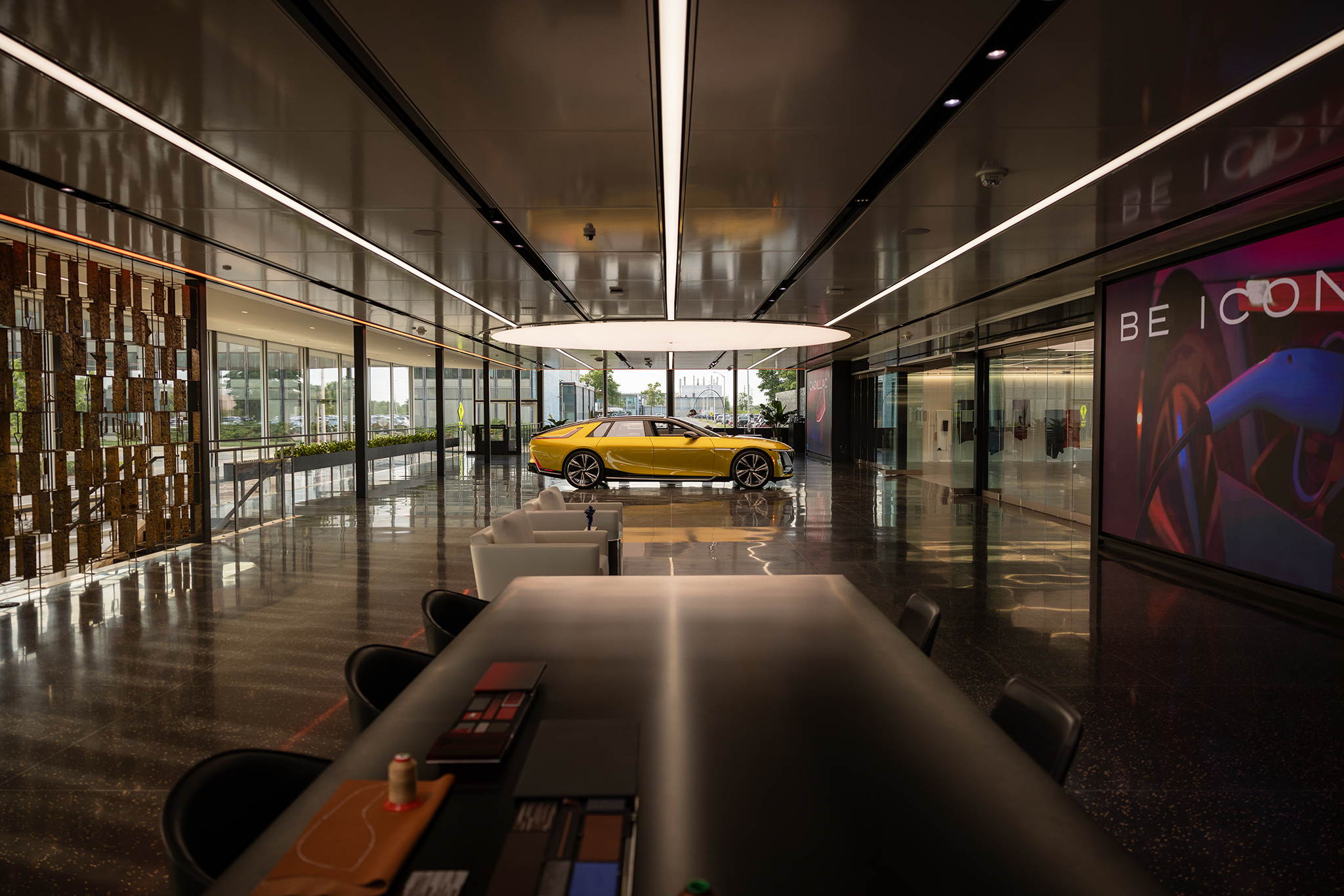 Entry DescriptionThe renovated design studio at the GM Tech Center Campus in Warren, Michigan, reimagines Eero Saarinen’s Central Restaurant into a customer-focused space for personalized vehicle design. Once a dining hub for creative minds, the building is transformed into a glowing jewel box, inviting new customers to join in the design process. Upon entry, the restored Bertoia screen sets the tone for the personalization journey. The original nine-by-nine Saarinen grid guides new luminaire organization, preserving the original architectural design principle. Adaptable gallery lighting supports customized displays, with wireless dimming and color tuning via tablet interface for easy user control. Glowing ceiling lines reflect into the floor, creating motion and energy. Clean recessed slots conceal building MEP systems, maintaining spatial clarity. Track lighting highlights signature objects, while motorized cabinets reveal illuminated material palettes tailored to customer taste. The final reveal occurs beneath a massive illuminated disk, symbolizing the boundless potential of the client-designer partnership.
