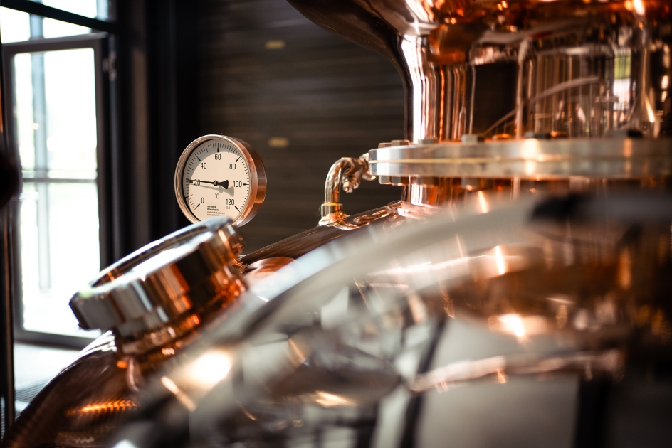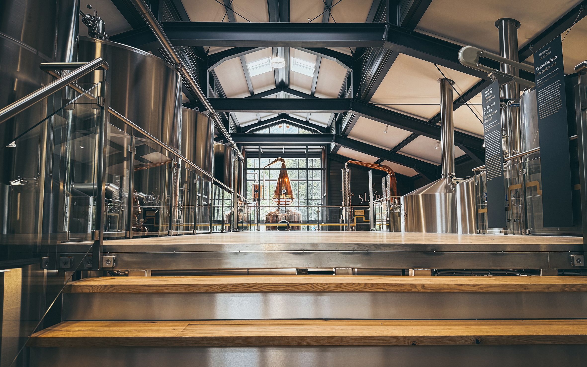 The journey concludes on a bright visitor platform overlooking the distillery, where modern technology meets atmospheric design. The highlight awaits at the center: a five-meter-high copper still encased in glass. Lit like a stage for liquid gold, it forms the unforgettable finale of the experience.