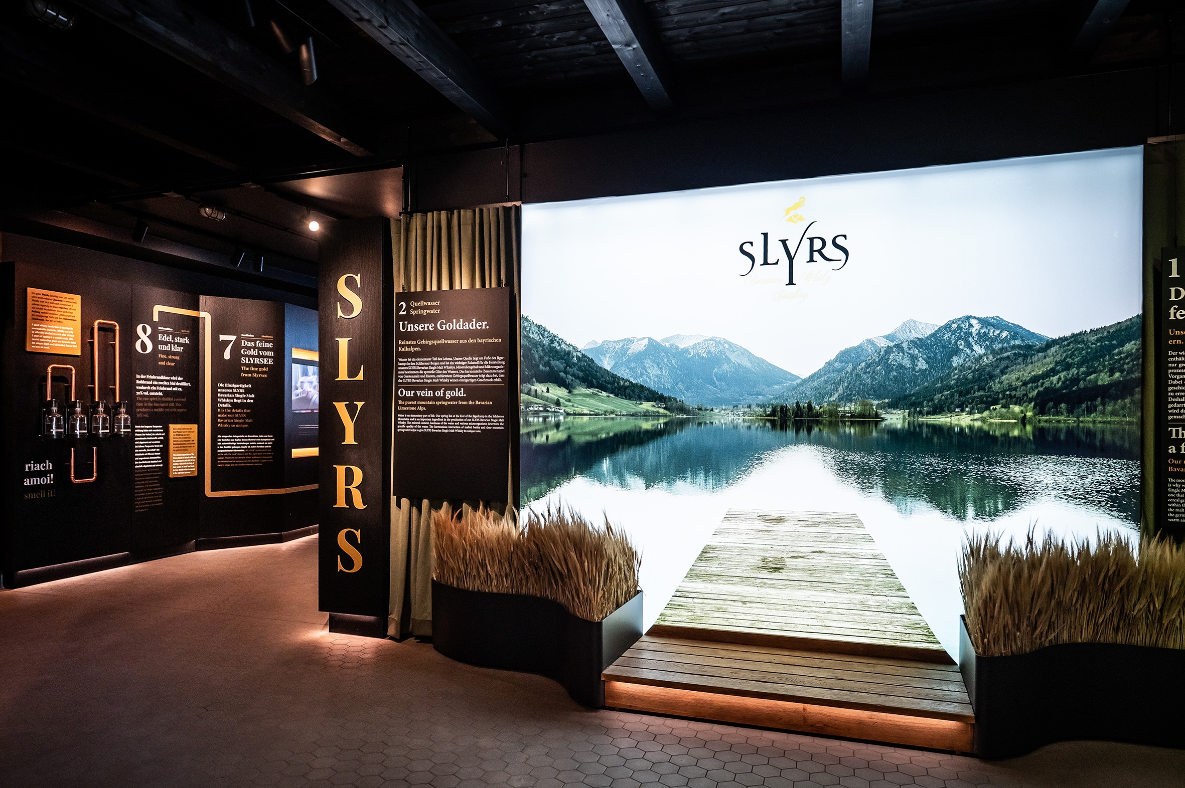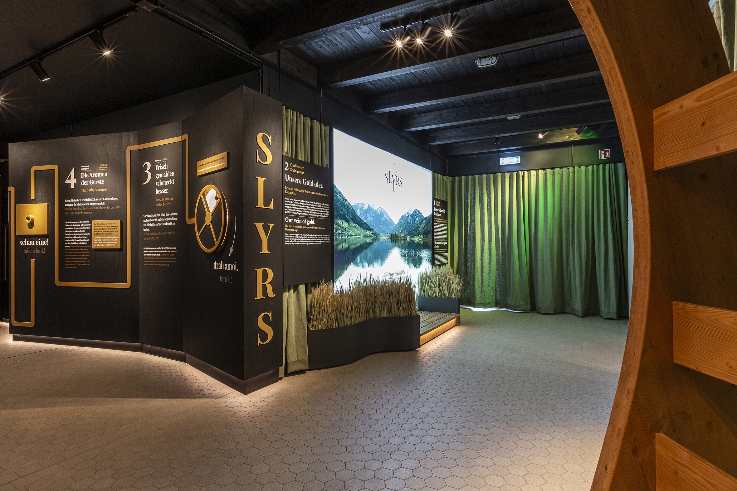 Entry DescriptionThe lighting design of the SLYRS Campus weaves architecture, function, and emotion into a captivating journey that guides visitors from the first step to the final impression. At the entrance, a glowing panorama of Lake Schliersee sets the scene, framed by green fabric panels and streaks of light that evoke a sunlit forest. Along the tour, spotlights and backlit displays highlight each station, inviting exploration and discovery.