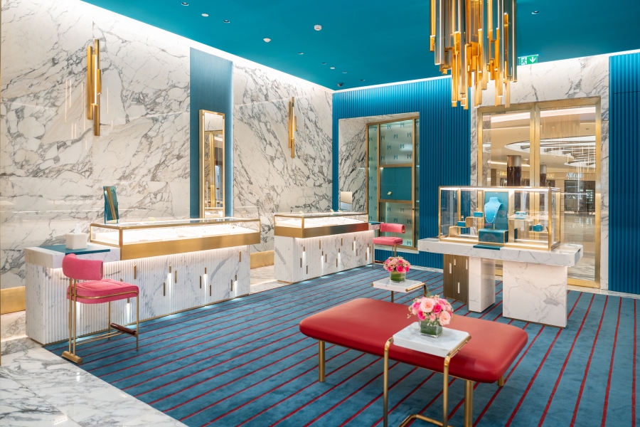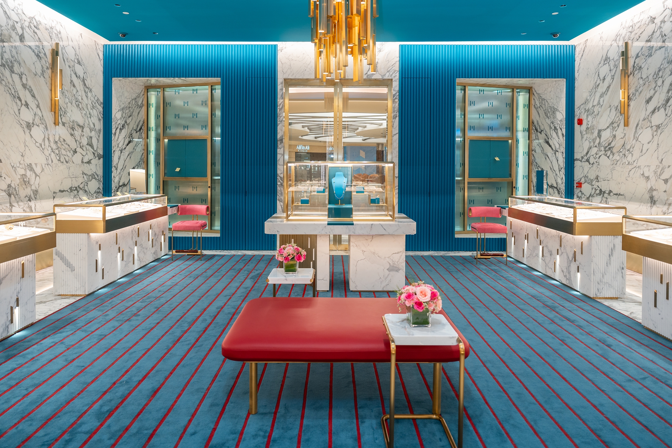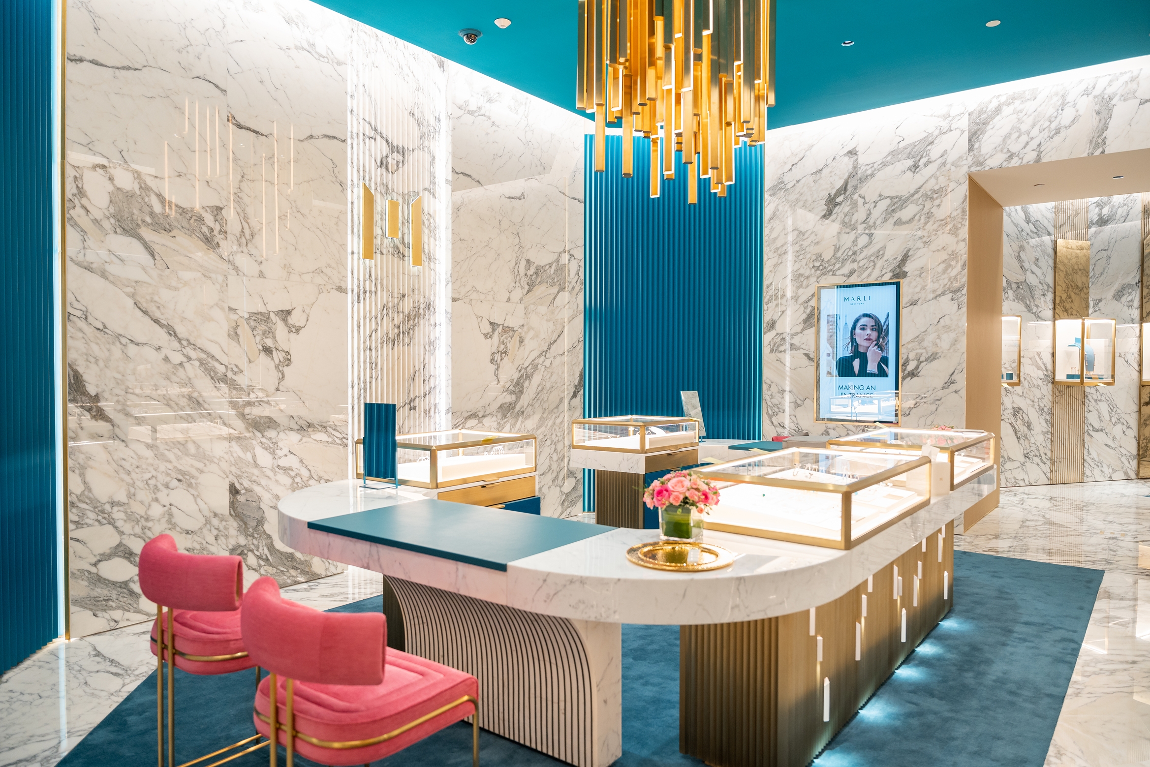 Accent lighting focuses on key displays, ensuring the jewelry stands out without overpowering the space. Subtle contrasts in the M Lounge and High-End Jewellery Lounge provide an intimate feel for exclusive collections and product launches.