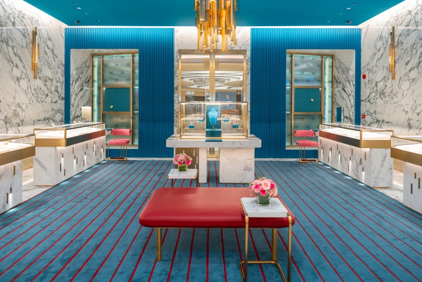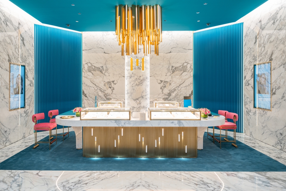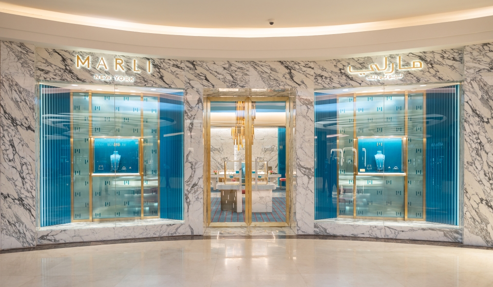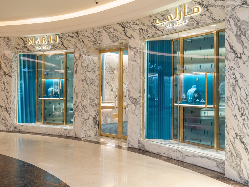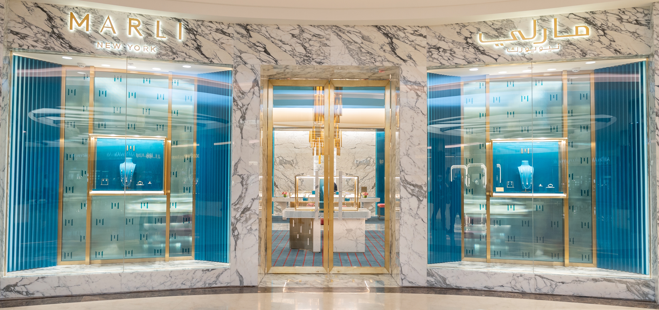 The boutique’s façade extends this thoughtful lighting approach, incorporating backlit monogrammed blue glass panels and an illuminated marble frame. These elements provide a refined exterior while offering glimpses of the elegant interior. Every lighting detail reinforces the brand’s identity and enhances the customer’s journey through the space.