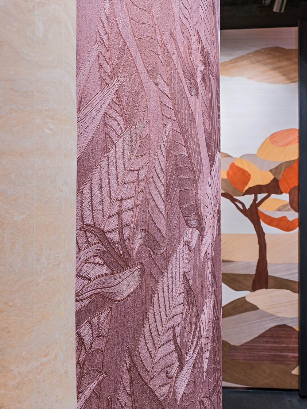 To further elevate the experience, high-CRI LEDs with rich red tones are employed to showcase the wallcoverings' true colors and intricate patterns. The thoughtful layering of decorative and architectural lighting creates a warm, inviting ambiance while remaining functional and versatile.
