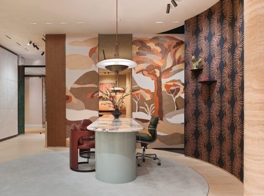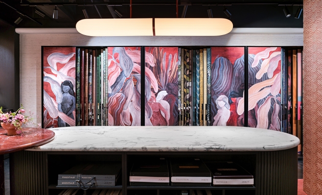 Entry DescriptionArte’s NYC flagship showroom showcases the finest wallcoverings, embodying the company’s creative artistry and commitment to craftsmanship. Designed to captivate, the showroom features a front reception that evokes an opulent living space, alongside a main display area adorned with wallcovering samples.