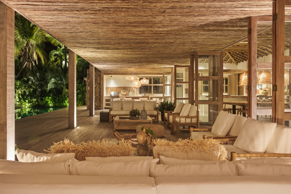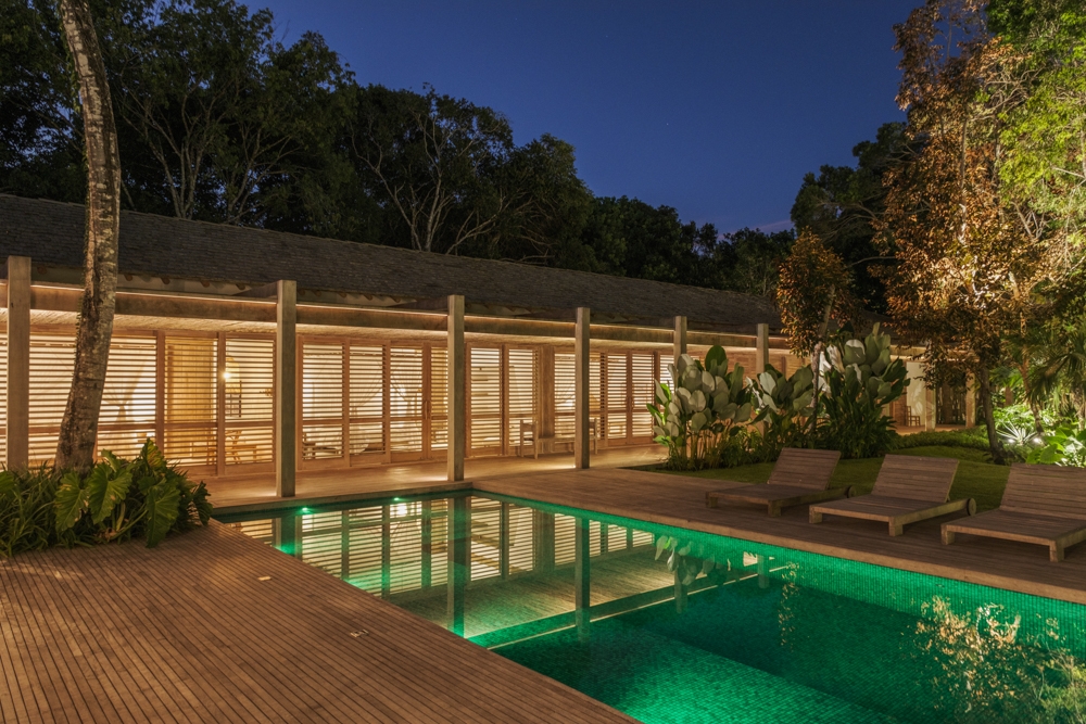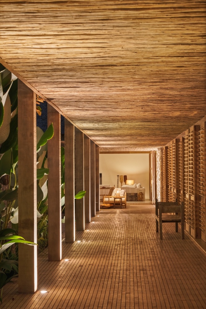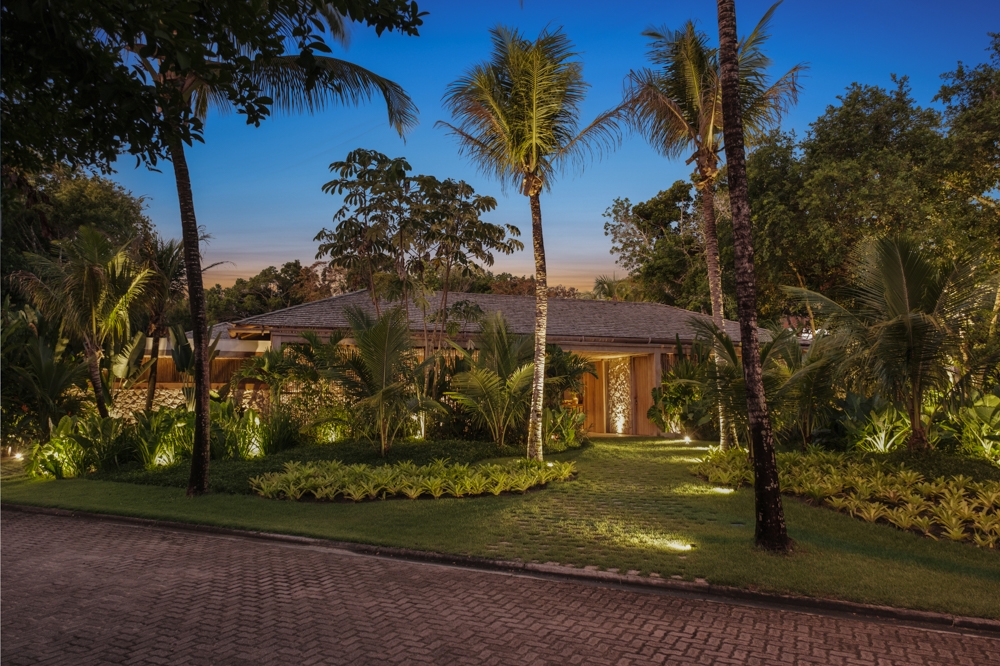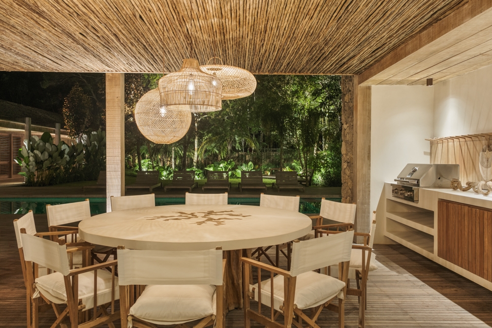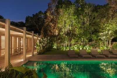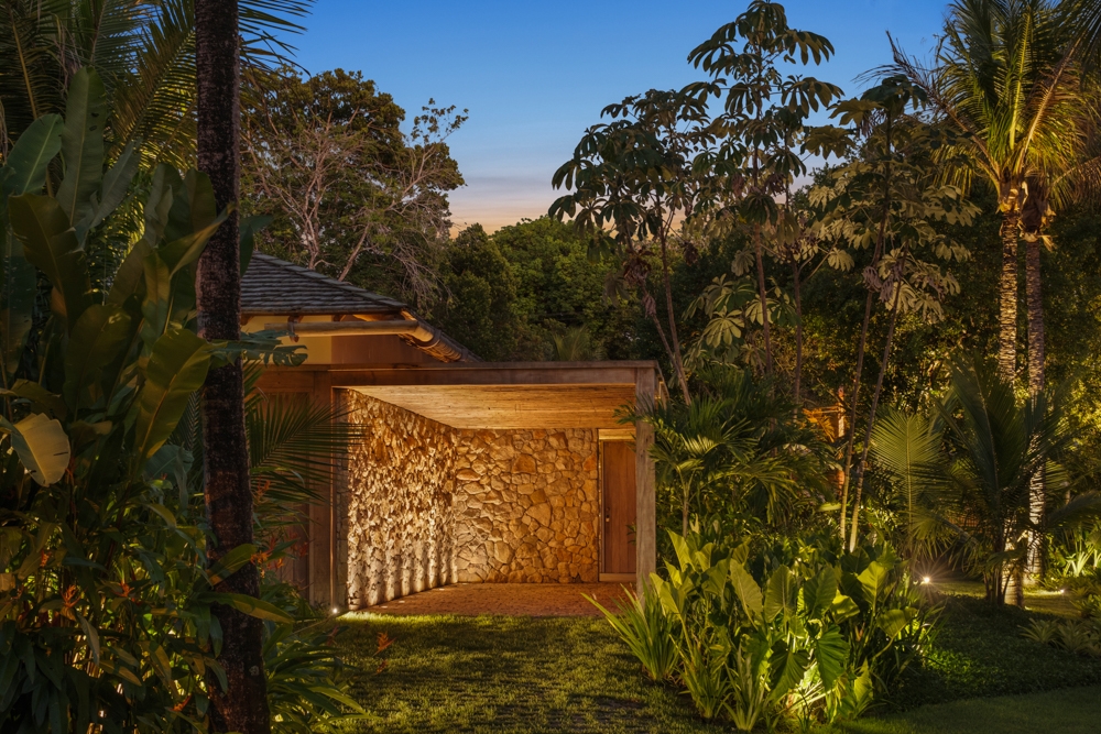 Entry DescriptionBeach House with a Casually Elegant Style, located in a green area in Trancoso beach in Bahia, Brazil, featuring a rustic style within contemporary architecture. The floor plan in an āLā shape connects the spaces fluidly. On one side is the social block, on the other side are the suites.The project emphasizes the use of natural materials such as wood, stone, and fibers, which blend with the landscape, ensure thermal comfort, and reinforce the connection with the surroundings. The lighting design was developed in partnership with the architect, who from the beginning brought decorative lamps from Indonesia made of natural-colored fibers, which perfectly harmonize with all the materials used as finishes, thus becoming the protagonists of the lighting design.The rest of the lighting was designed to be discreet, indirect, and efficient, mostly installed on the floor, highlighting the natural materials used in the architecture, such as stone walls, fiber ceilings, and the roof made of round eucalyptus mounted with taubilhas.The client requested the use of easy-to-maintain LED products, since the house is located far from commercial centers.For indoor lighting, we used small surface-mounted ceiling fixtures with 6W LED MR-16 bulbs (3000K).For the outdoor areas, we used 7W LED PAR-20 bulbs (3000K) in floor-embedded fixtures, enhancing all the greenery around the house.