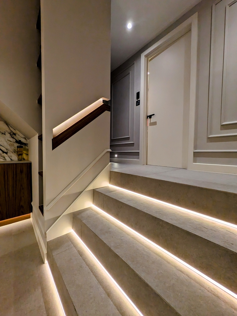 Sustainability ApproachEvery product utilised complies with Part L which ensured the efficacy of the lamp was creating a compliant amount of light versus the energy used to create it. All of the downlights were integrated LED fittings comprising of a modular makeup that allowed parts to be replaced and recycled without the whole fitting needing to be disposed of. The property was controlled using a Lutron automated lighting control system ensuring that all lighting was only on when in use and all circuits were split up to ensure no lighting was on unnecessarily. All fittings had between 50,000 and 75,000 hours lifetime so they did not need regular replacement or lamp changing.