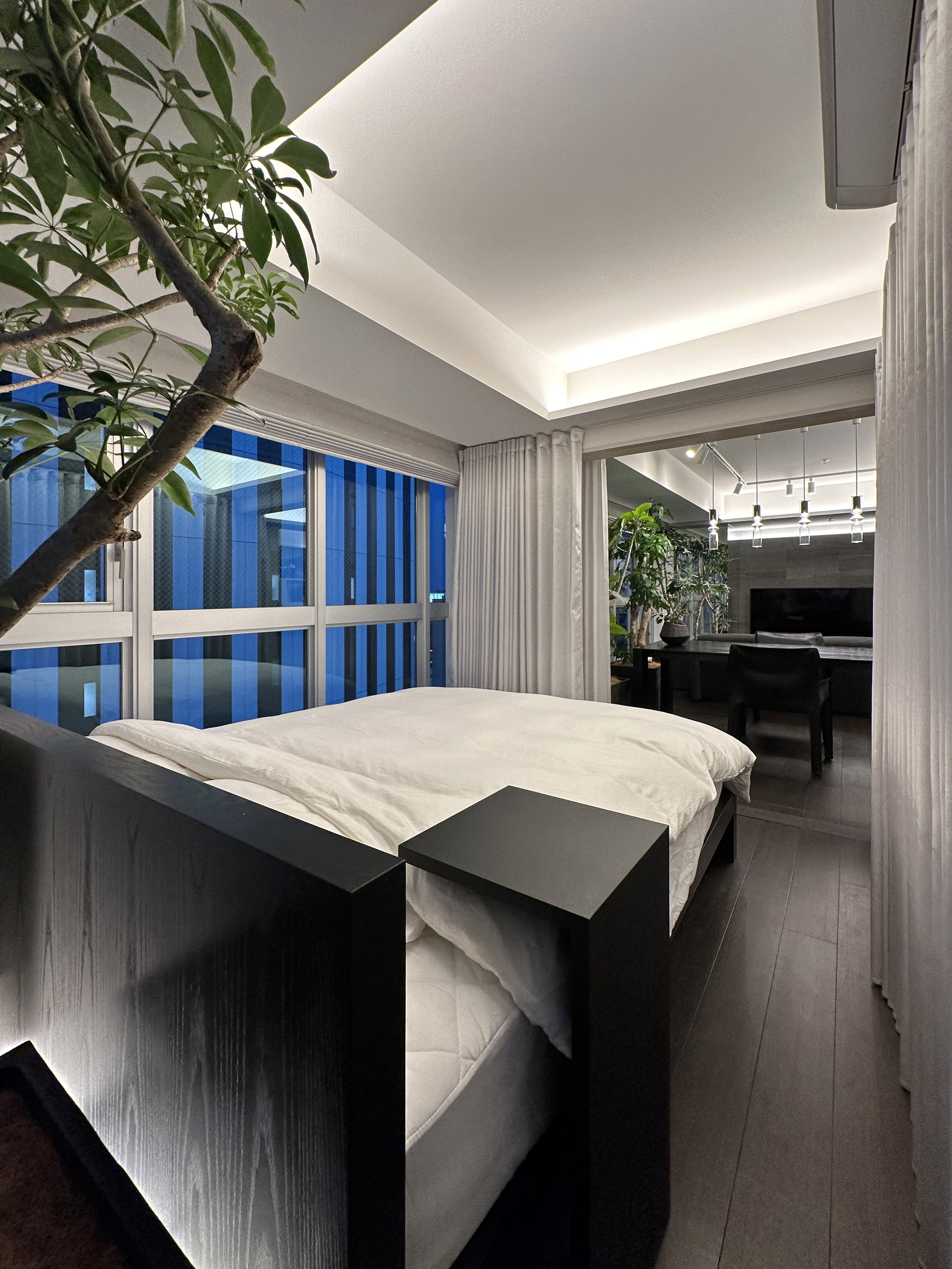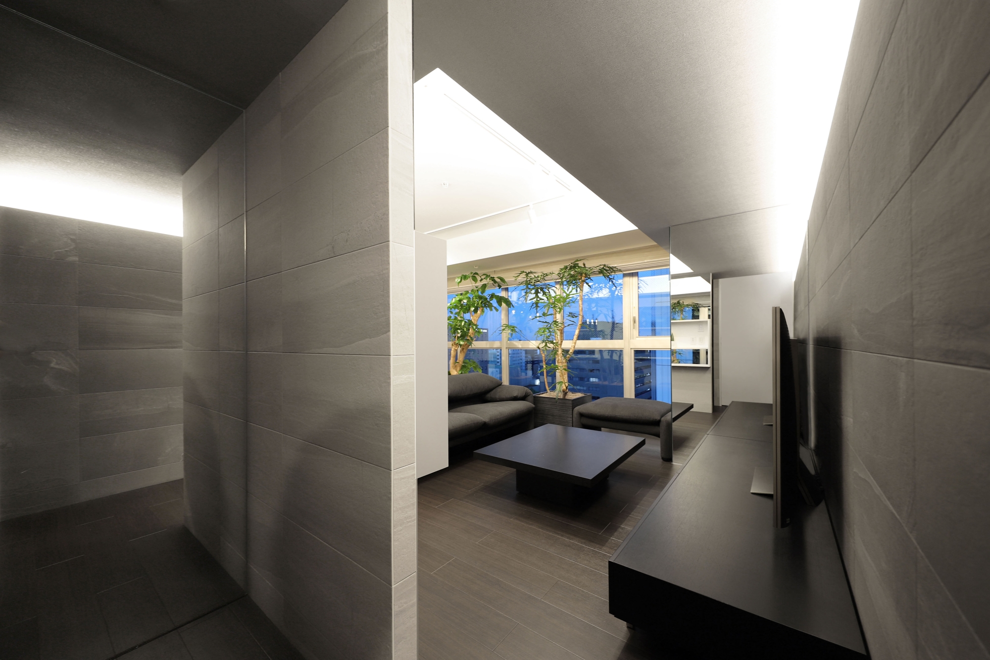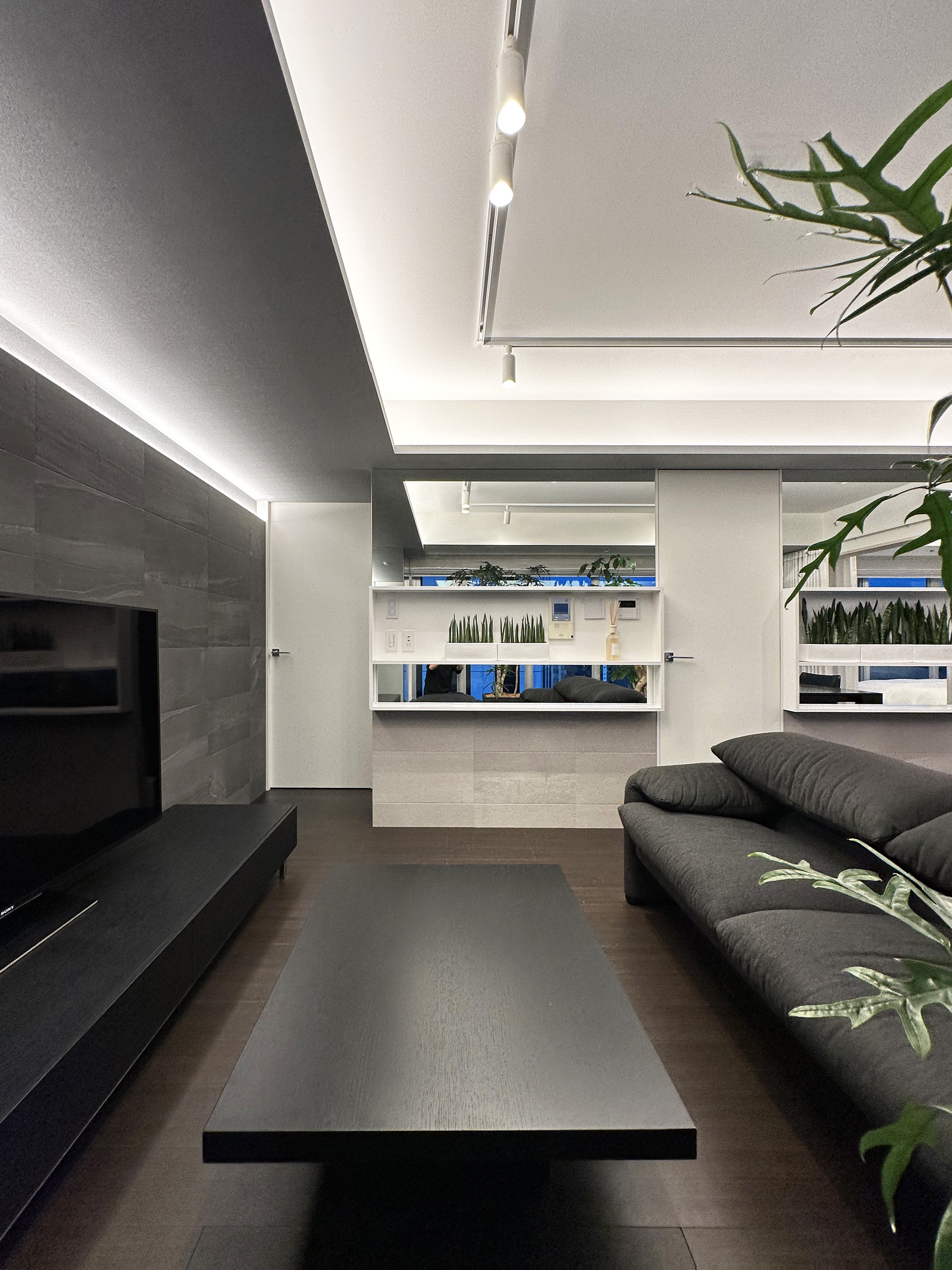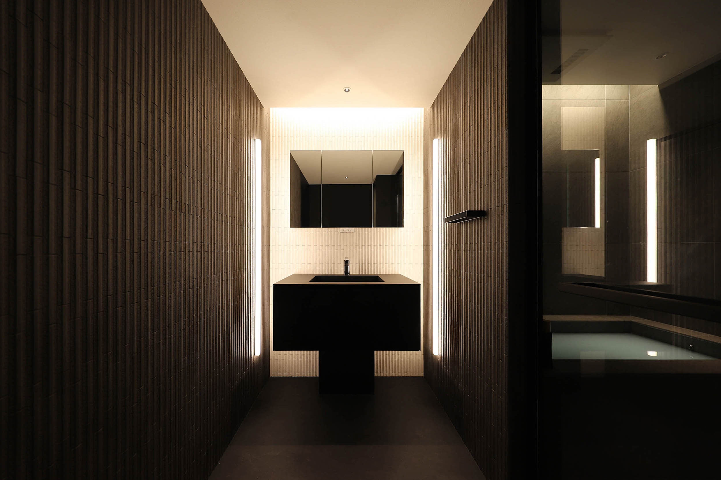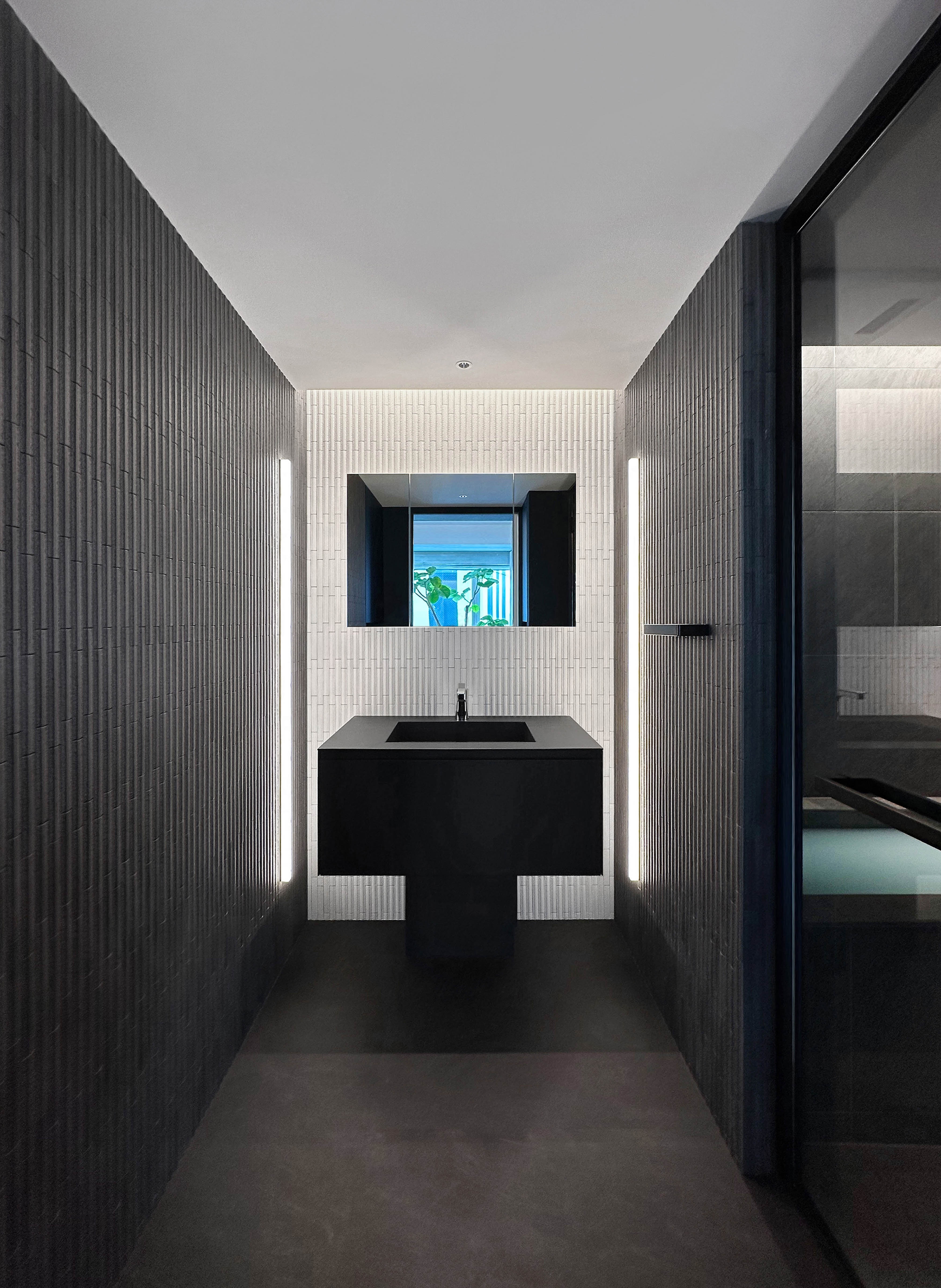 In the washroom, vertical line lighting flanking a sculptural basin creates a striking focal point, while ceiling ambient light and downlights add elegance and tension. In the living area, textured tiles reveal shadows under line lighting, enhancing depth and sophistication. Black-toned custom furniture contrasts with light, while foliage matched to ceiling height interacts with illumination to bring vibrancy.