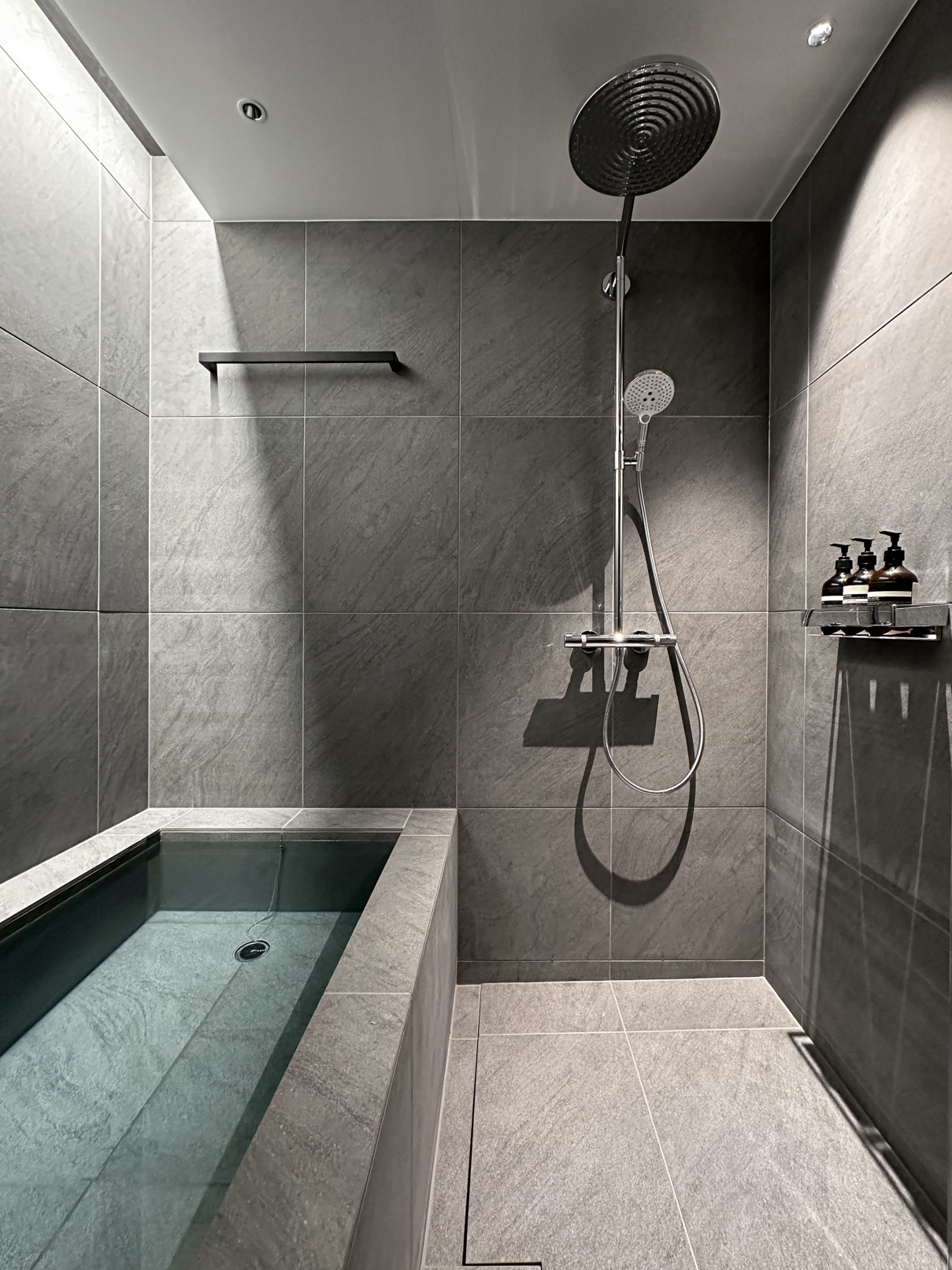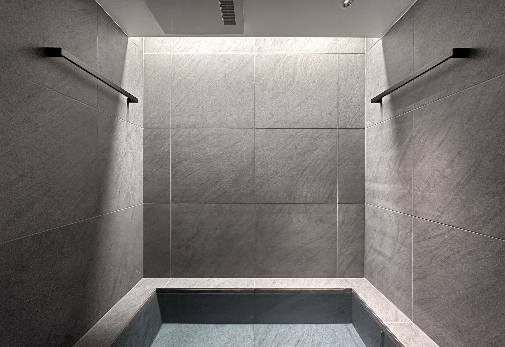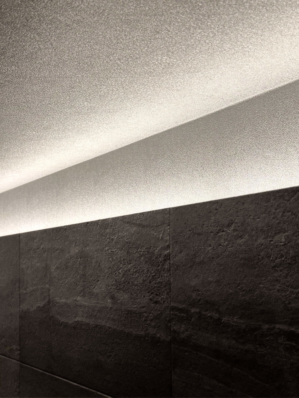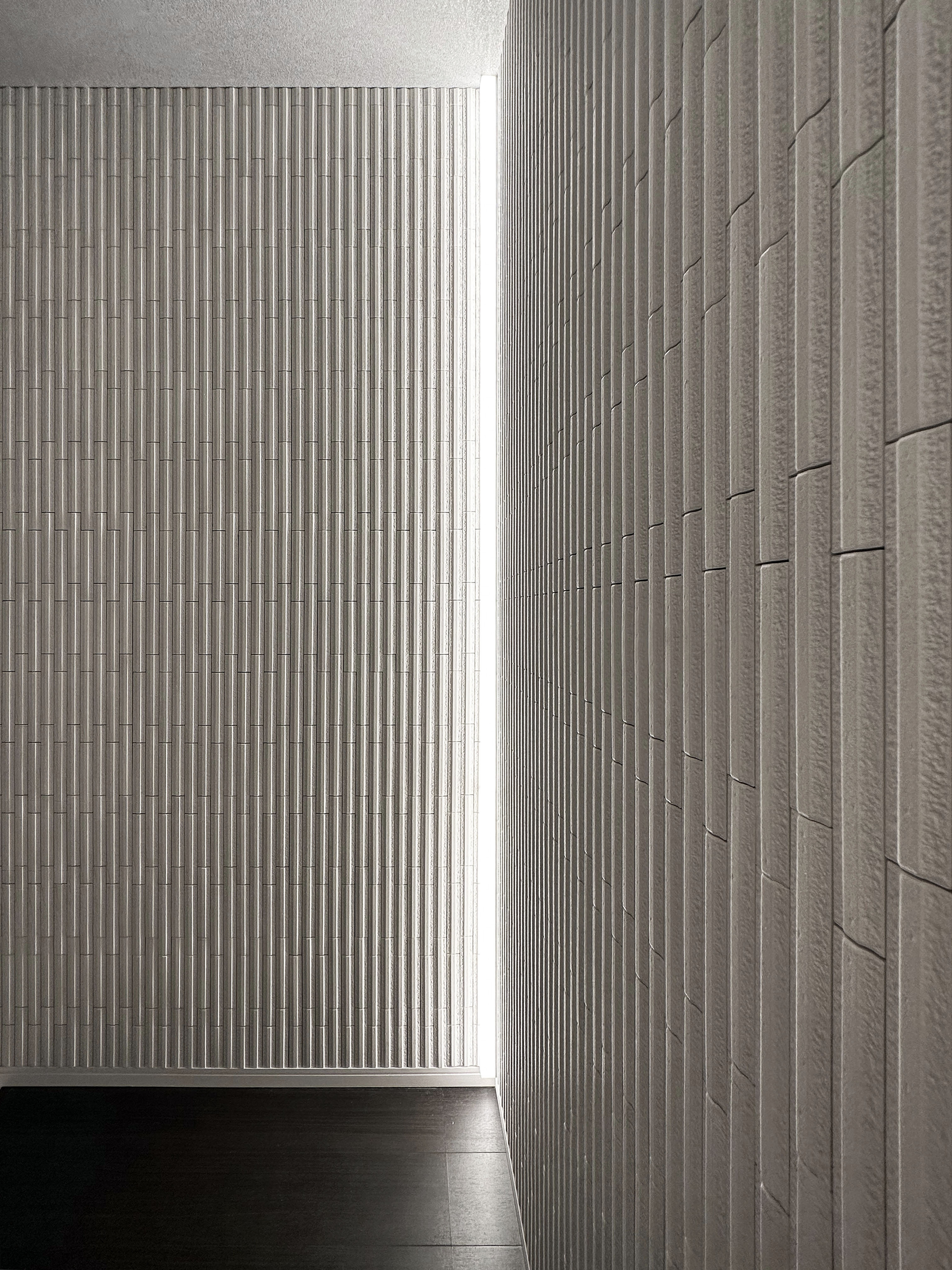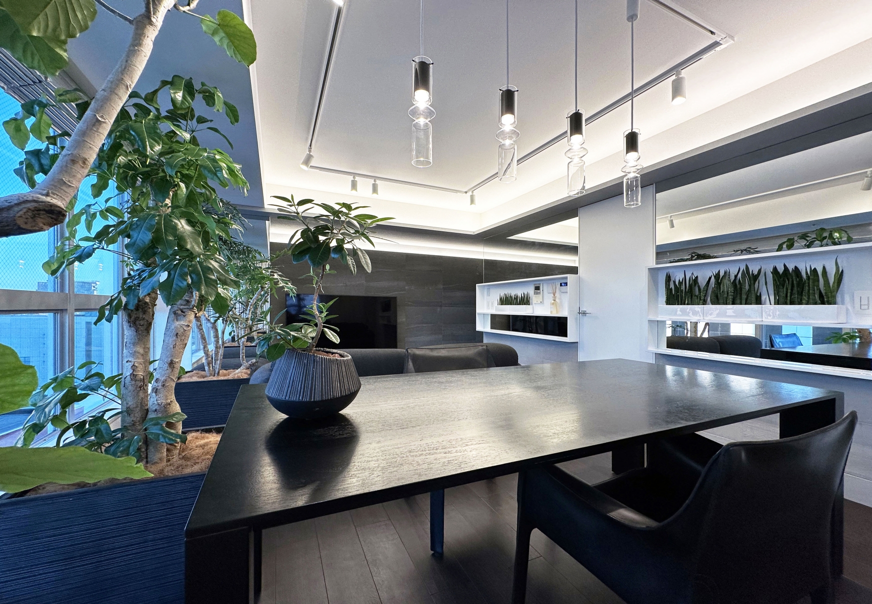 In the washroom, vertical line lighting flanking a sculptural basin creates a striking focal point, while ceiling ambient light and downlights add elegance and tension. In the living area, textured tiles reveal shadows under line lighting, enhancing depth and sophistication. Black-toned custom furniture contrasts with light, while foliage matched to ceiling height interacts with illumination to bring vibrancy.
