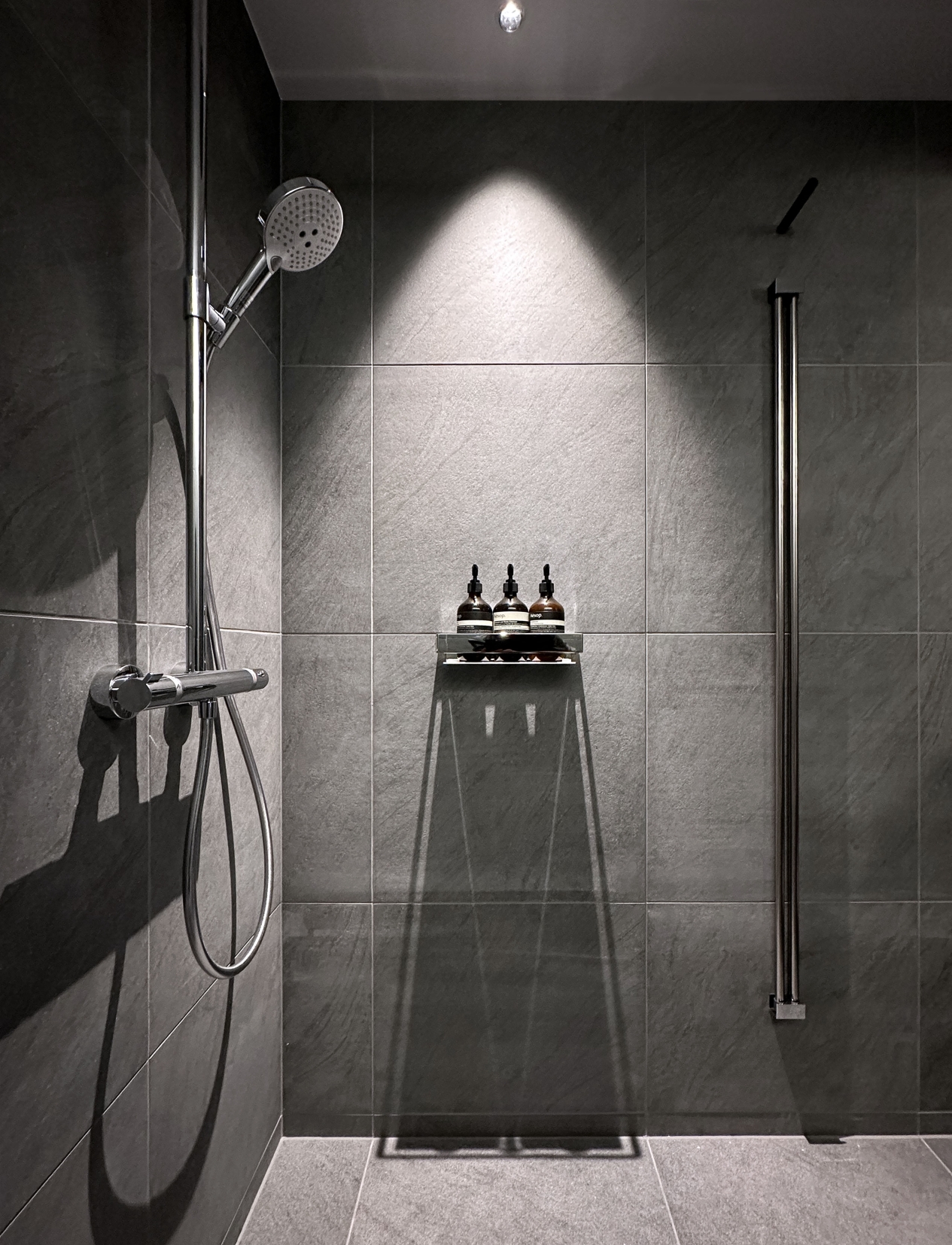 Lighting design prioritizes efficiency through LED line fixtures, downlights, and ambient ceiling lighting. Carefully placed, they deliver strong visual effect with minimal energy. Mirrors enhance sustainability by reflecting daylight and artificial light, reducing fixtures needed.