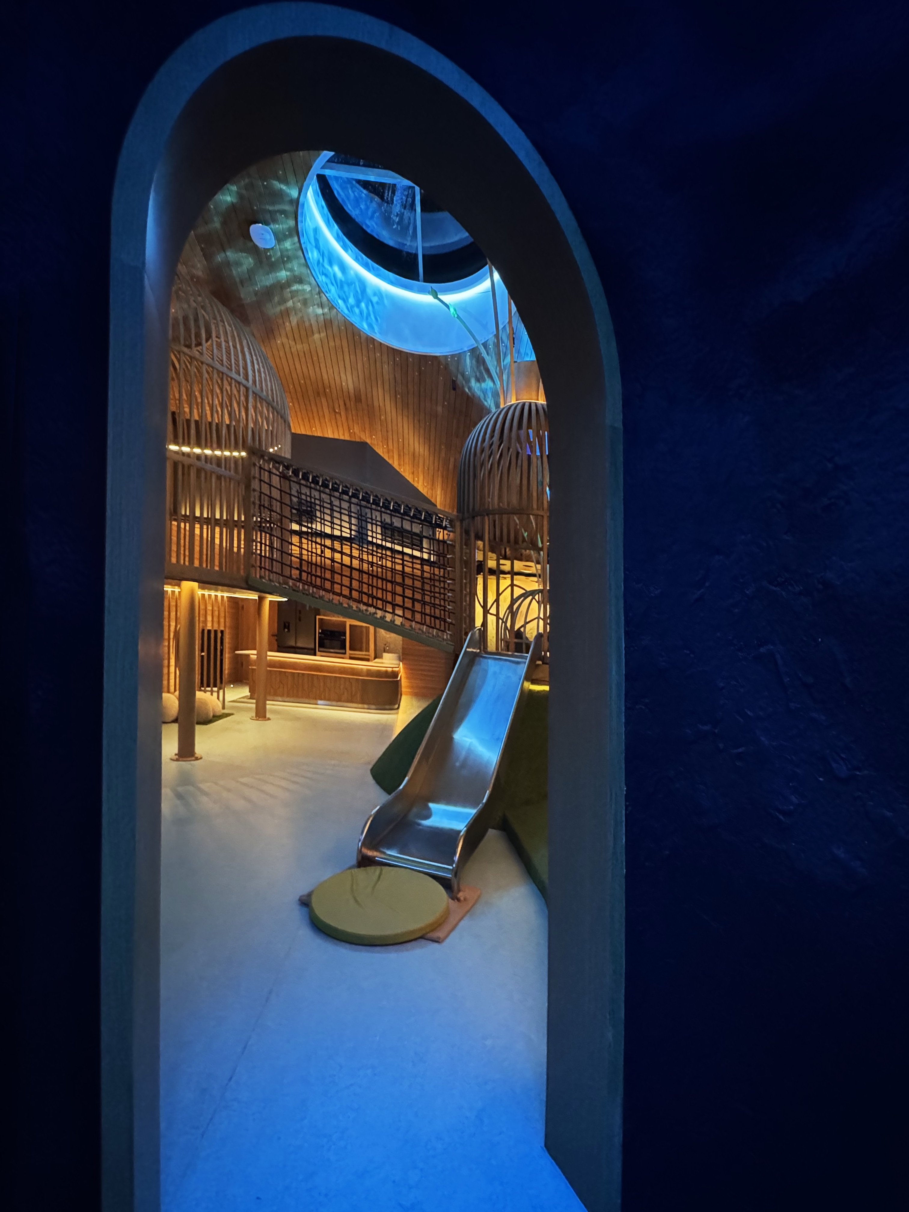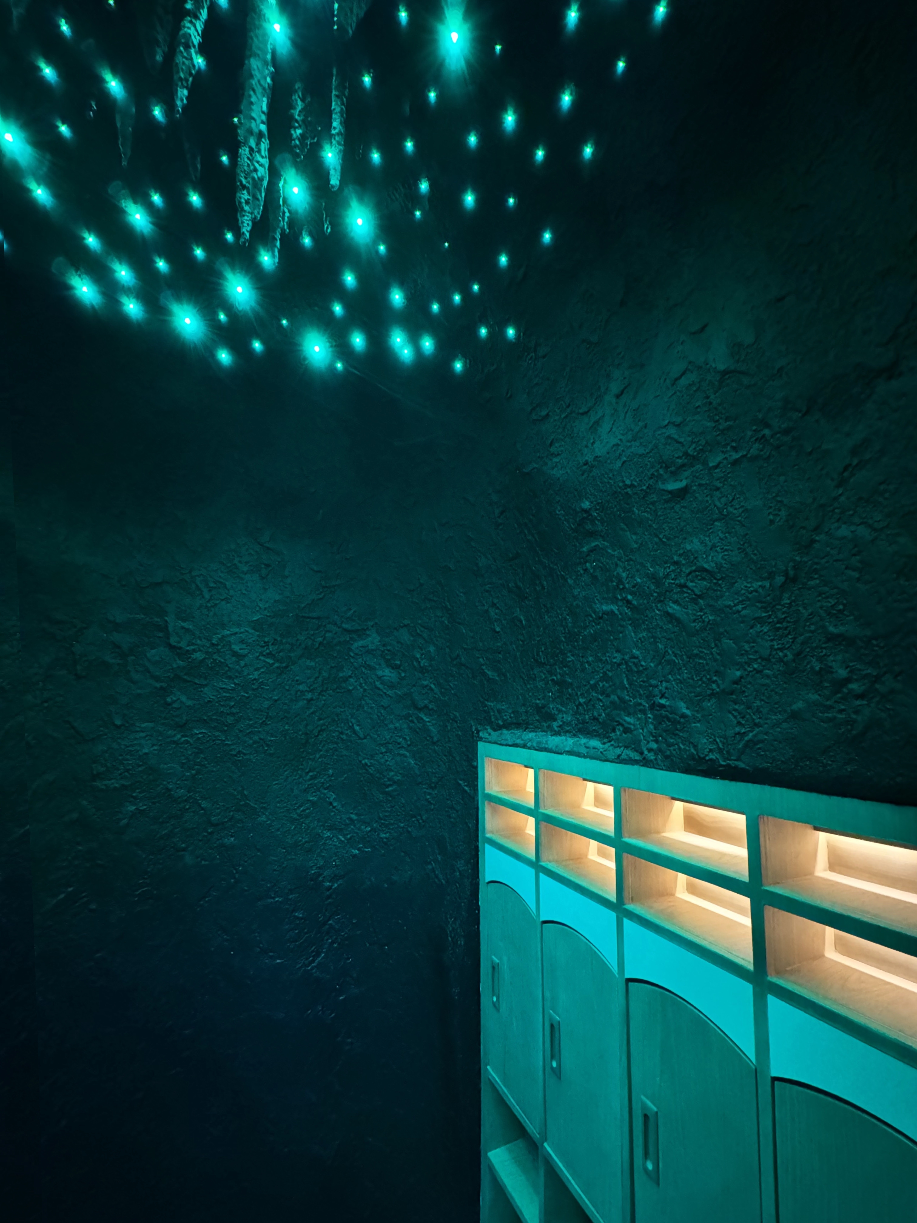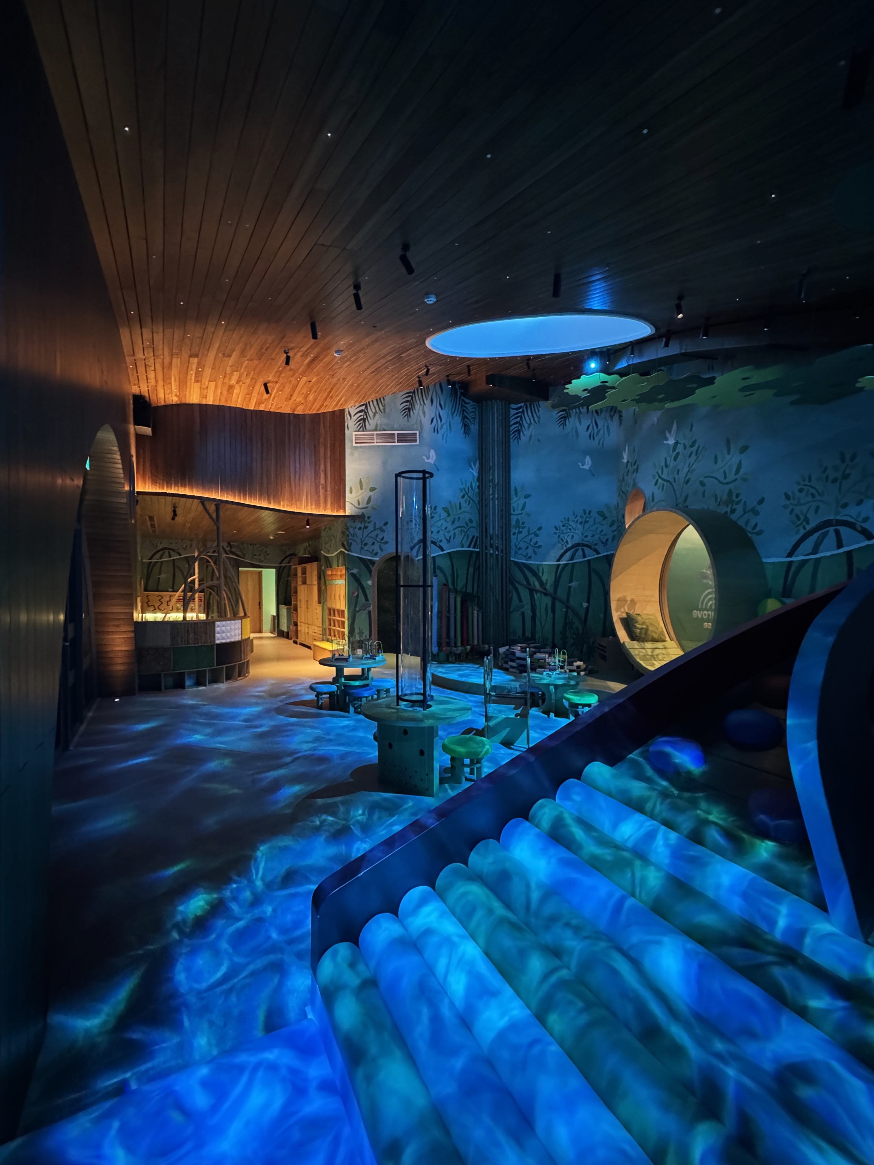 Soft, but dynamic lighting design effect using RGBW GOBO water effect projector create unreal underwater ambiance. Fiber Optics is used to create glow worm effect inside the cave" locker. And dynamic starry point light throughout the indoor ceiling in the playground are some presented design ideas to provide immersive ambiance for the kids club. And the experience is not only stopped indoor, but also outdoor. All with highest concern that all lighting fixtures should be securely & safely installed for kids & their families to play.