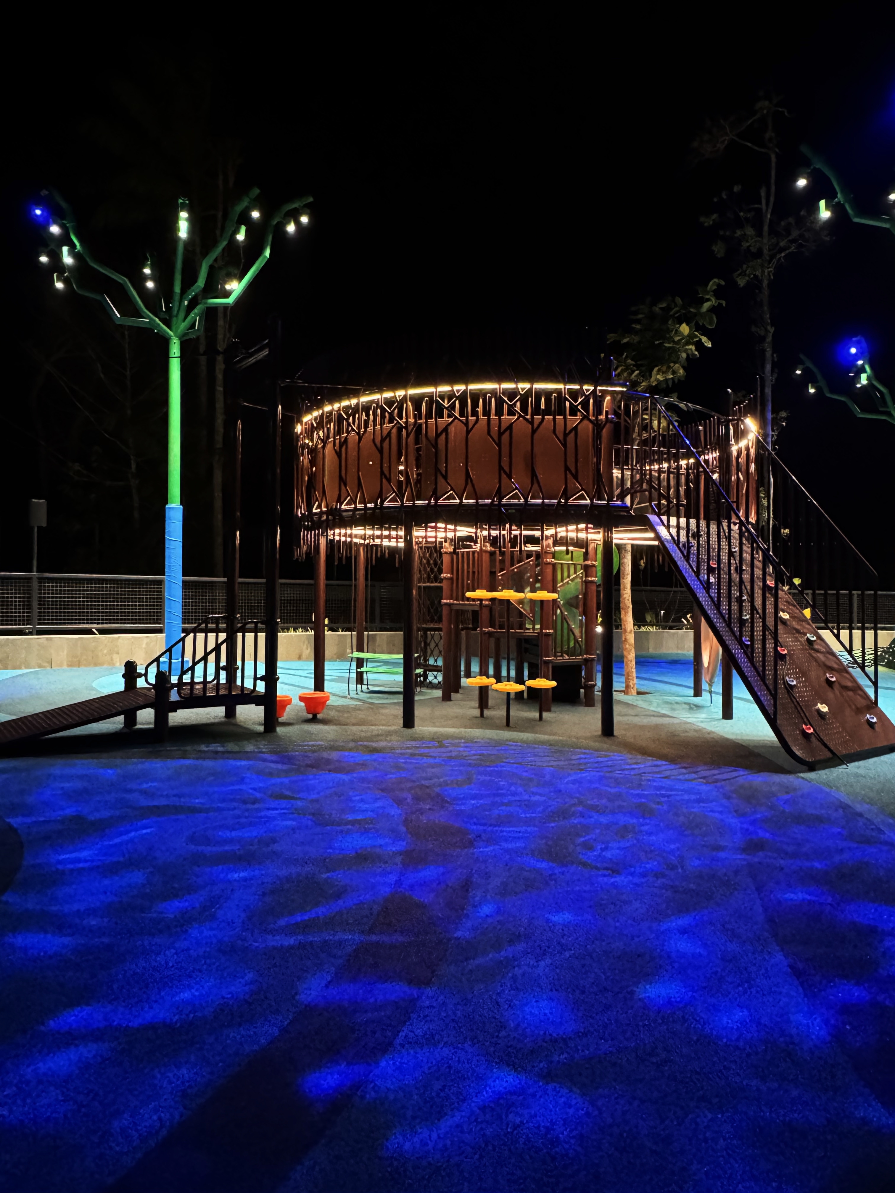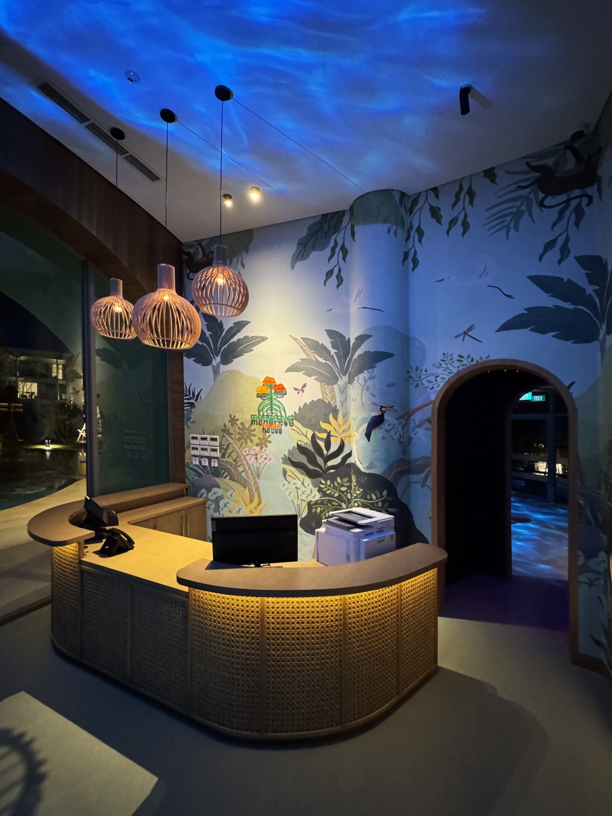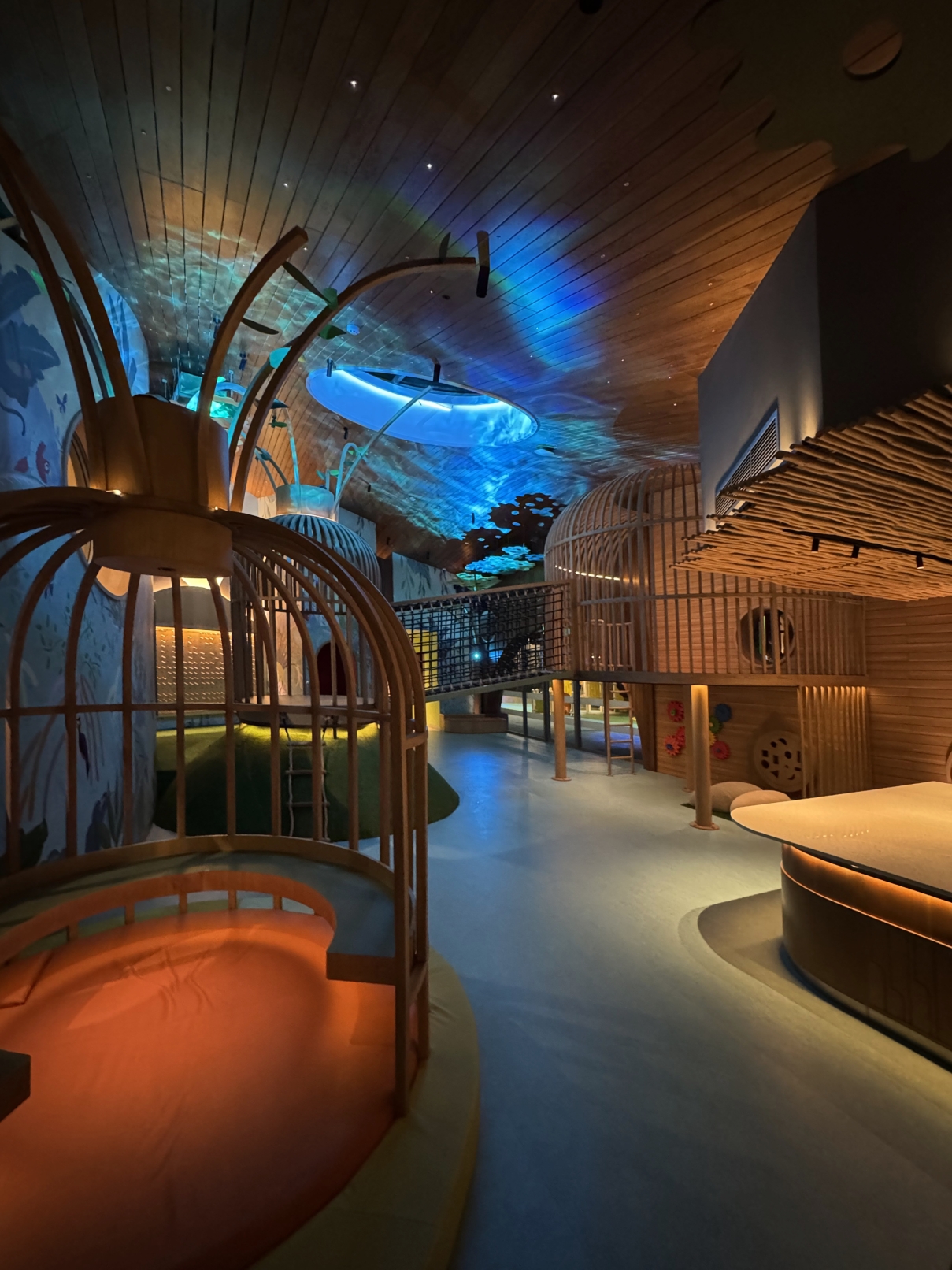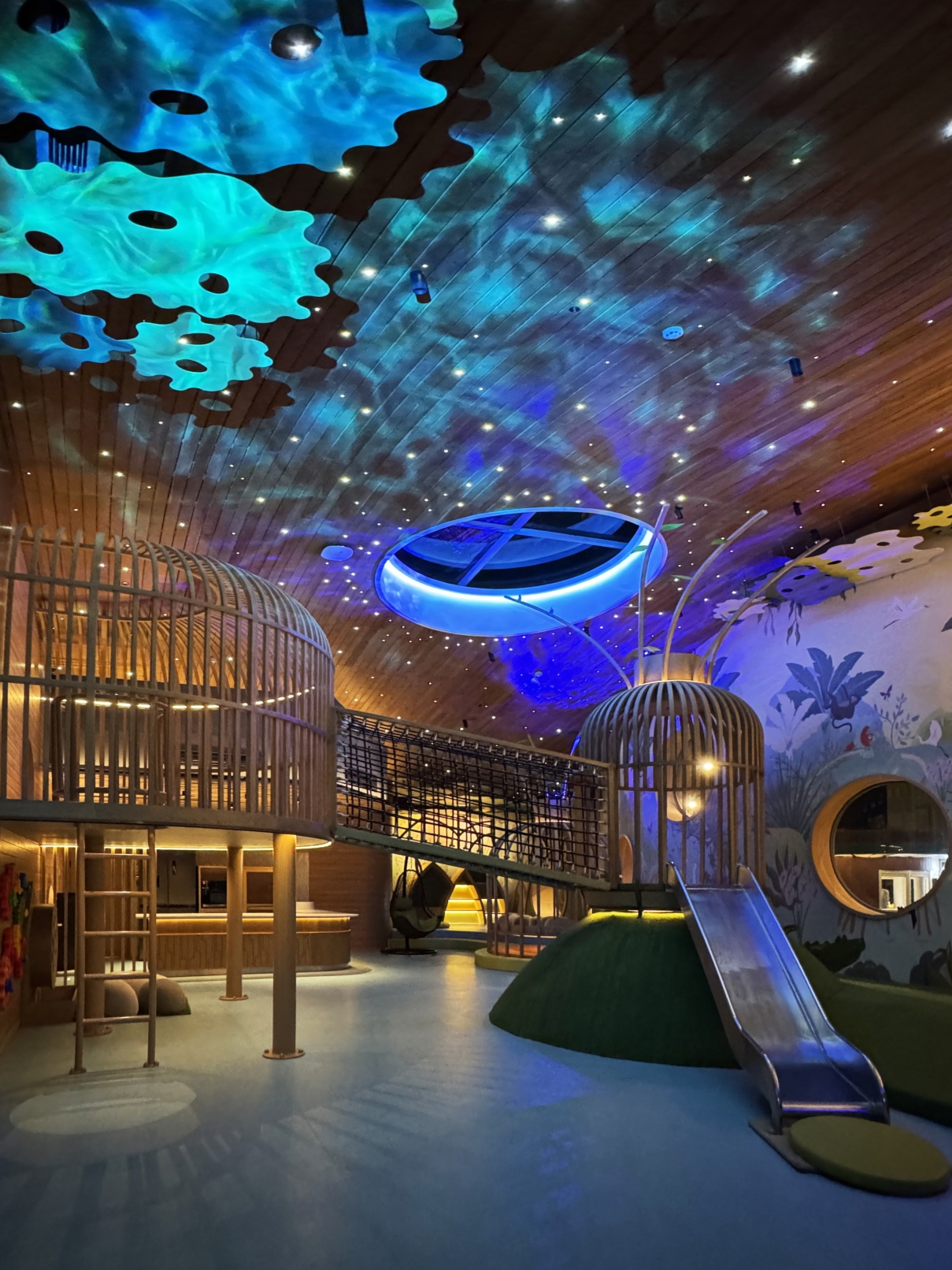 Soft, but dynamic lighting design effect using RGBW GOBO water effect projector create unreal underwater ambiance. Fiber Optics is used to create glow worm effect inside the cave" locker. And dynamic starry point light throughout the indoor ceiling in the playground are some presented design ideas to provide immersive ambiance for the kids club. And the experience is not only stopped indoor, but also outdoor. All with highest concern that all lighting fixtures should be securely & safely installed for kids & their families to play.