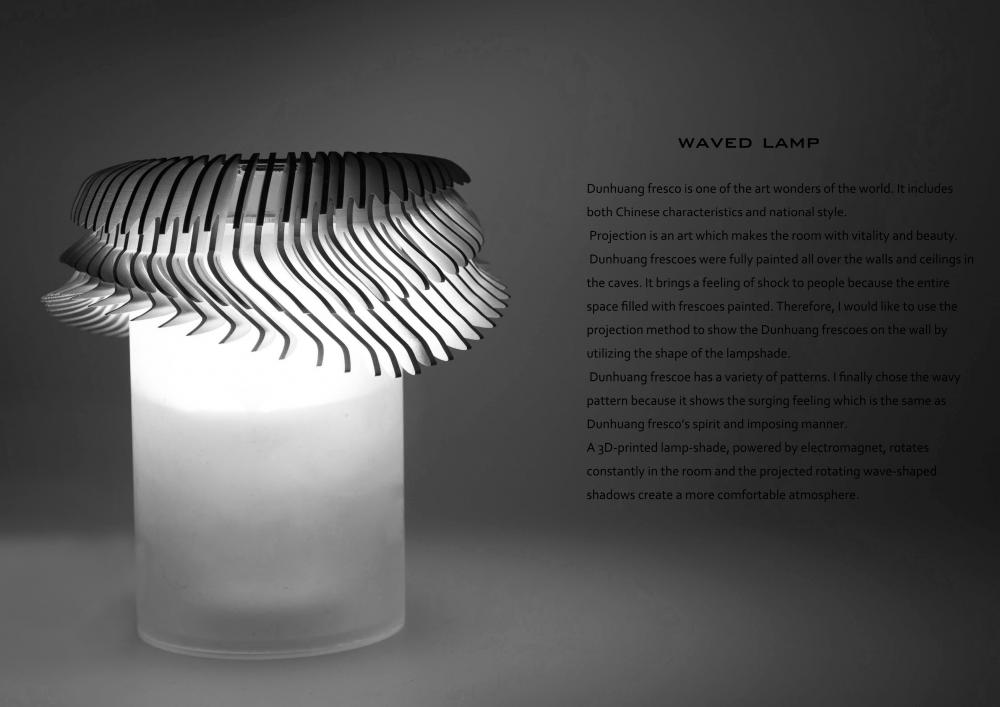 A 3D-printed lamp-shade, powered by electromagnet, rotates constantly in the room and the projected rotating wave-shaped shadows create a more comfortable atmosphere.