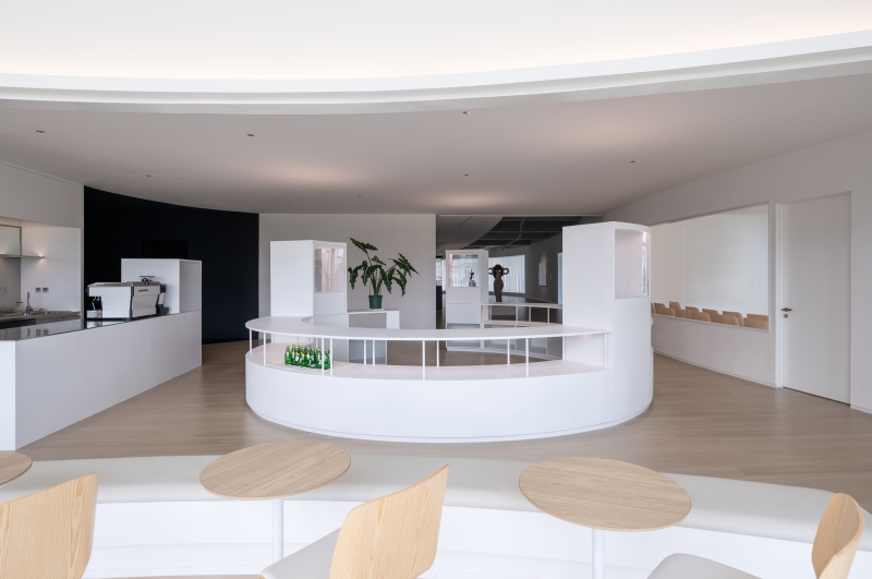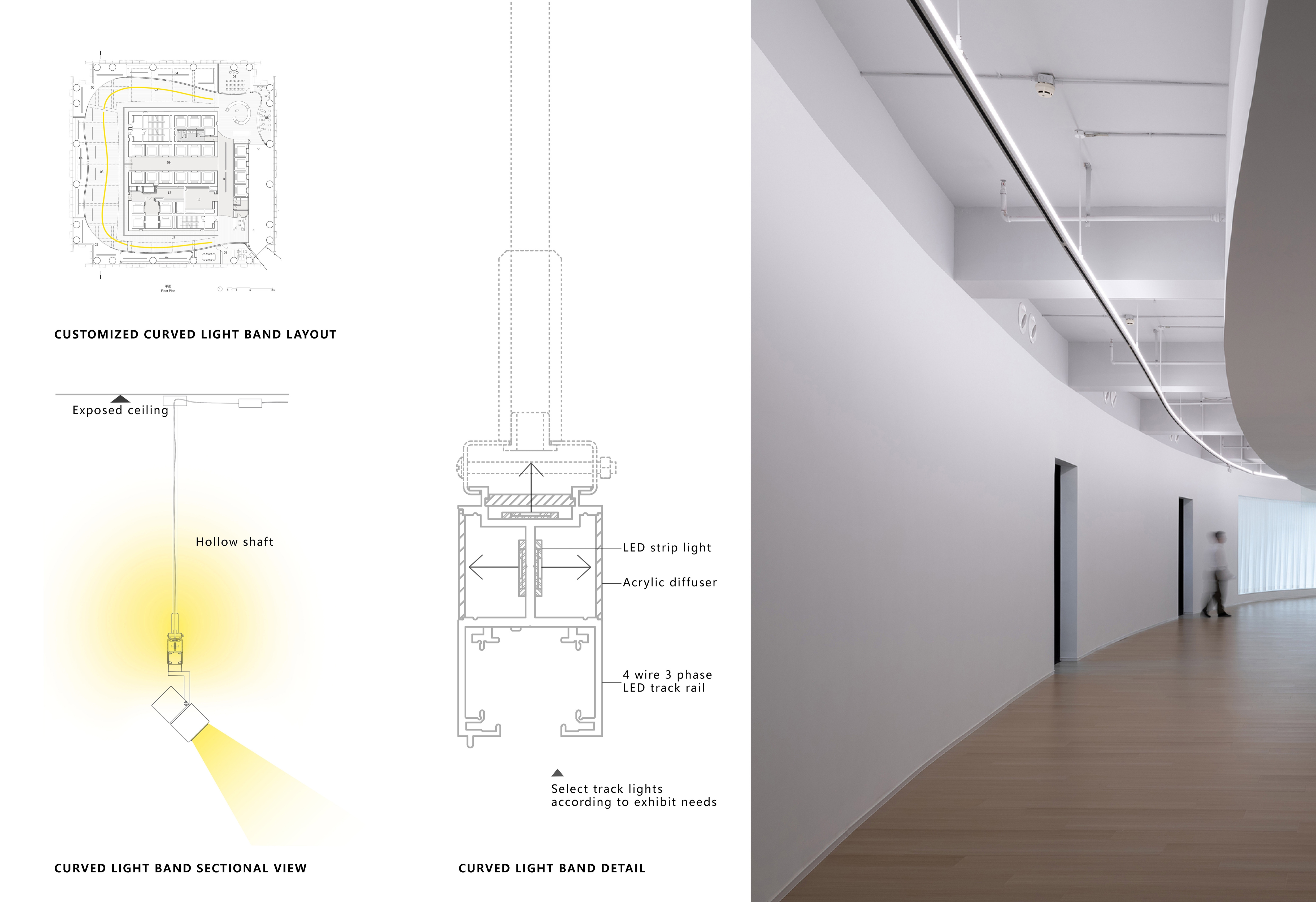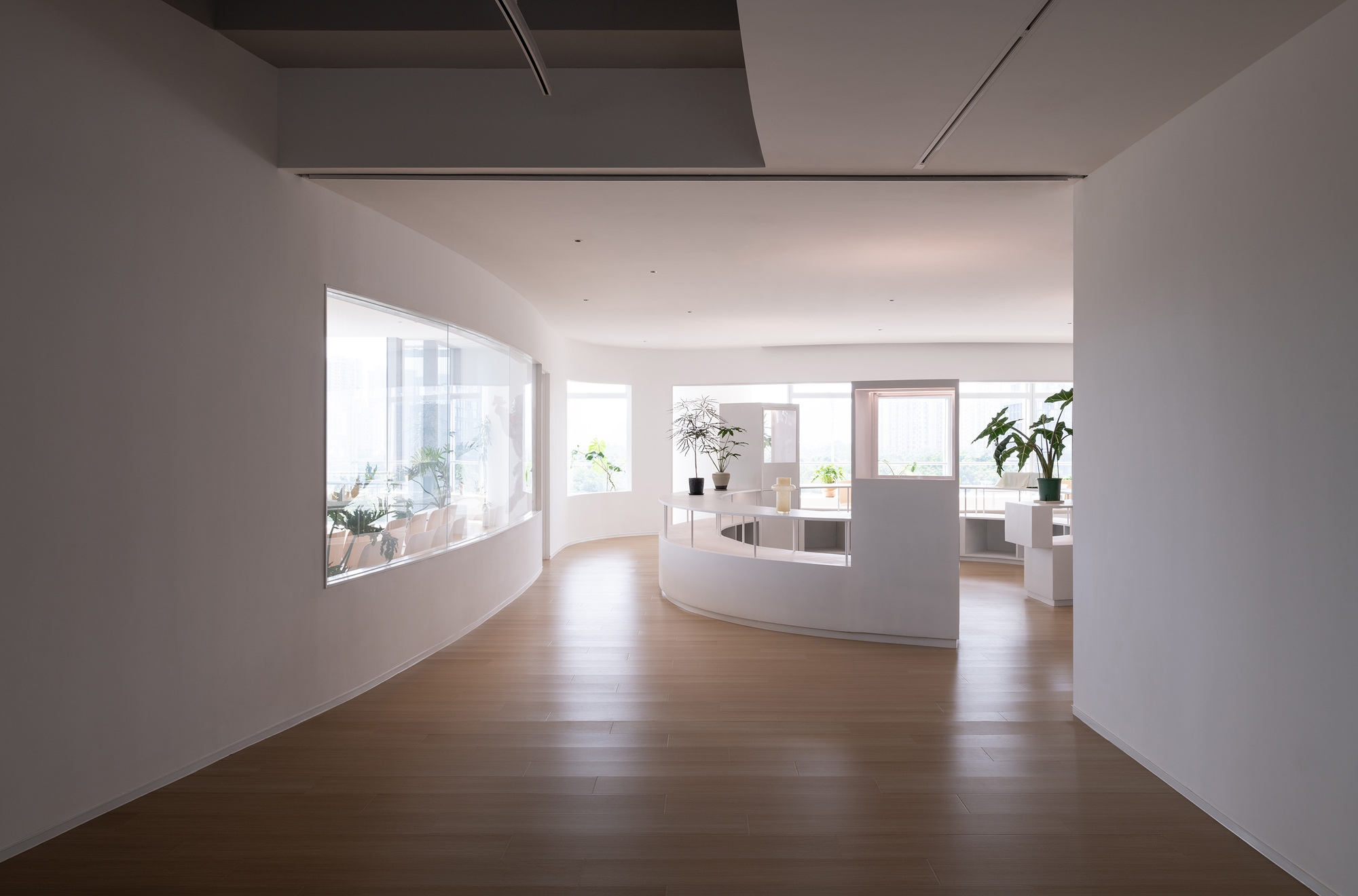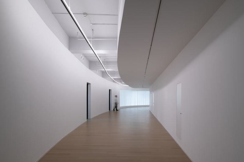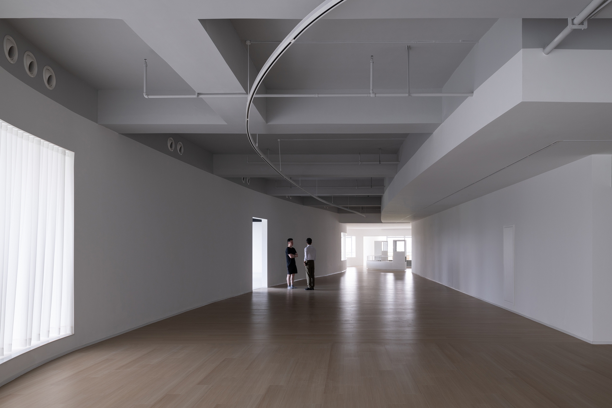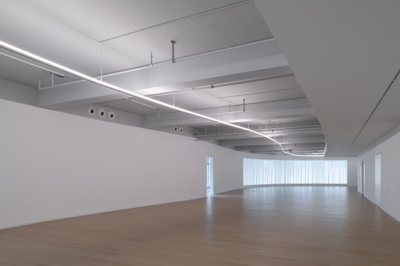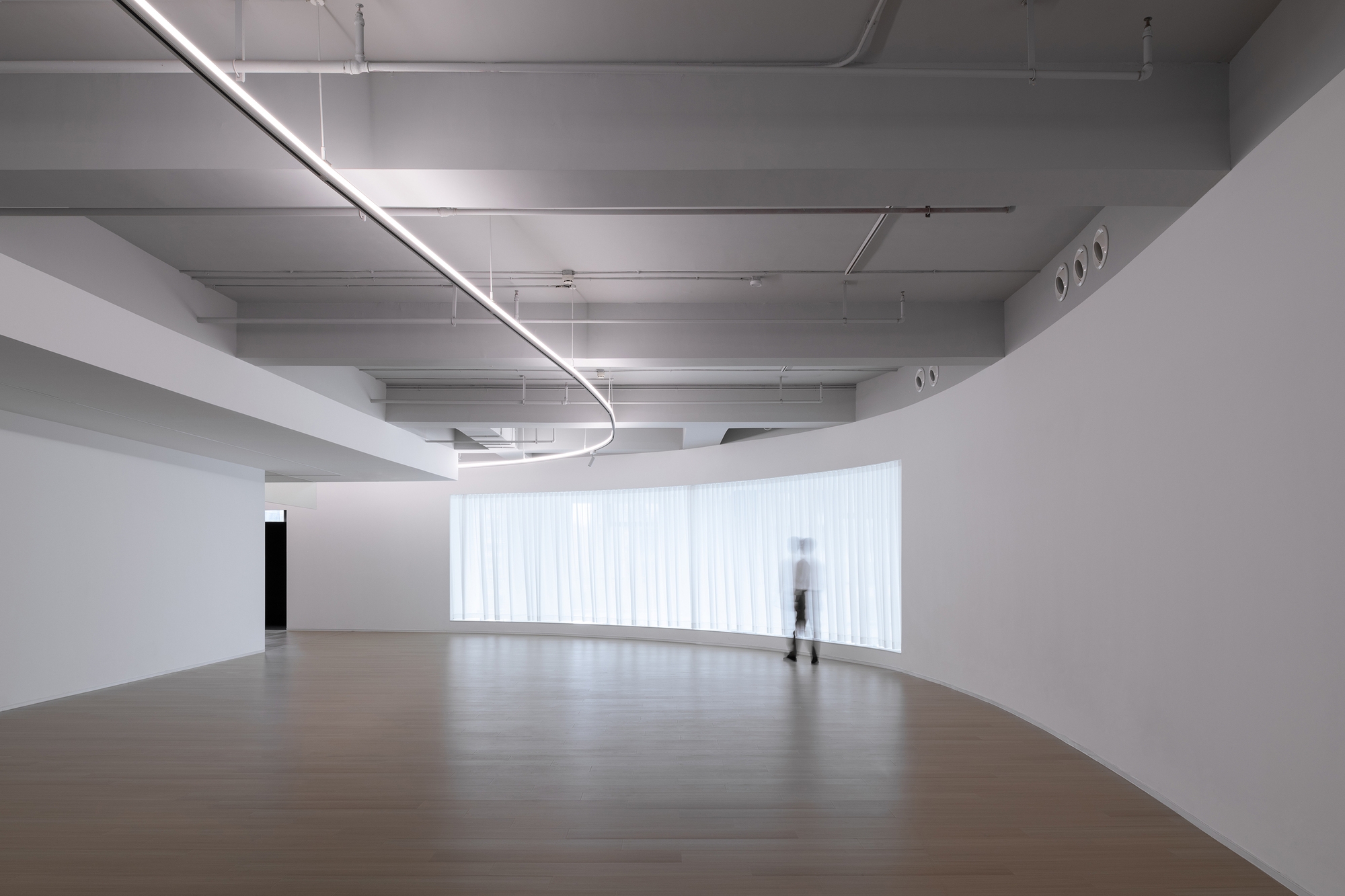 Hong Museum in Wenzhou Zhixin Plaza is an experimental art space blending sociology and contemporary art. Its U-shaped main hall features flowing curved walls around structural cores, enhanced by a custom arc-shaped light band. This integrated lighting combines diffused illumination with a functional track system, harmonizing exhibition and ambient light while guiding visitors through the dynamic space.