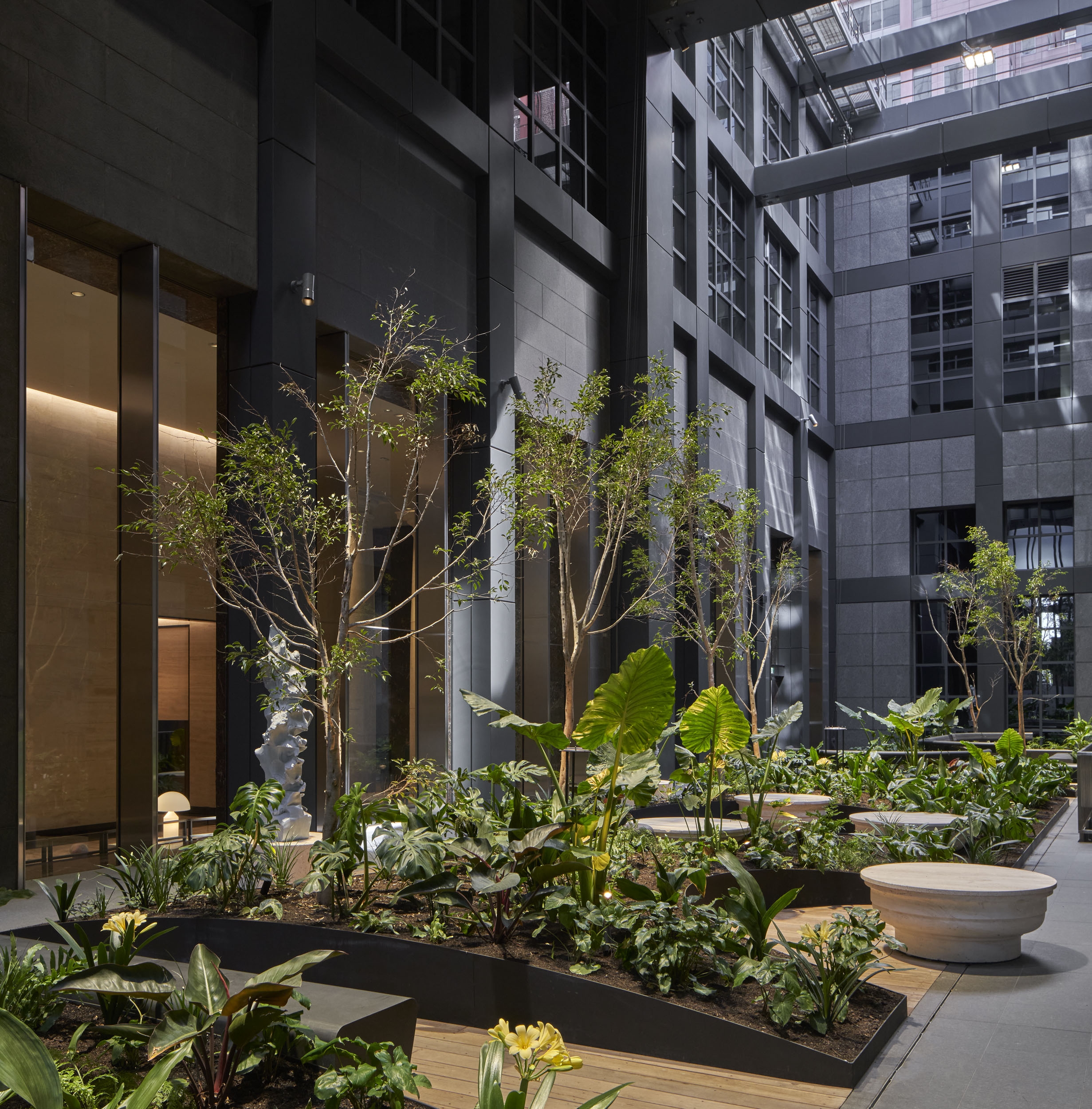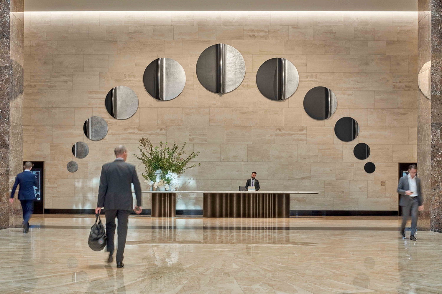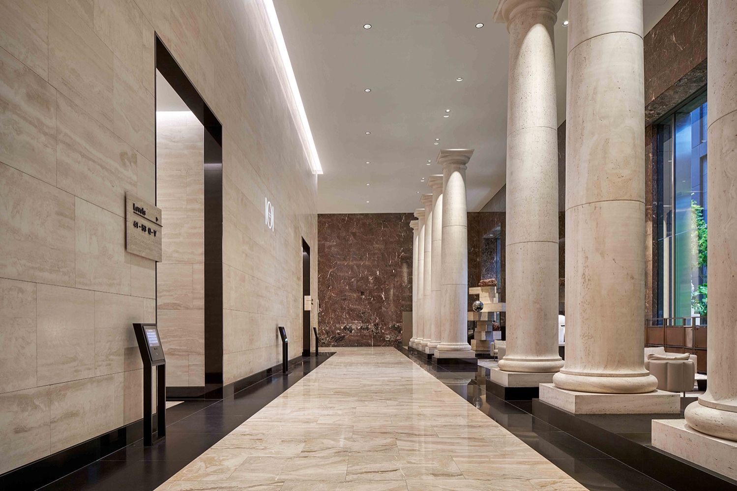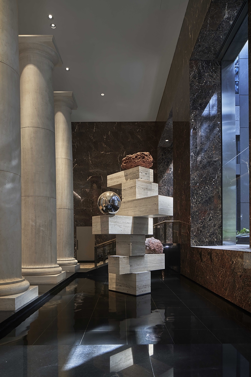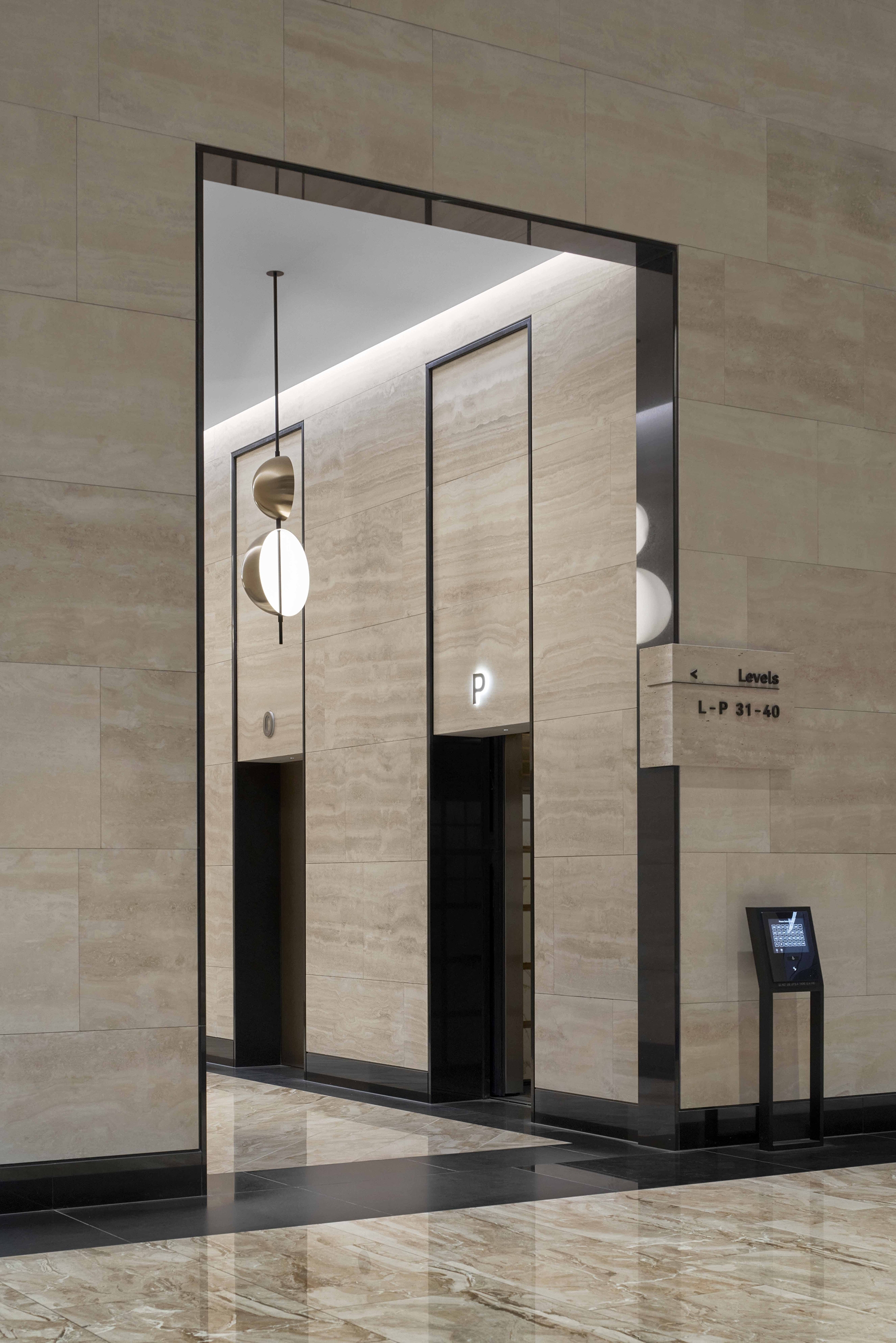 The lighting sought to facilitate a clear path of travel, provide highlights to the lounge, & direct attention to the columns & impressive core wall. We moved away from general wall washing & introduced a skylight effect at the top of the wall which would better express the signature artwork while still providing some soft illumination to the stone, and giving the lobby a fresher and more dynamic feel, as it could change in colour temperature from day to evening.