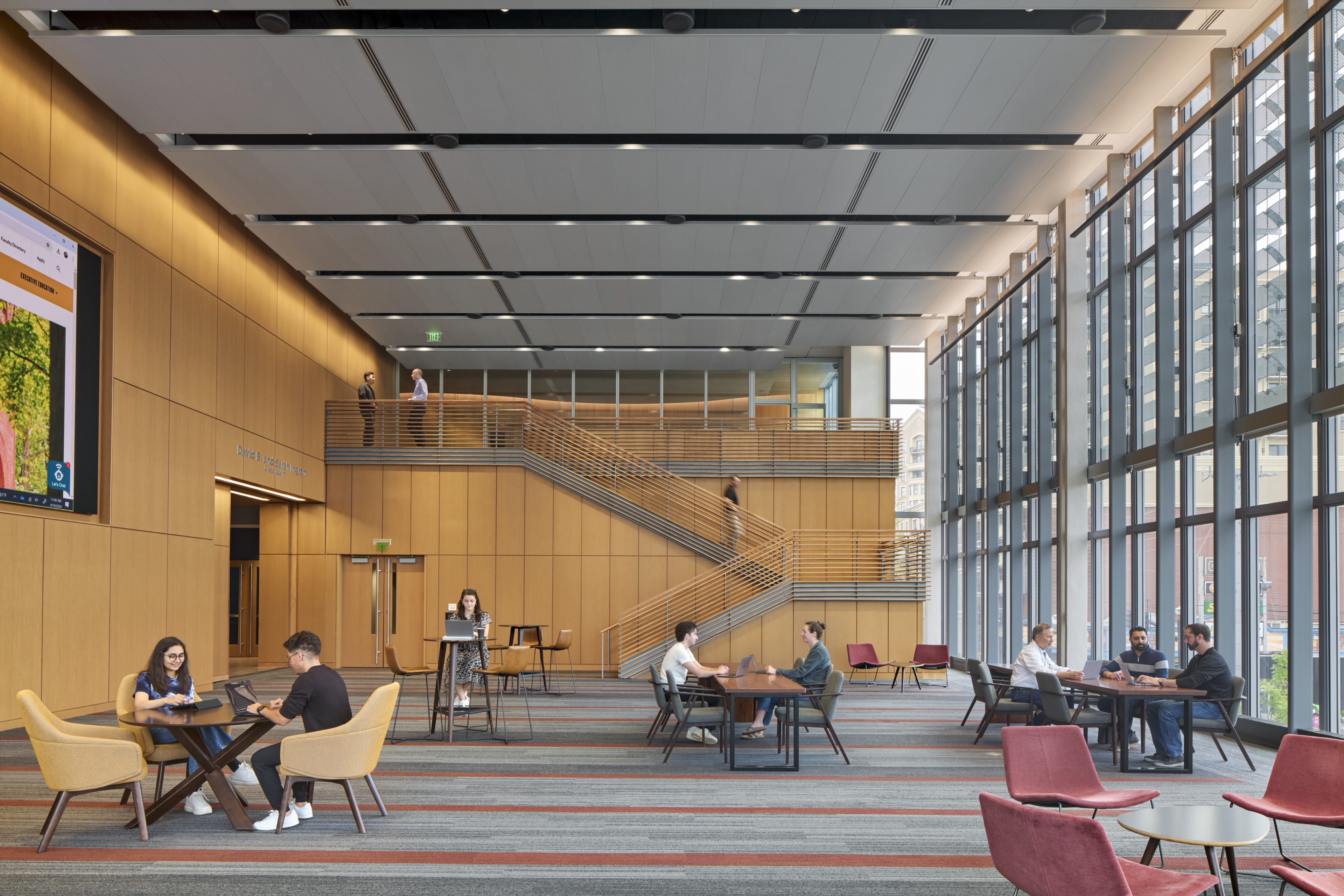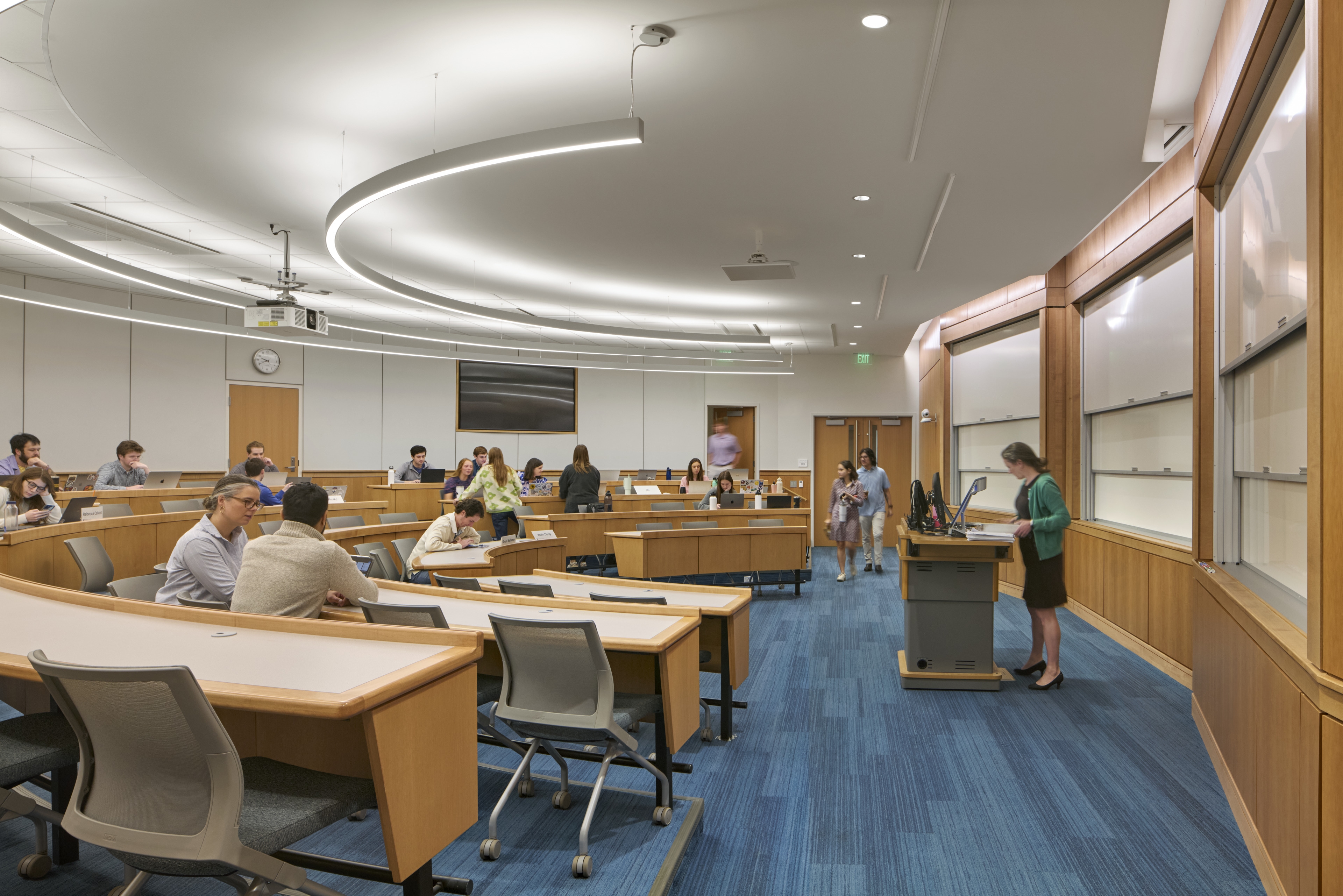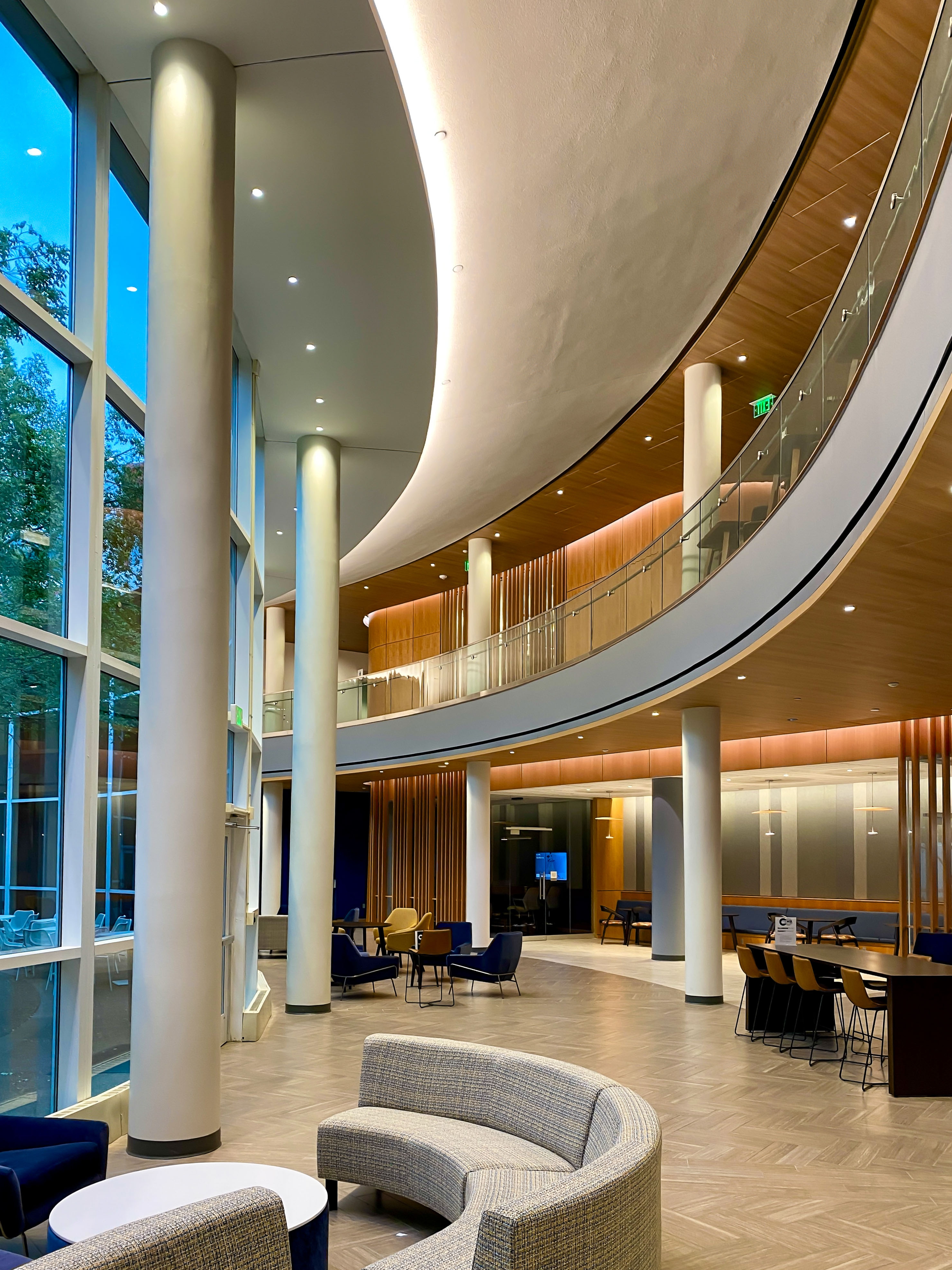 Students experience a range of lighting environments—from the soft, inviting glow of the atrium lounge to glare-free meeting rooms designed for focus and comfort. Classrooms feature layered lighting and intuitive controls that support flexible teaching modes.