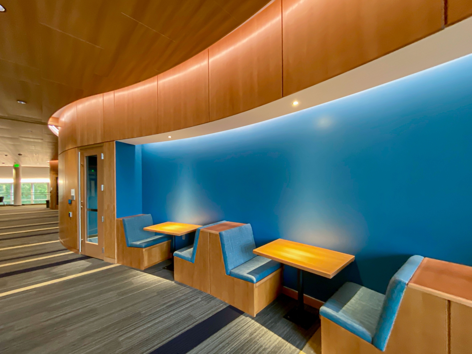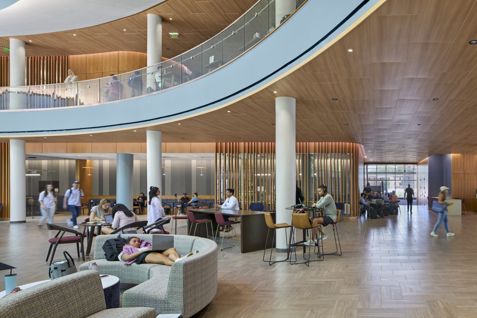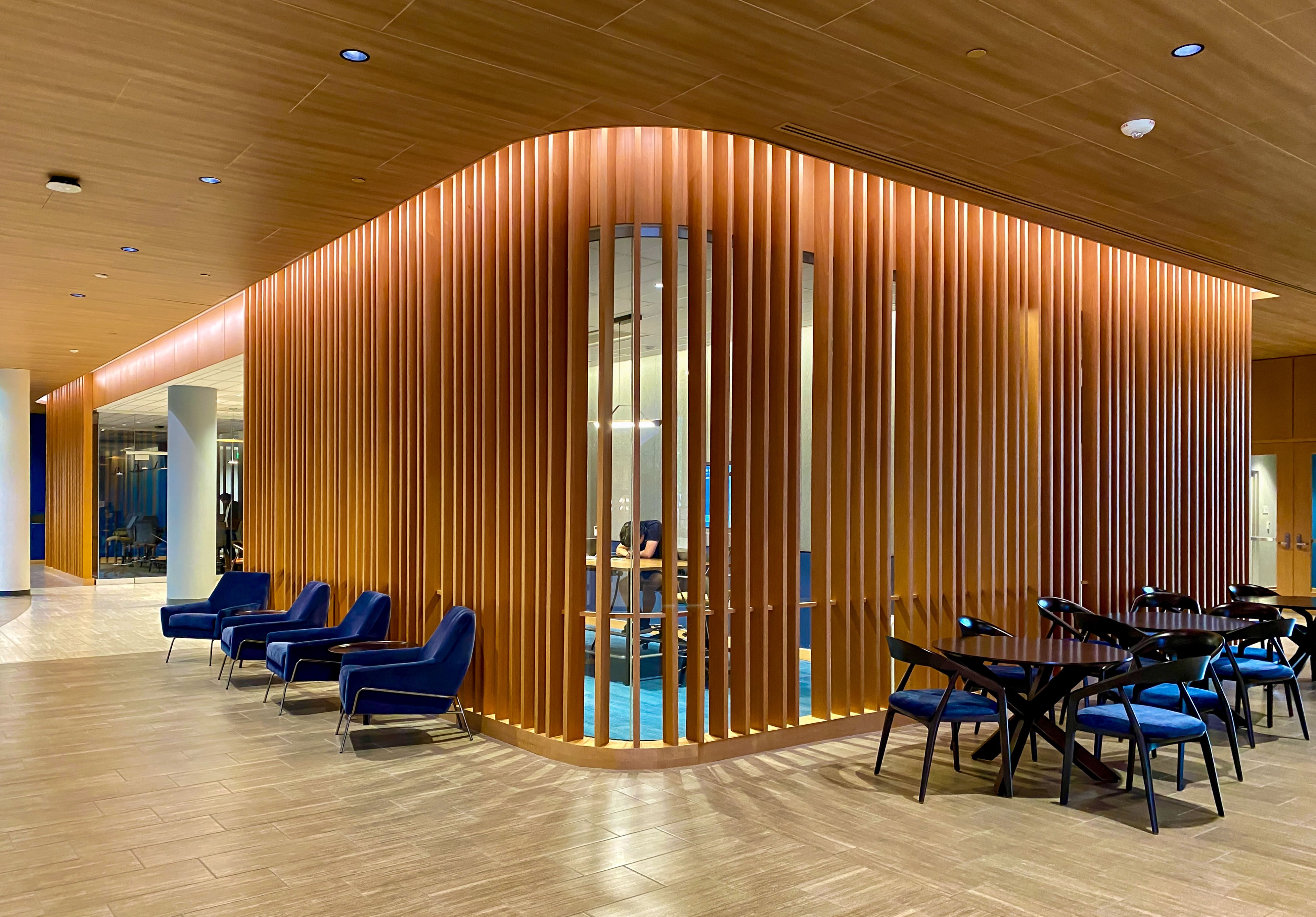 Designers defined areas of collaboration and study as “luminous destinations,” using integrated, concealed lighting within wall slots and coves to accentuate curving architectural forms. These glowing focal points are unified by a warm wood ceiling, creating visual connection and flow. Neutral downlights provide efficient, cost-effective illumination, allowing these destinations to stand out within the connection zones.
