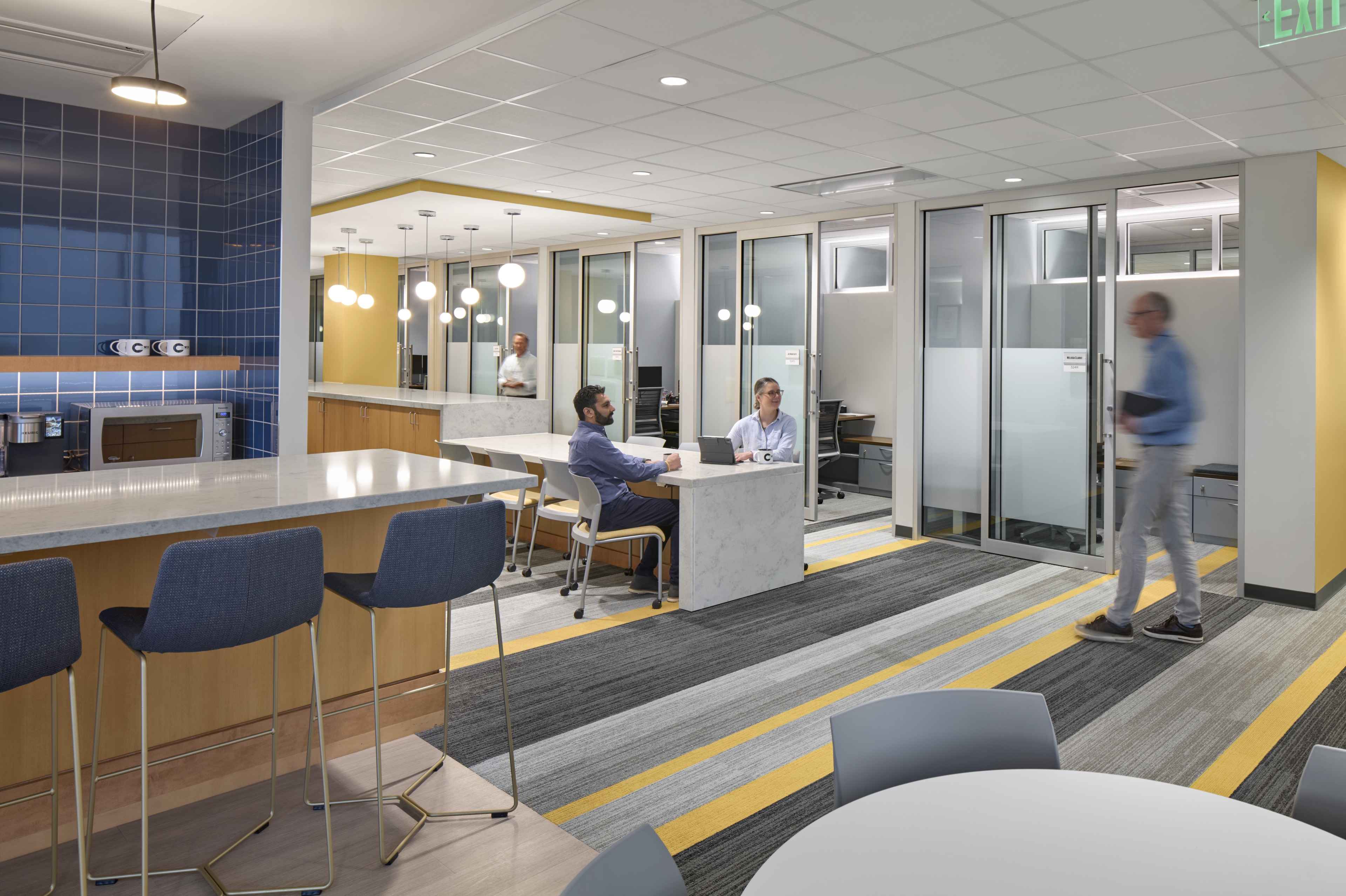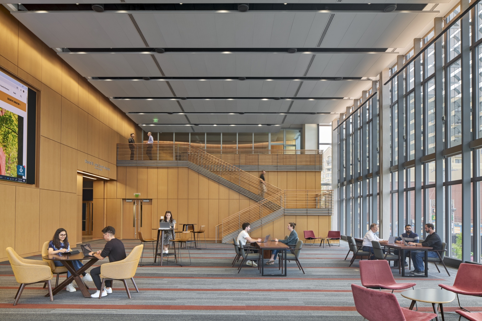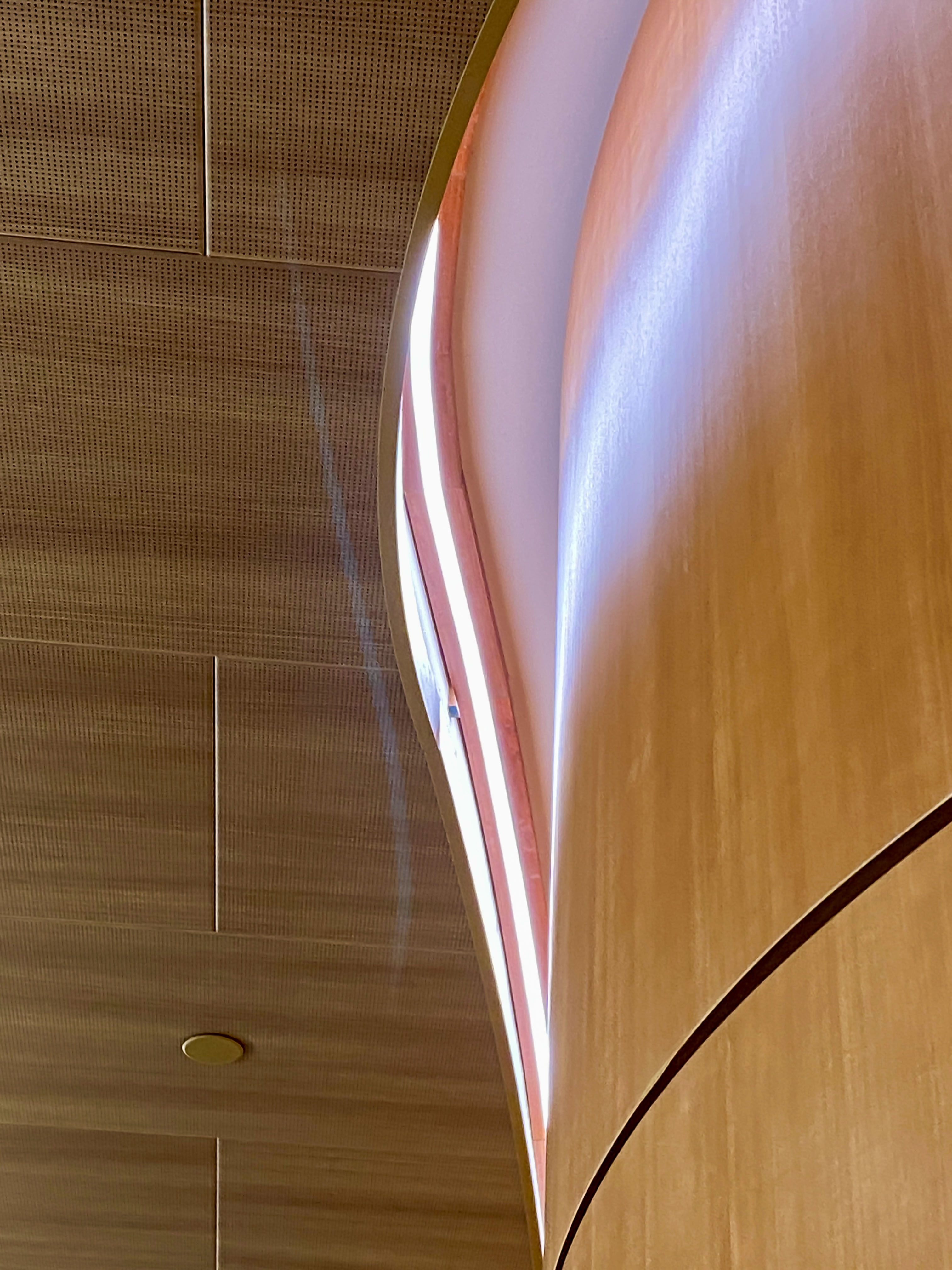 Designers defined areas of collaboration and study as “luminous destinations,” using integrated, concealed lighting within wall slots and coves to accentuate curving architectural forms. These glowing focal points are unified by a warm wood ceiling, creating visual connection and flow. Neutral downlights provide efficient, cost-effective illumination, allowing these destinations to stand out within the connection zones.
