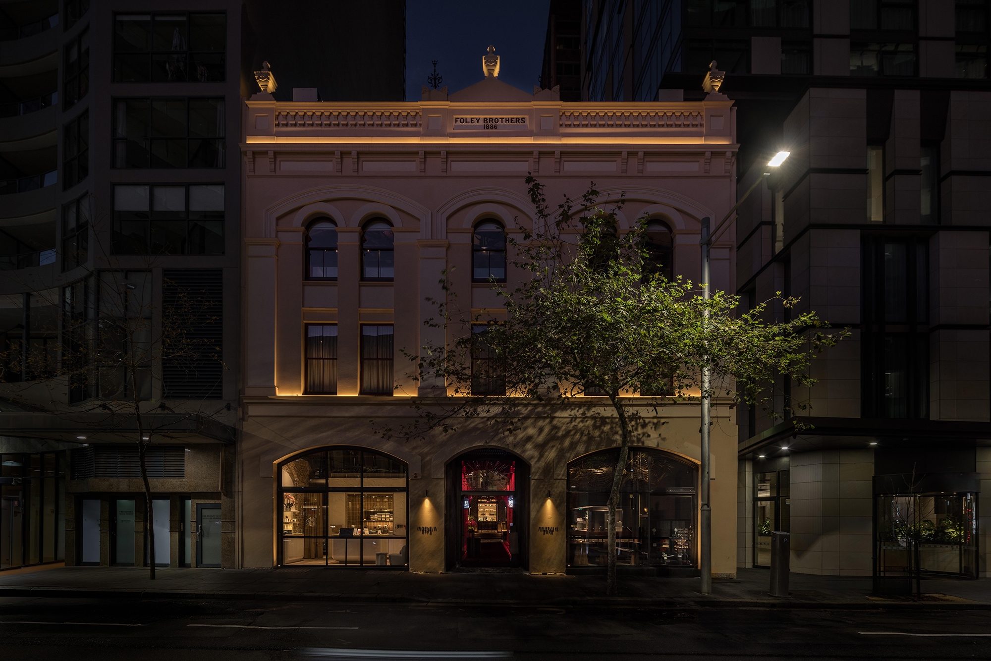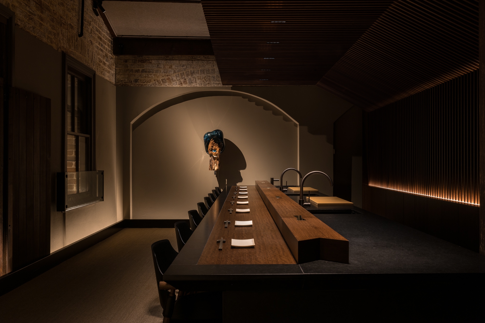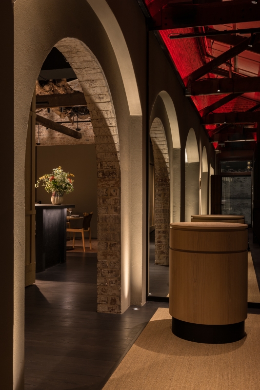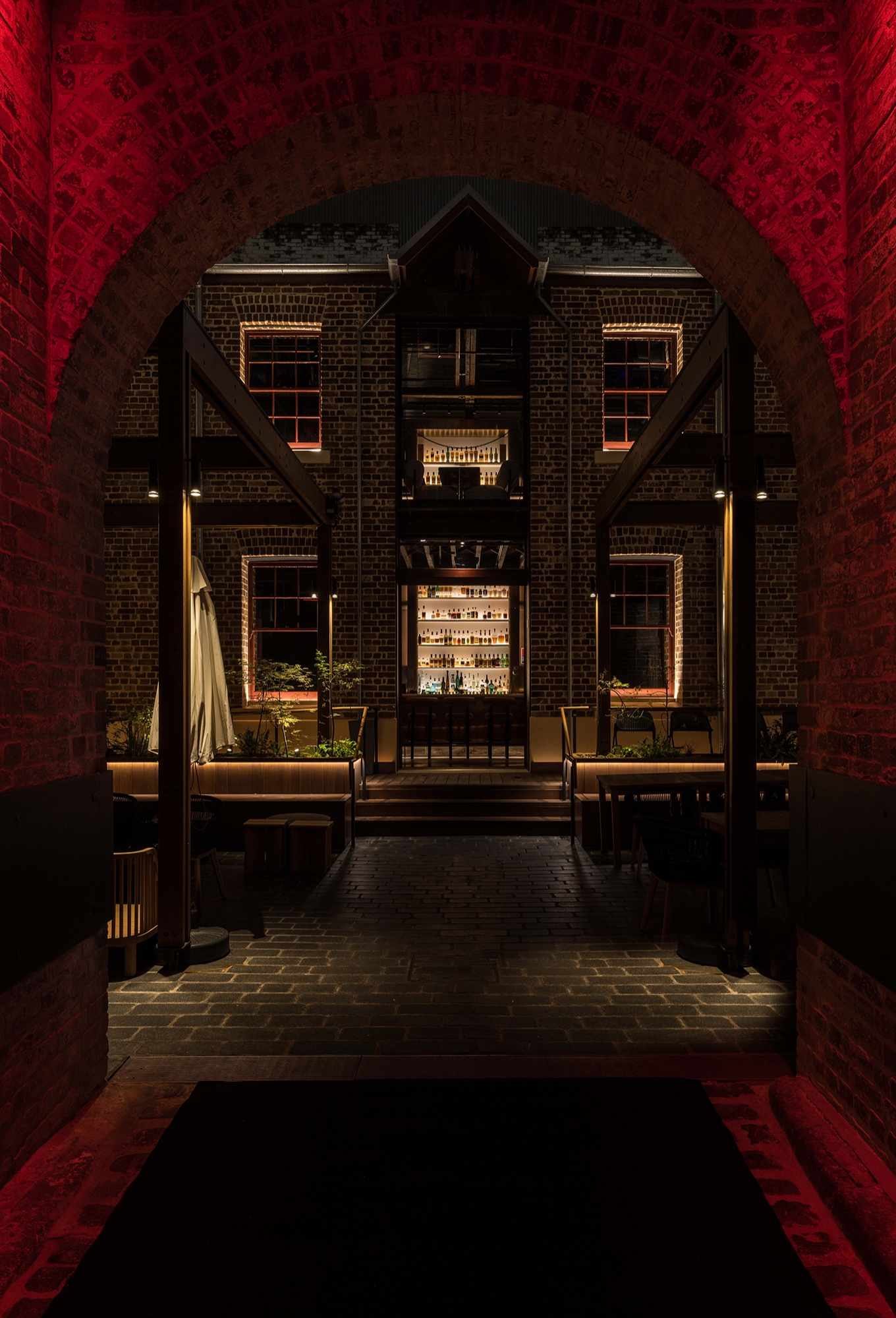 A restrained delivery of light to express the heritage structure was applied to blur the lines between colonial architecture & Japanese theatre. Red light grazes the walls, capturing the texture of the heritage brickwork & providing an introduction to the themed lighting concept. Numerous displayed artworks feel both part of the venues & stunning interventions in their own right, brought to life through integrated accenting, visual layering & the in-between subconscious relief of light.