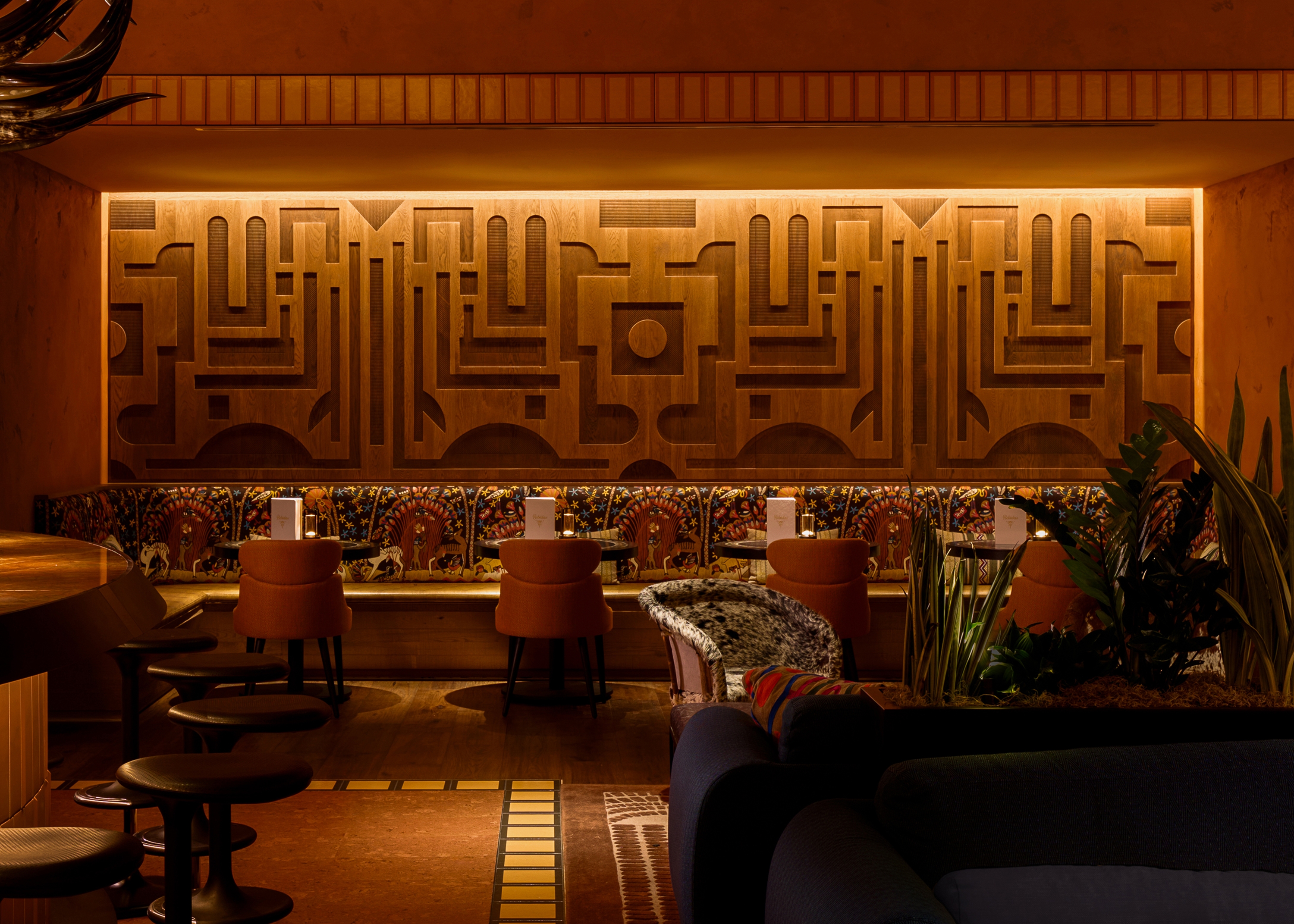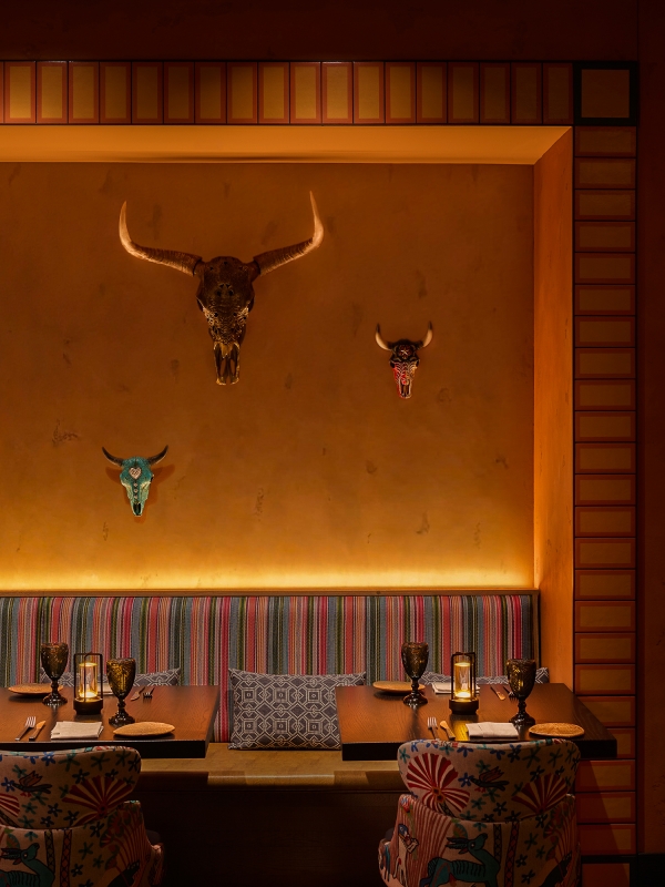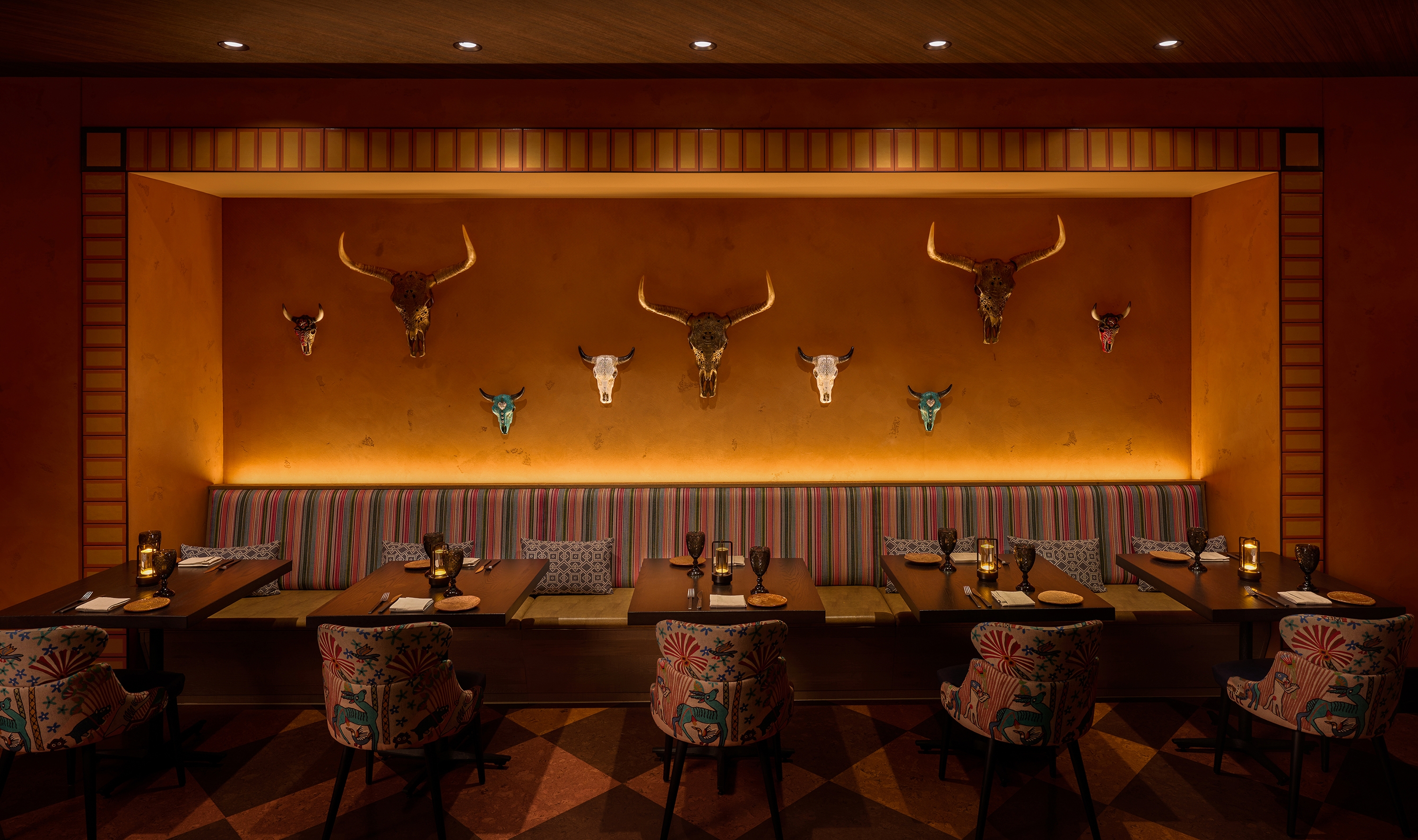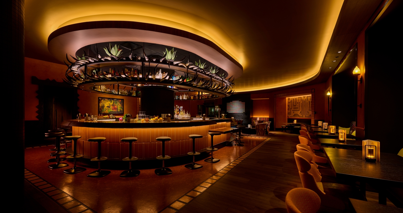 Linear lighting embedded in ceiling pop-ups highlights the elegant curves around the central bar drawing attention to it, where internally lit hanging shelves create a striking display of liquor. Cove lights in seating niches graze the wood wall carvings, emphasizing their geometric motifs, while linear LED tape behind the banquettes uplights the textured stucco and illuminate hanging bull masks.