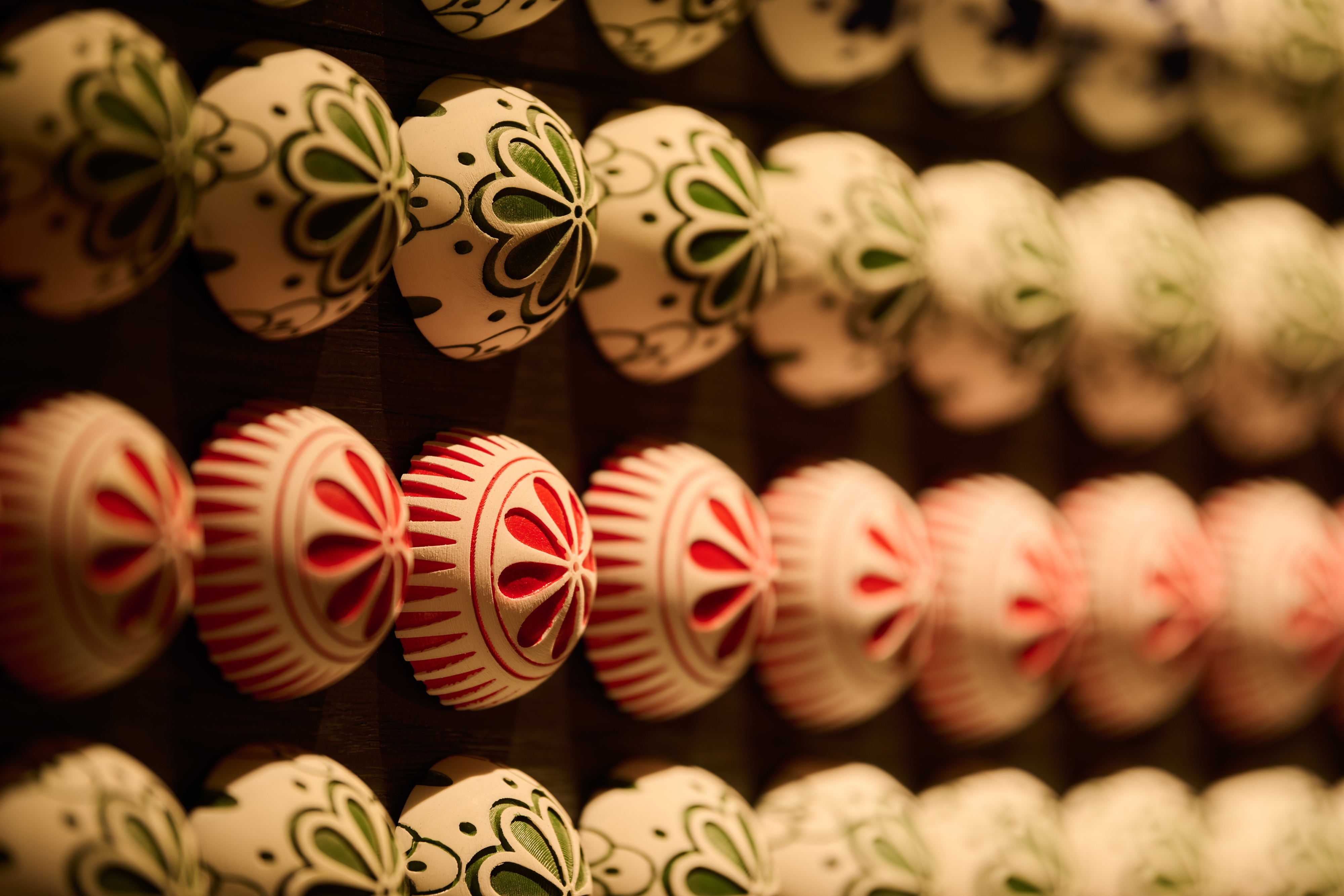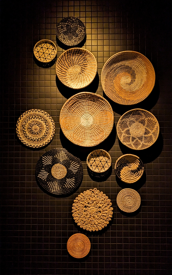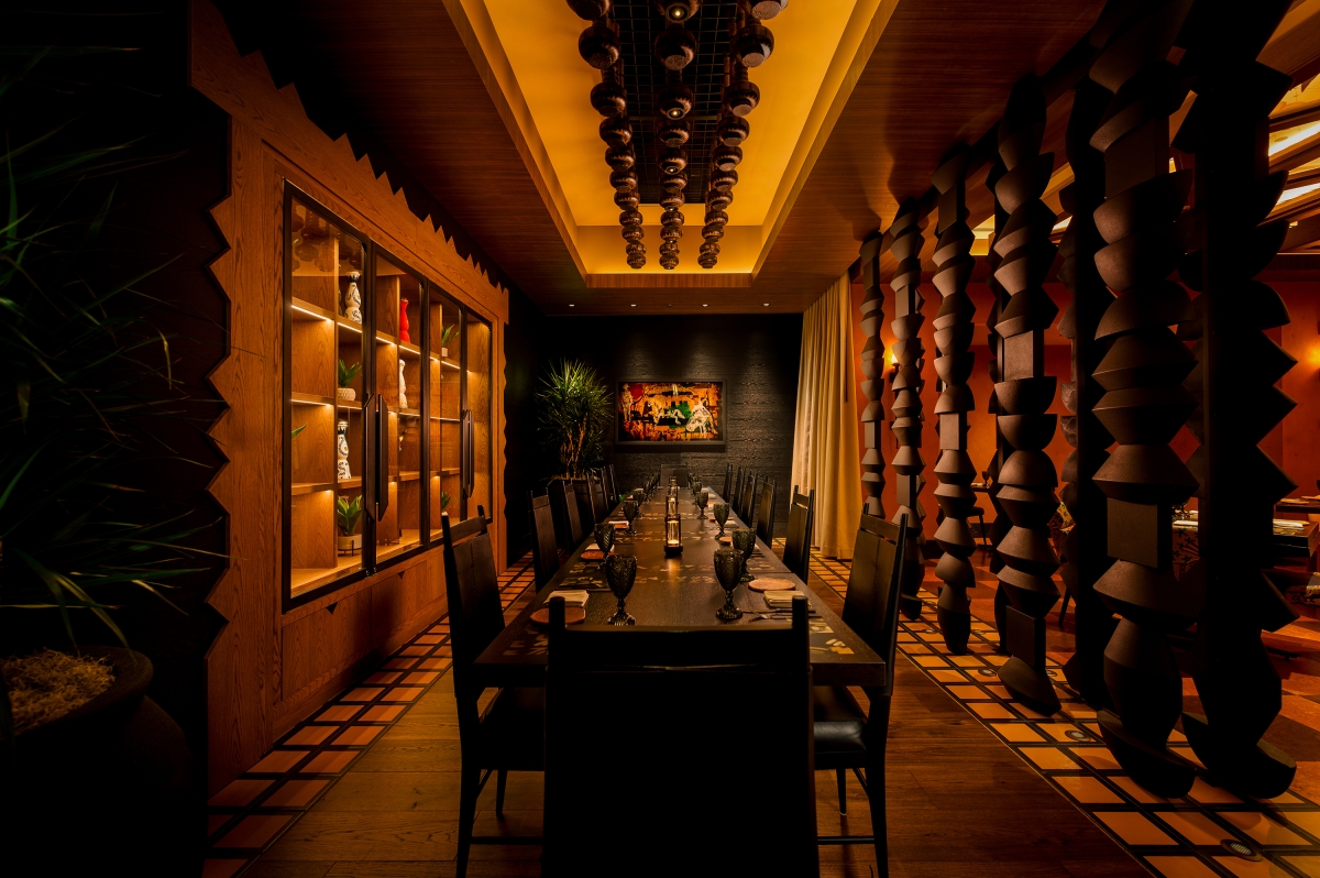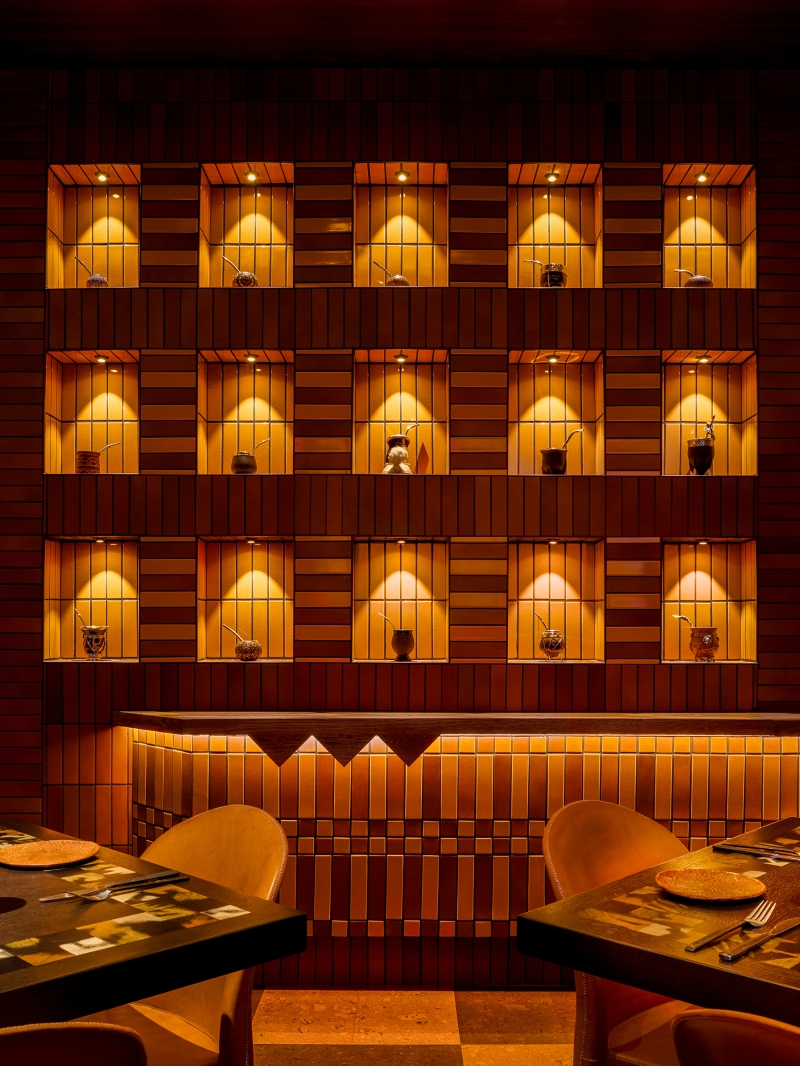 Small puck lights showcase the Argentinian mate cup collection, while focused spotlights over tables create an intimate dining experience.