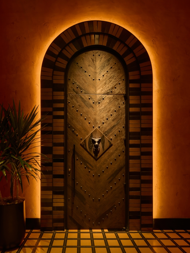 A beautiful backlit arched door offers a glimpse of what lies within, while a spotlight invites guests to knock on the brass bull knob and step inside.