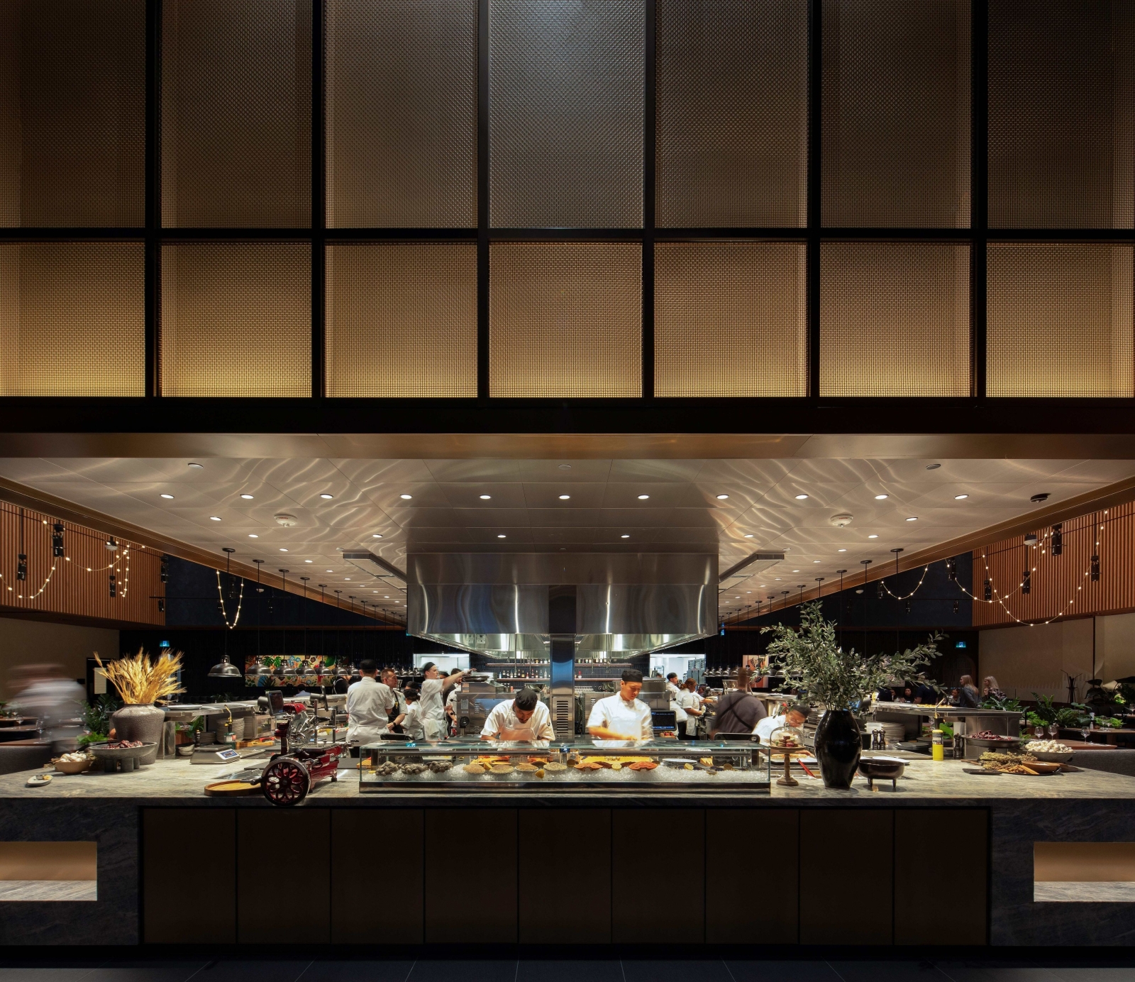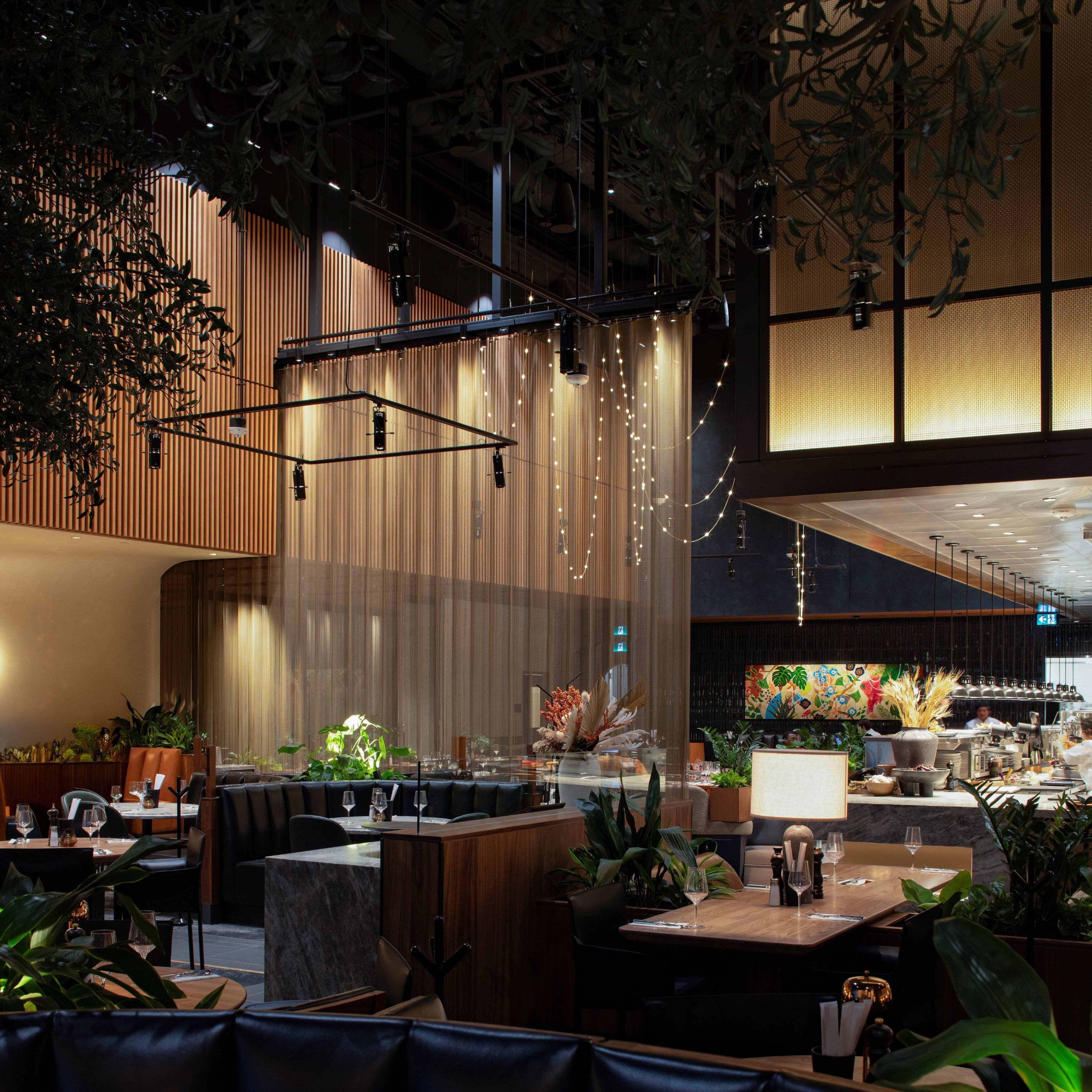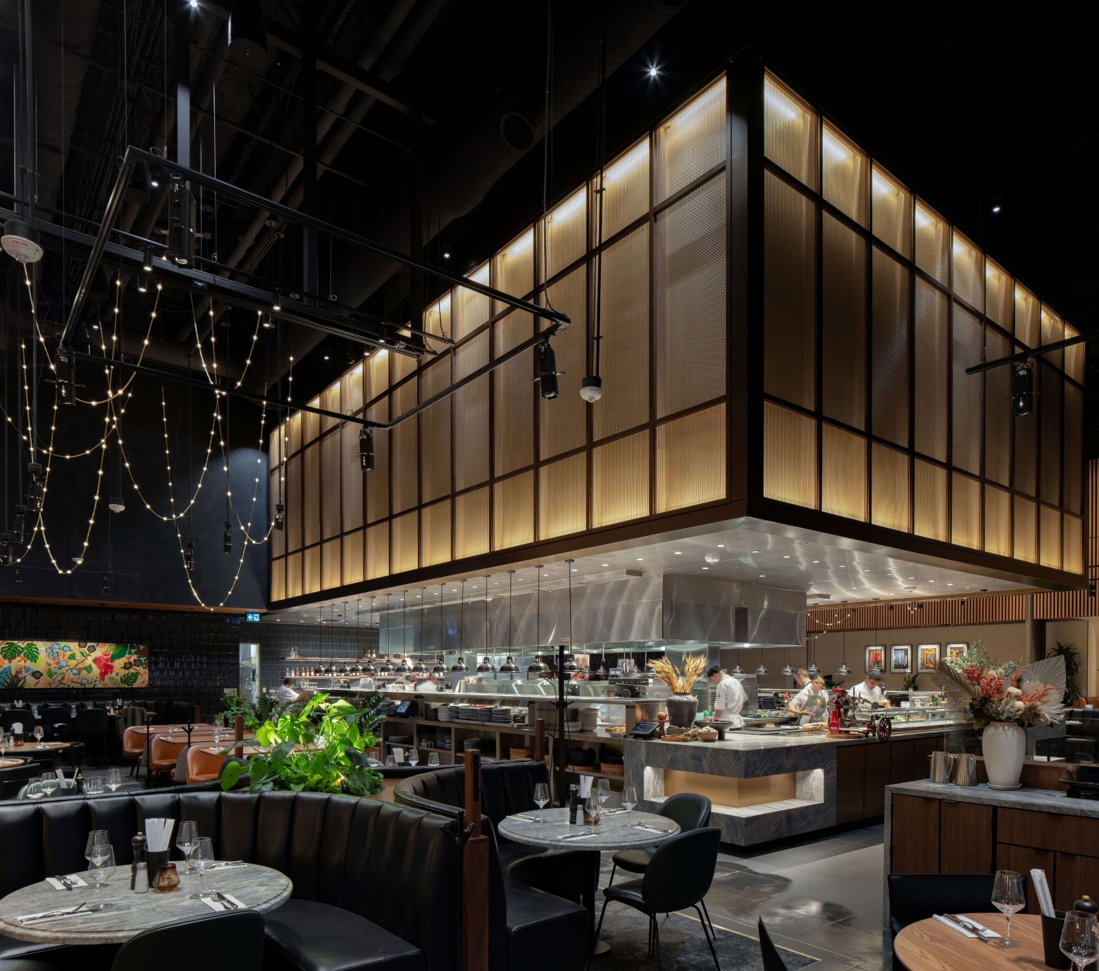 Framing projectors with hexcell louvres create pools of light at each table, highlighting the culinary creations while ensuring visual comfort and providing a sense of privacy.