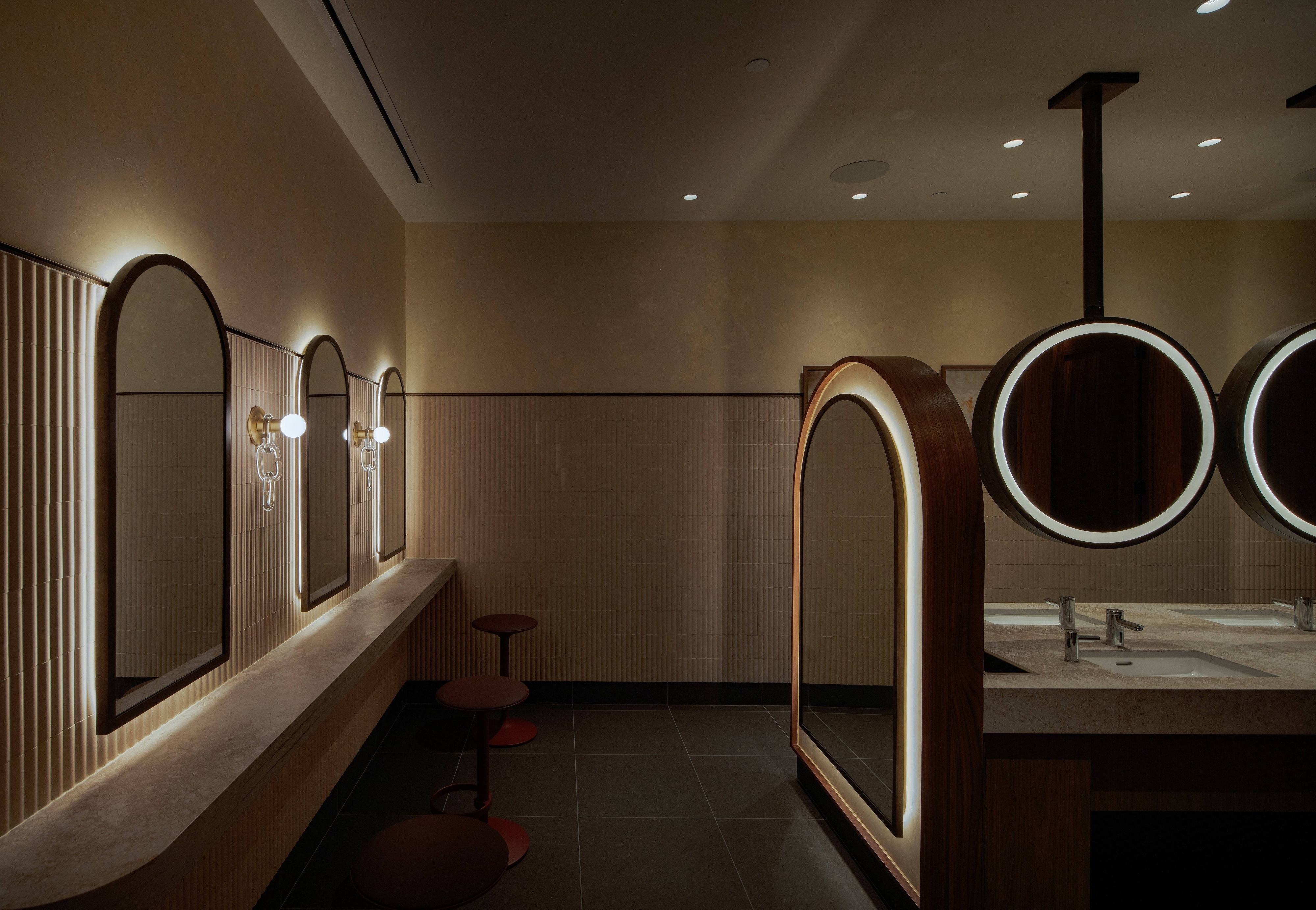 The ambience continues in the restrooms, with soft light levels paired with vertical illumination at mirrors.