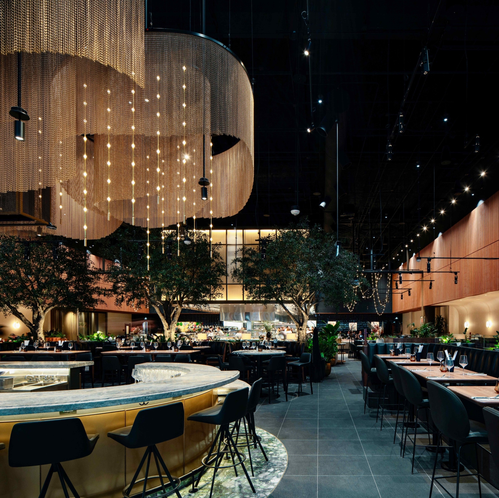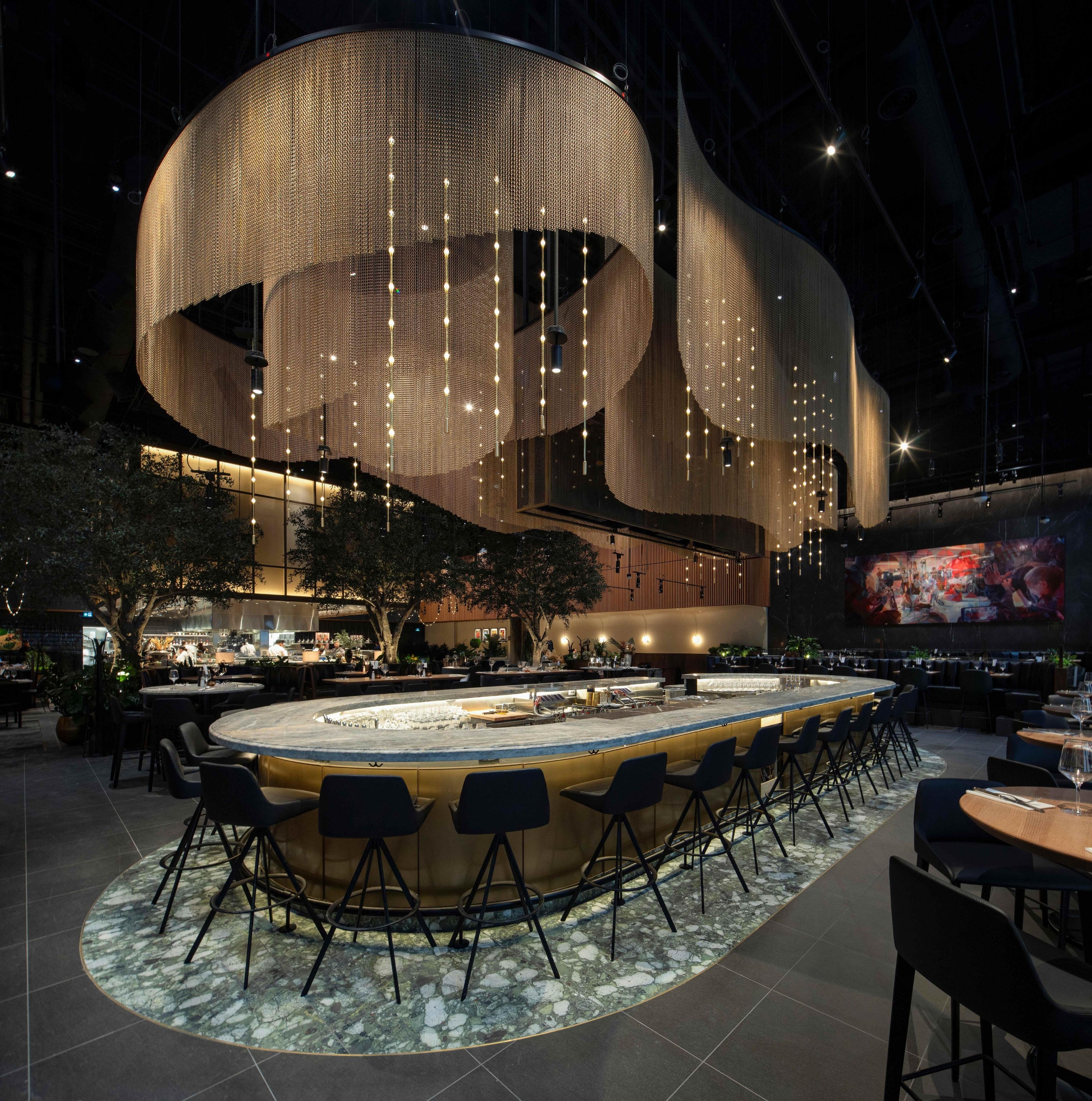 24' ceilings allow for a massive lit structure above the open kitchen. 3500K downlights with low-glare optics ensure proper task lighting without disrupting the dining ambiance. Dining areas are illuminated with 2700K, with 2400K for decorative fixtures.