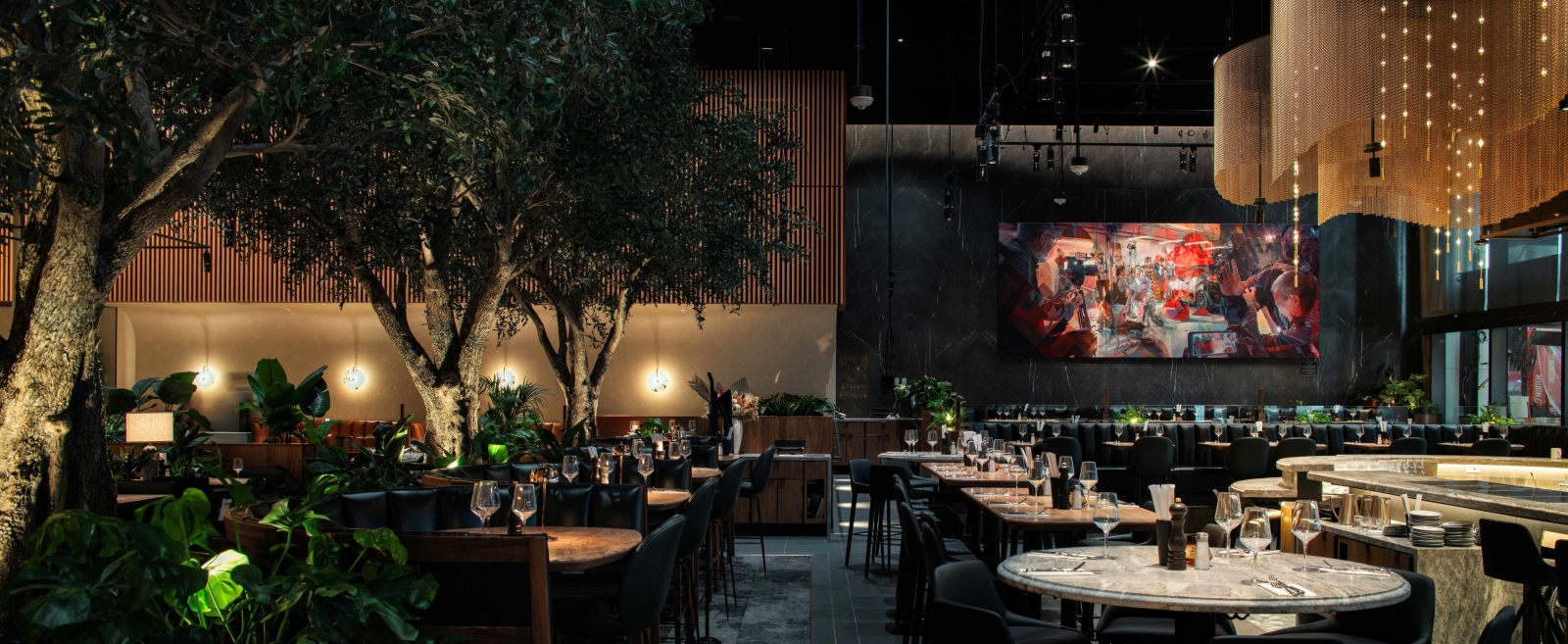 A plan that utilized over 100 individually controllable zones and a highly flexible control system was developed, seamlessly transitioning the restaurant from a vibrant lunch service to an intimate evening setting and allowing for precise balancing of ambient, accent, and decorative lighting through the creation of numerous automated, pre-programmed scenes.