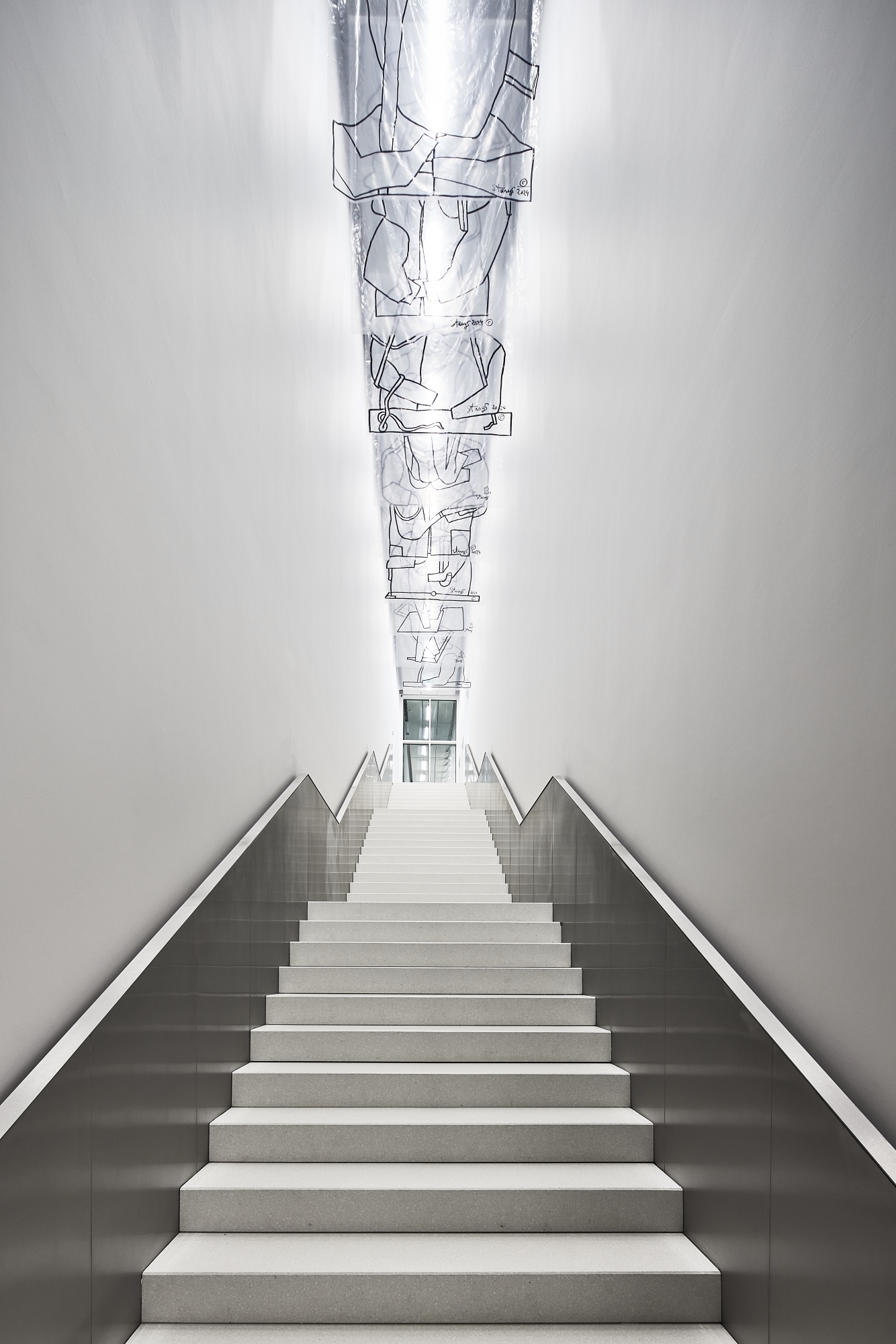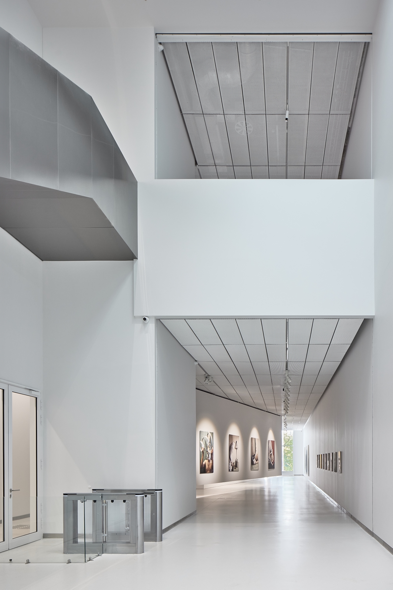 Indoors, the lighting unfolds through a layered harmony: primary illumination is provided by industrial linear fixtures concealed beneath a suspended metal-mesh ceiling. This creates a subtle, even glow, a calm yet rich luminous environment. Complementing this, track-mounted spot lights within exhibition spaces are deployed with care to accentuate artworks—each beam focusing on art pieces without overpowering them.