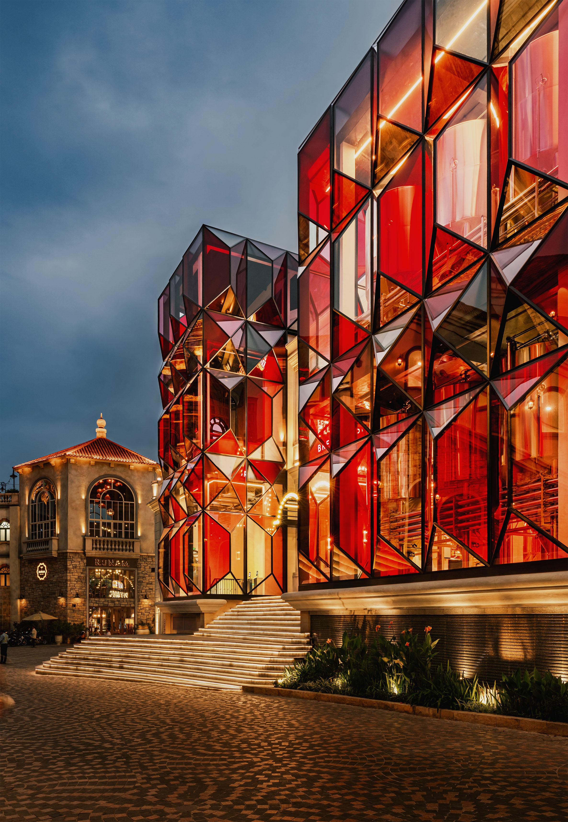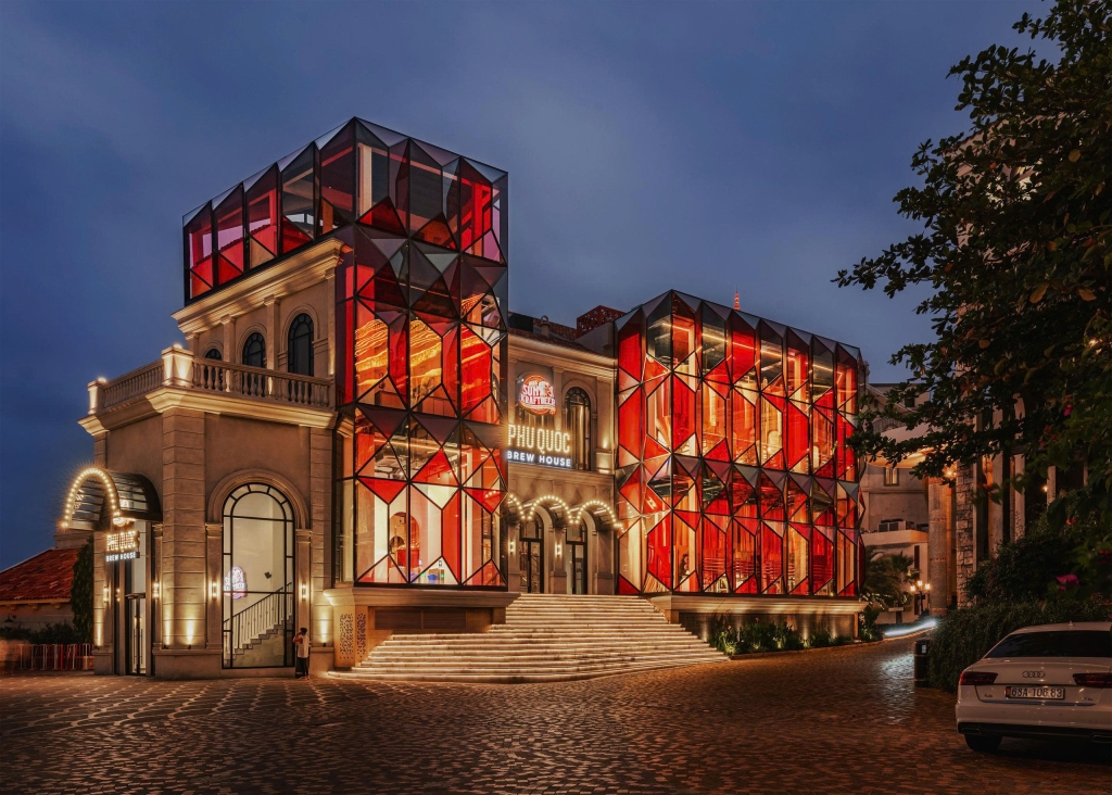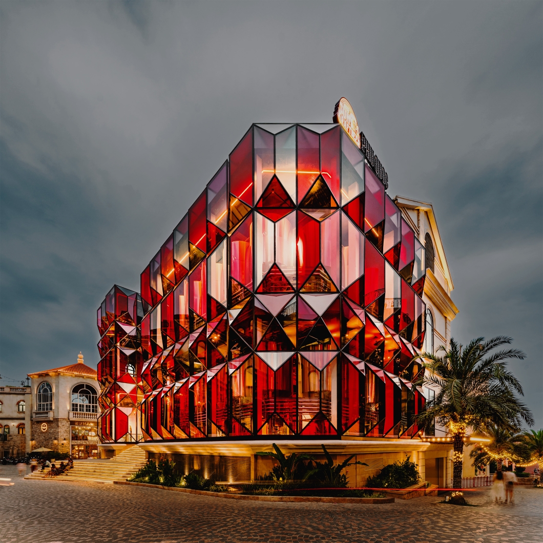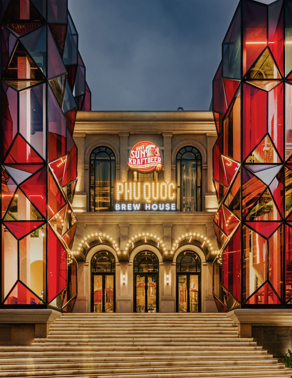 Entry DescriptionSun Brewhouse turns a glass-façade industrial brewery into an emotional glowing landmark, lit from within. For the main glass façade, rather than lighting the exterior directly, suspended linear LED wall washers are placed inside, casting 4000K light across the stainless-steel tanks and taking advantage of their reflective surfaces. The result is a ruby-red inner glow — a “heart of the town” — shining like a subtle gem that quietly turns heads without excessive brightness. Meanwhile, soft wall grazing lends a quiet classical elegance to the other façades. As a decorative gesture, marquee LED lights along the arched roofline — inspired by vintage cinema marquees — blend nostalgia with contemporary character.