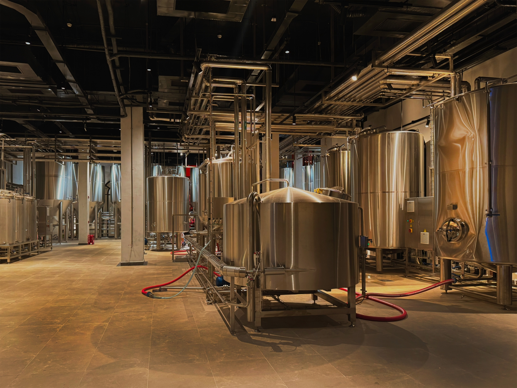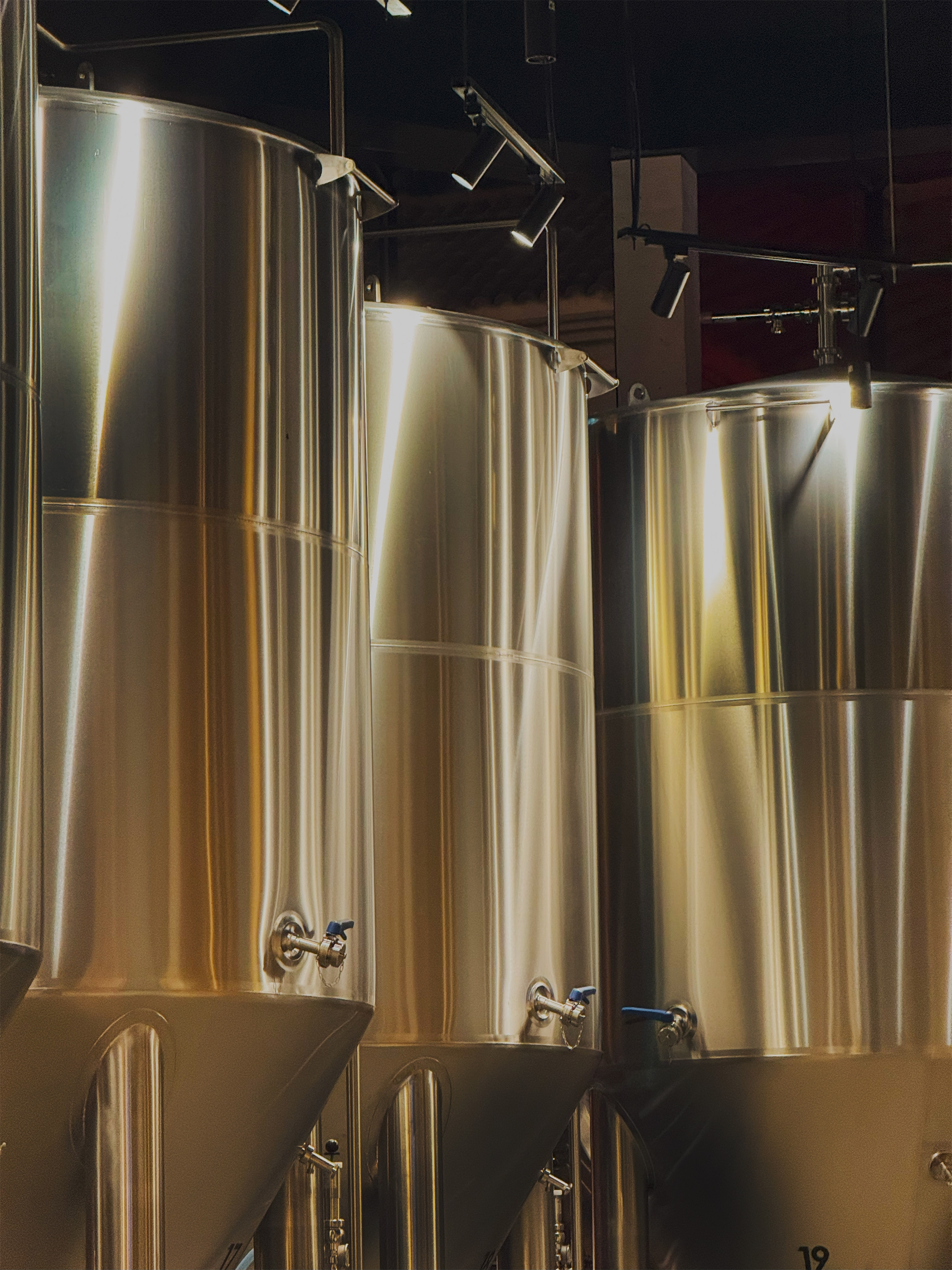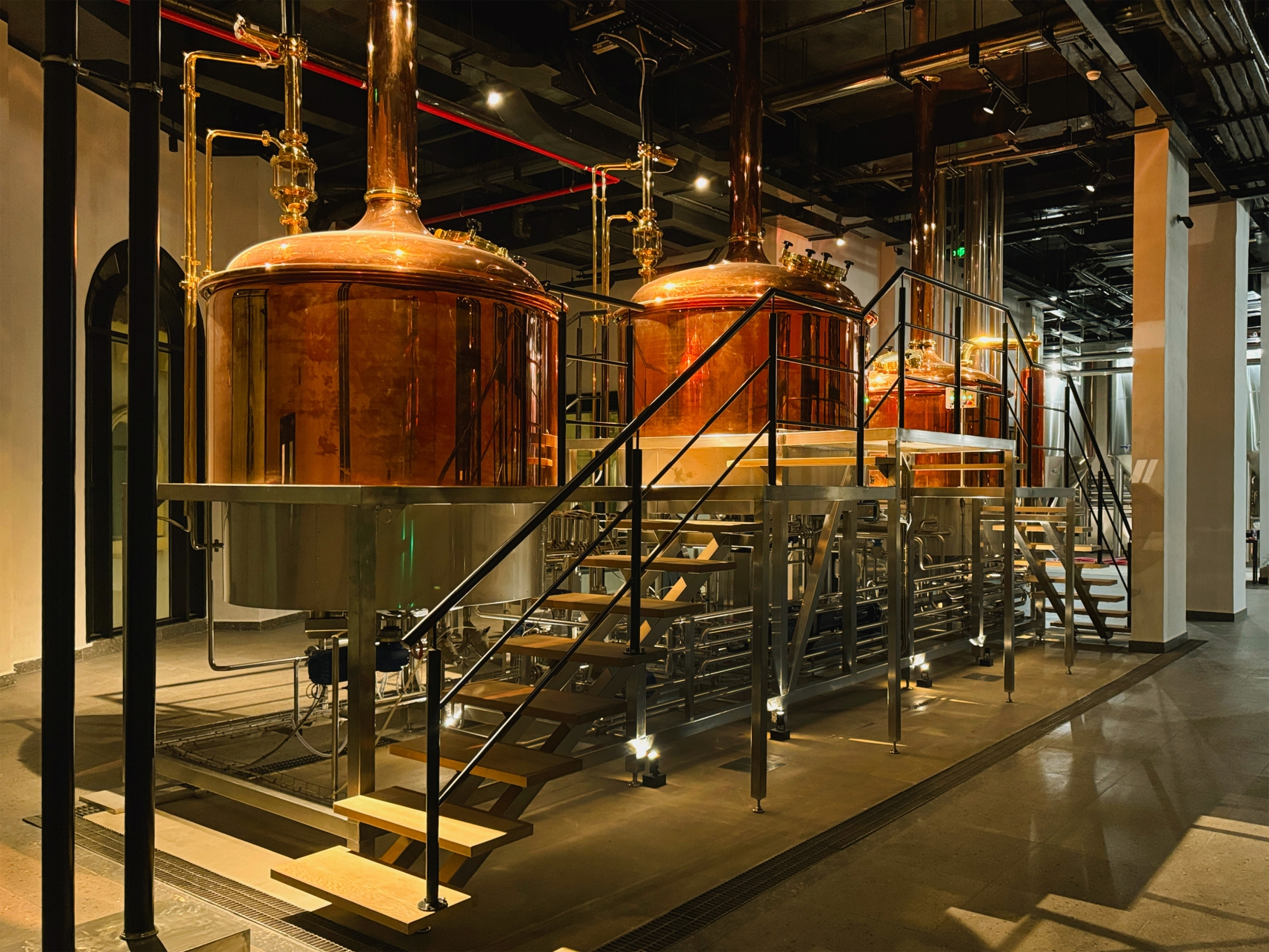 Inside, visitors walk through the brewing process, guided by a flexible and architectural lighting system suspended from a technical ceiling. This mix of LED spotlights on tracks, single spot projectors, and ground-mounted uplights gently reveal the form of the beer tanks and production line, while wall-mounted industrial decorative luminaires reinforce the raw brewery character. The interior lighting system is designed to serve different functions including wayleading, object highlighting, and decorative accent.
