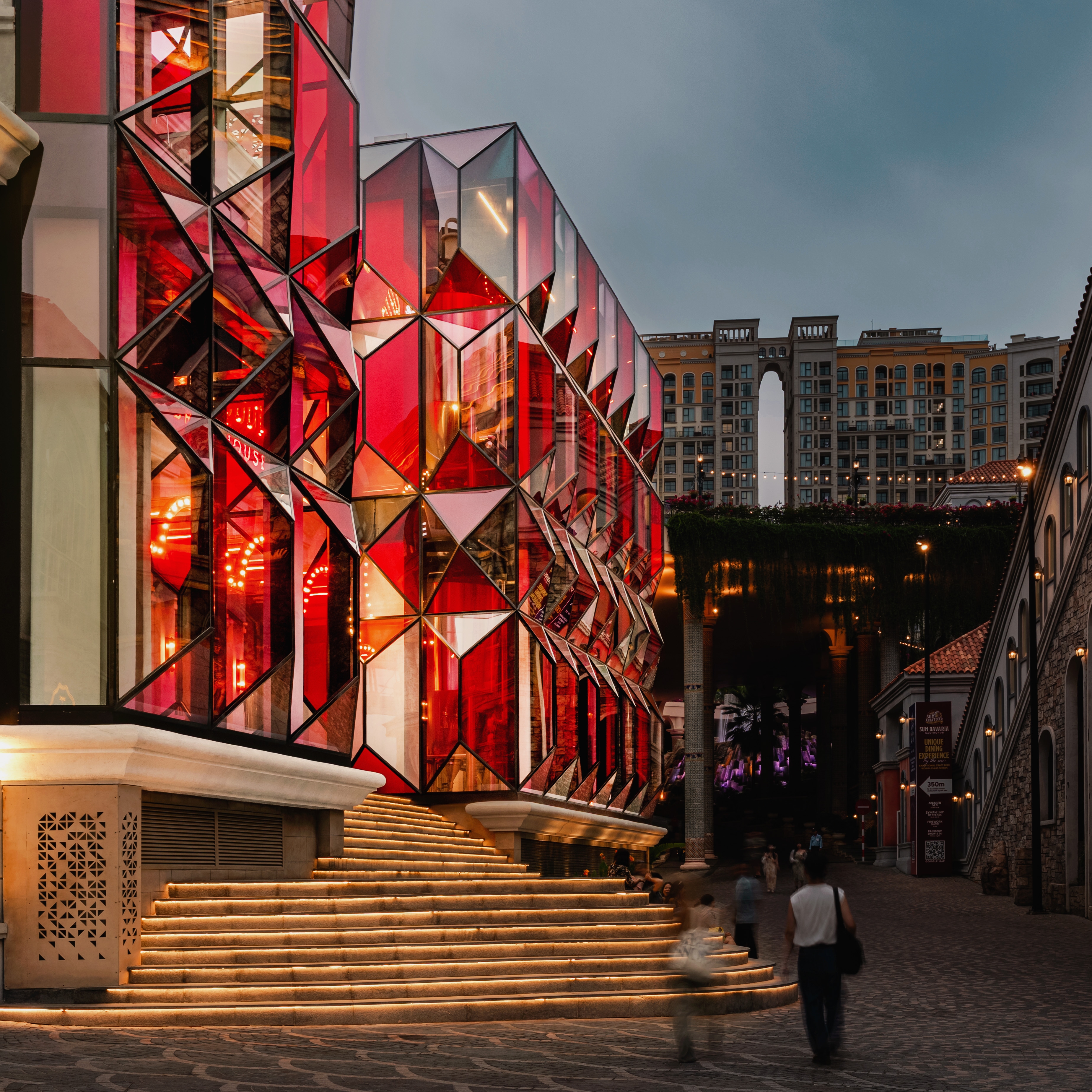 Lighting here serves not only as architectural illumination but also as entertainment, blurring the line between industrial facility and exhibition experience.