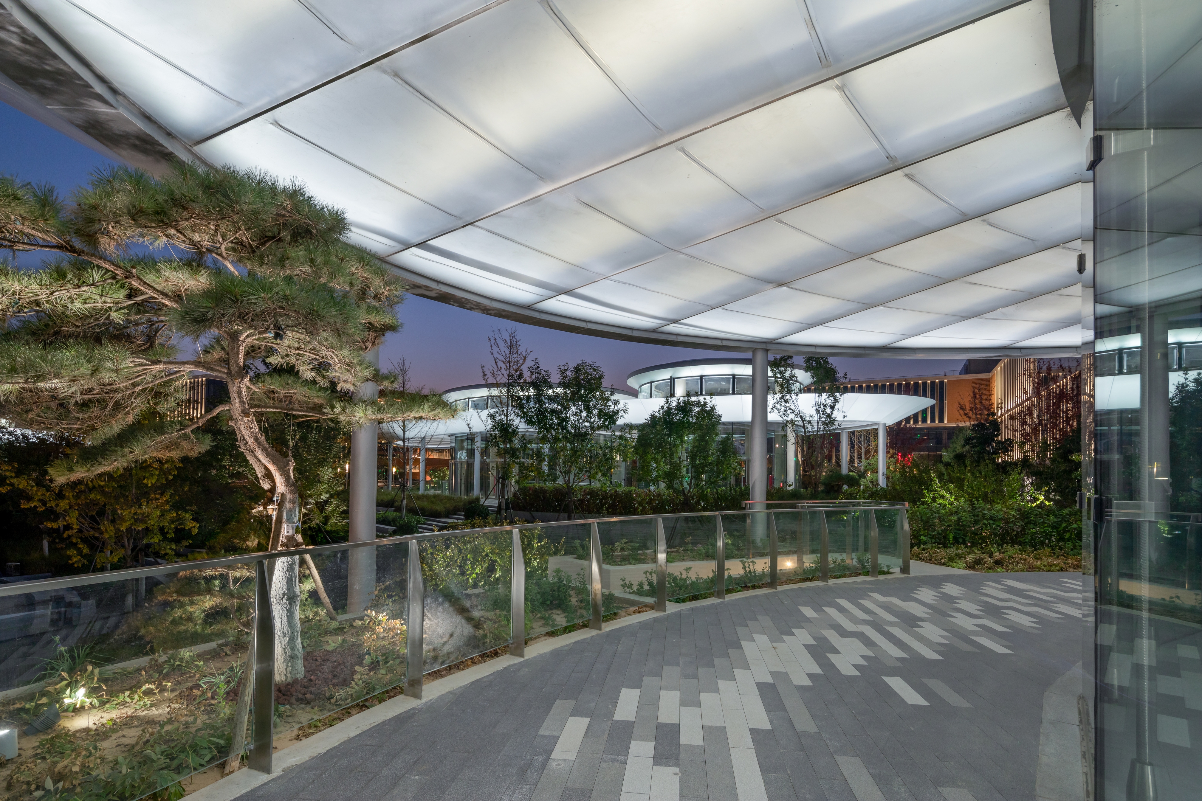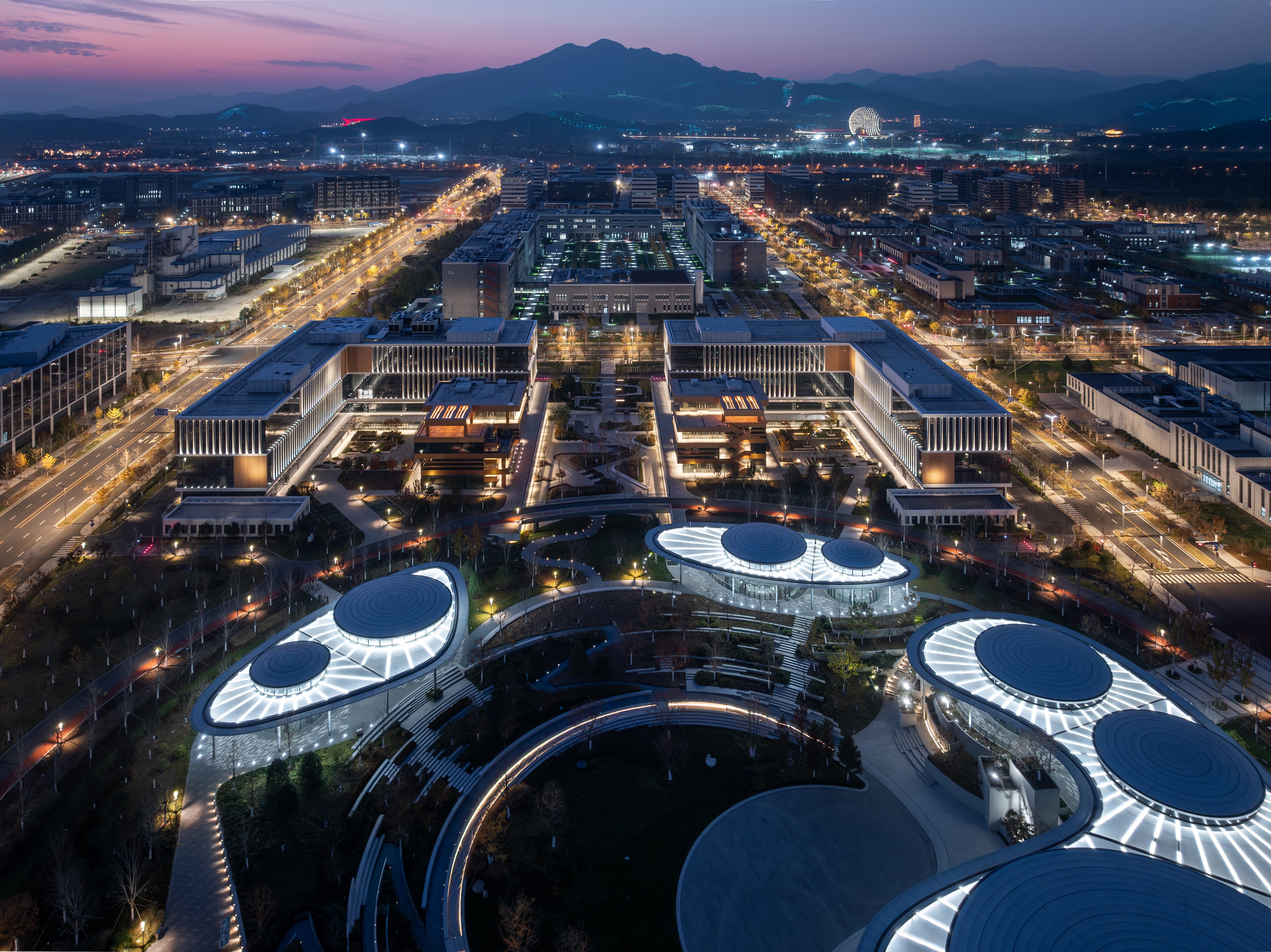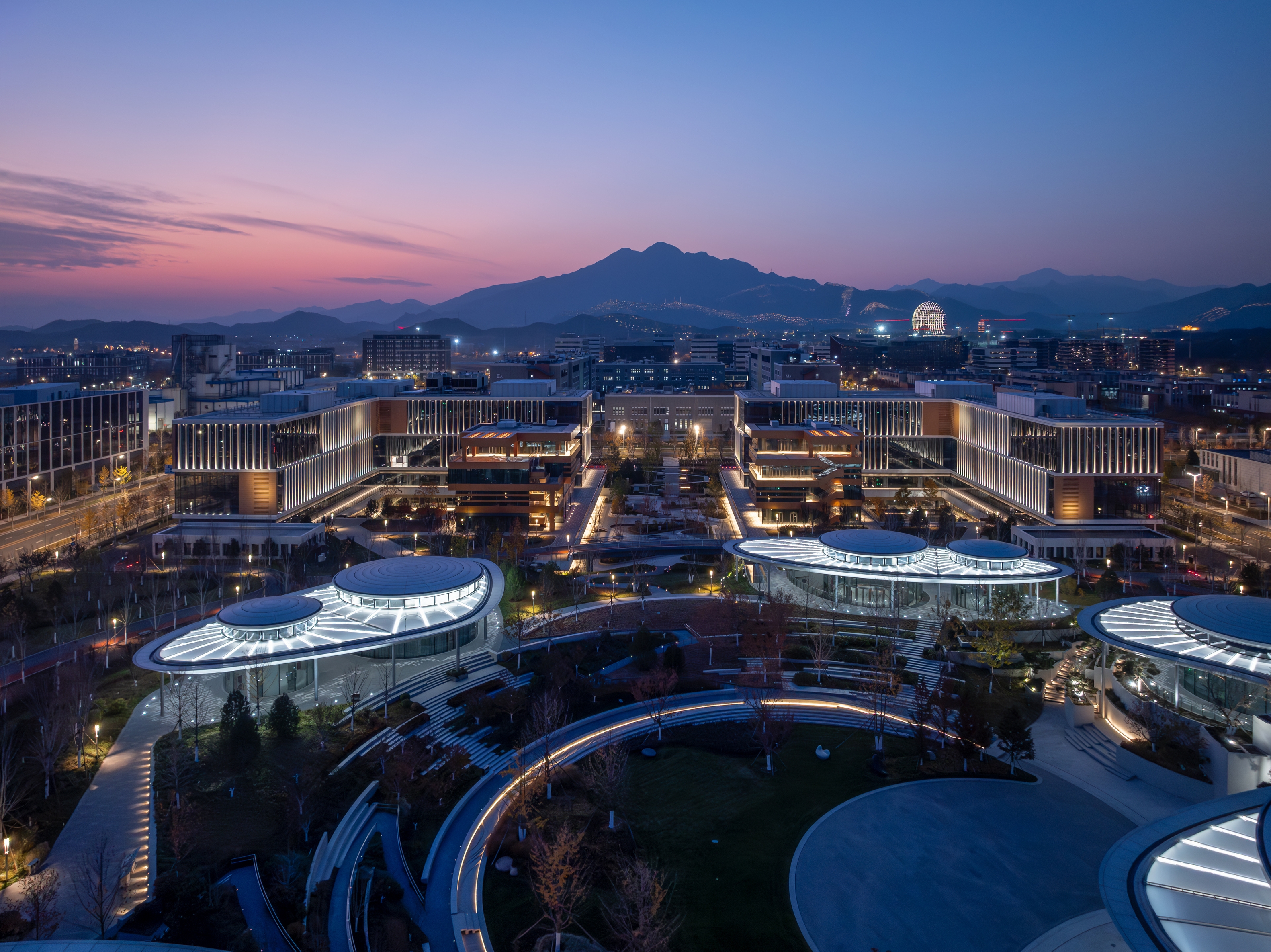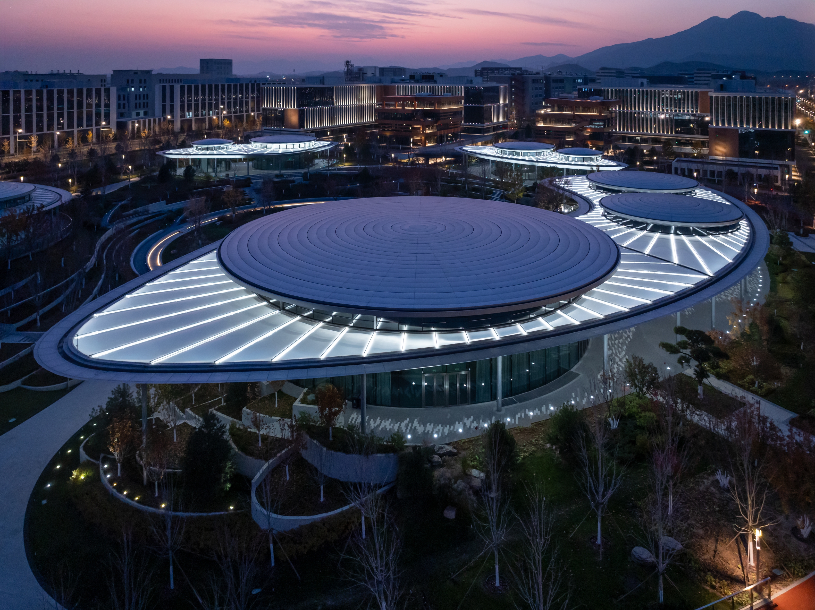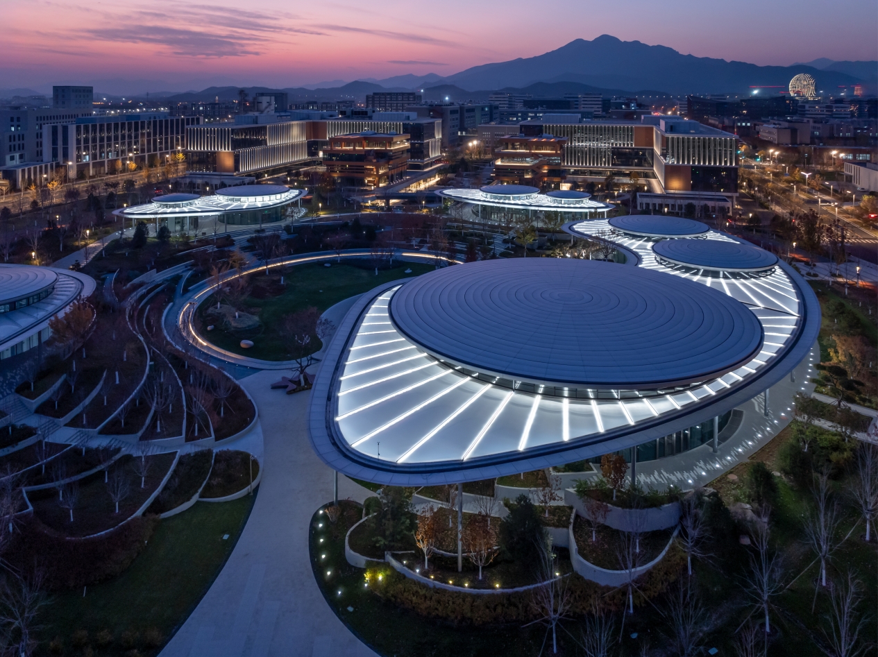 Entry DescriptionAs a model of the start - up area, the City Urban Hall Plot A features a square - shaped building surrounded by a central public space, connecting four functional zones. Lighting fixtures are installed in the petal - shaped membrane roof of the central shared building, making it a prominent visual focal point at night, like blooming petals. In the plot's paths and central square, landscape lighting is minimized. Instead, the internal light of buildings is utilized to enhance the sense of daily life and work, avoiding excessive floodlighting and following architectural logic to create a comfortable living and working lighting environment.