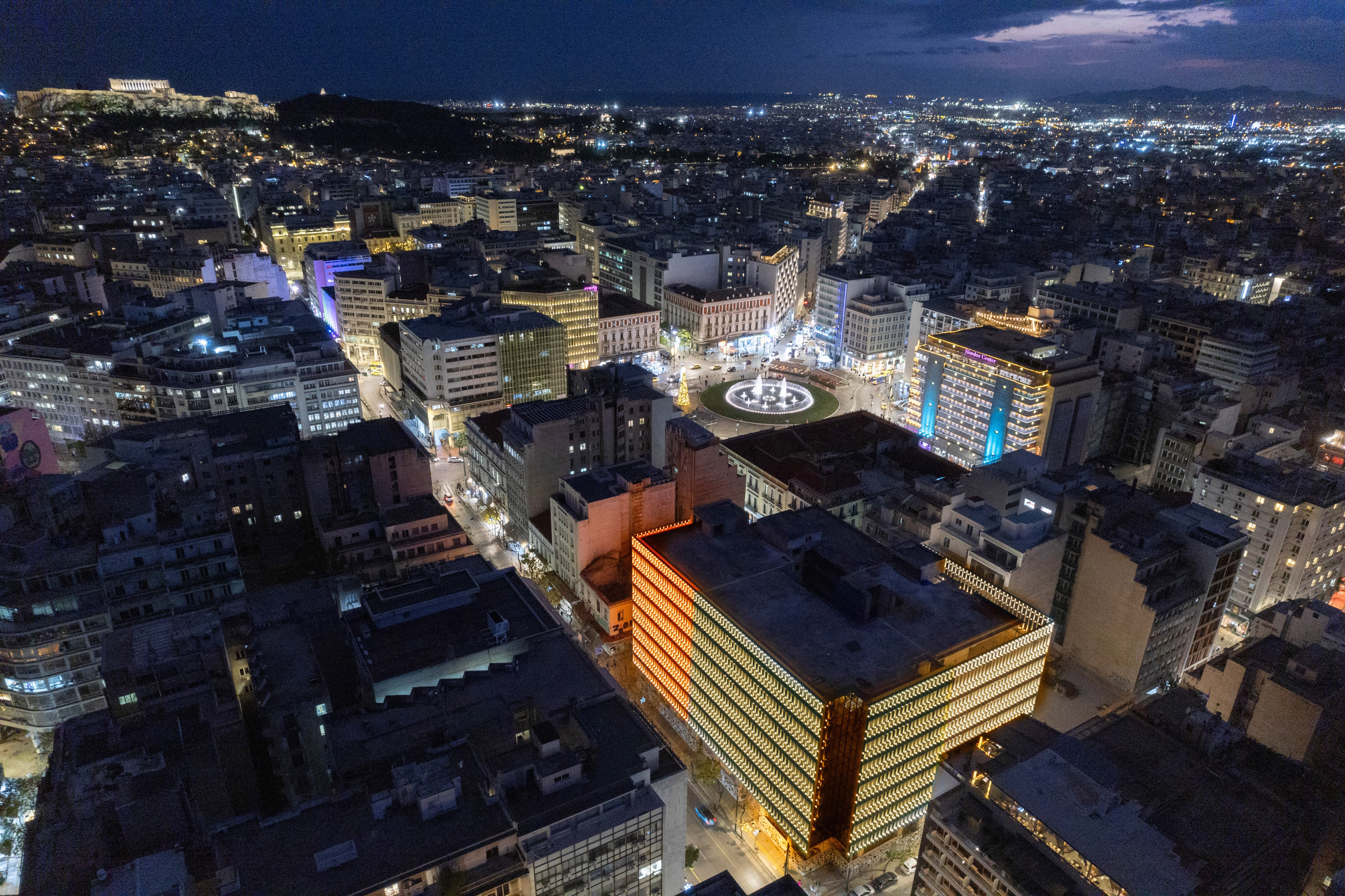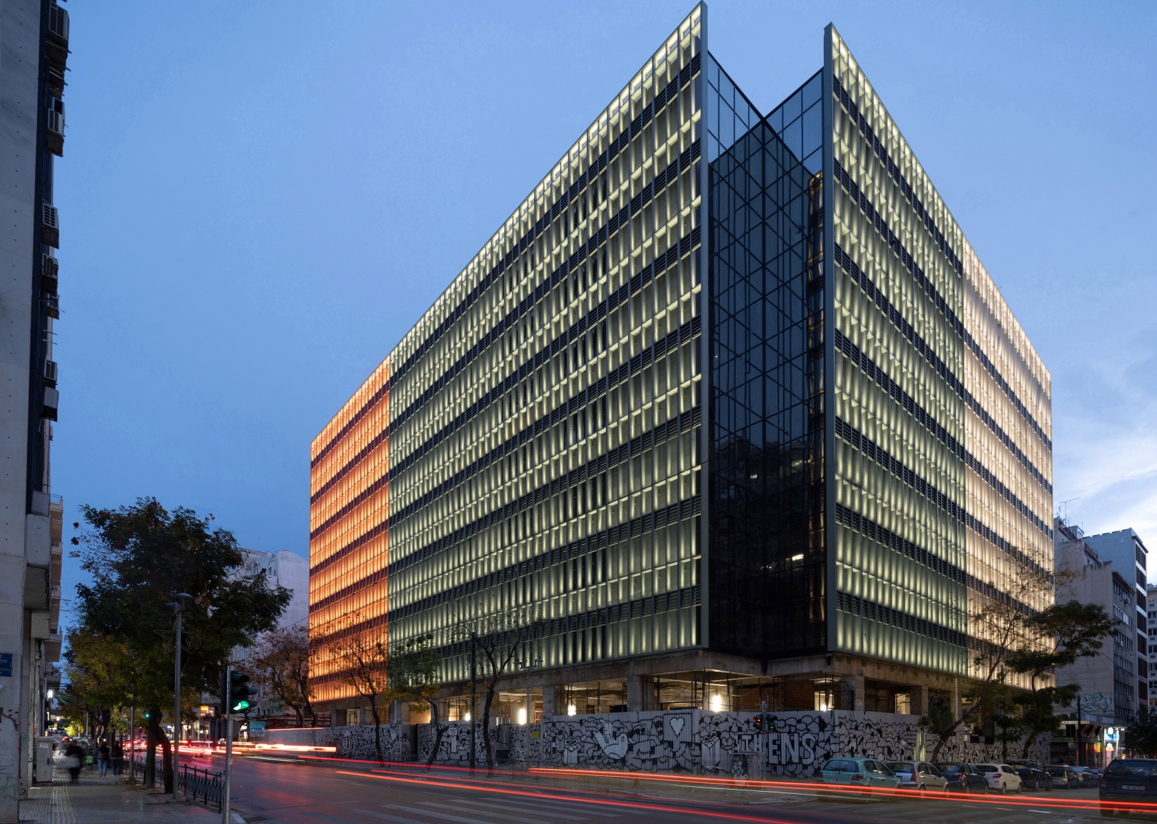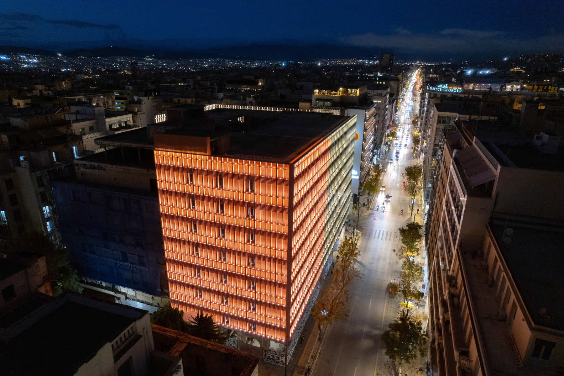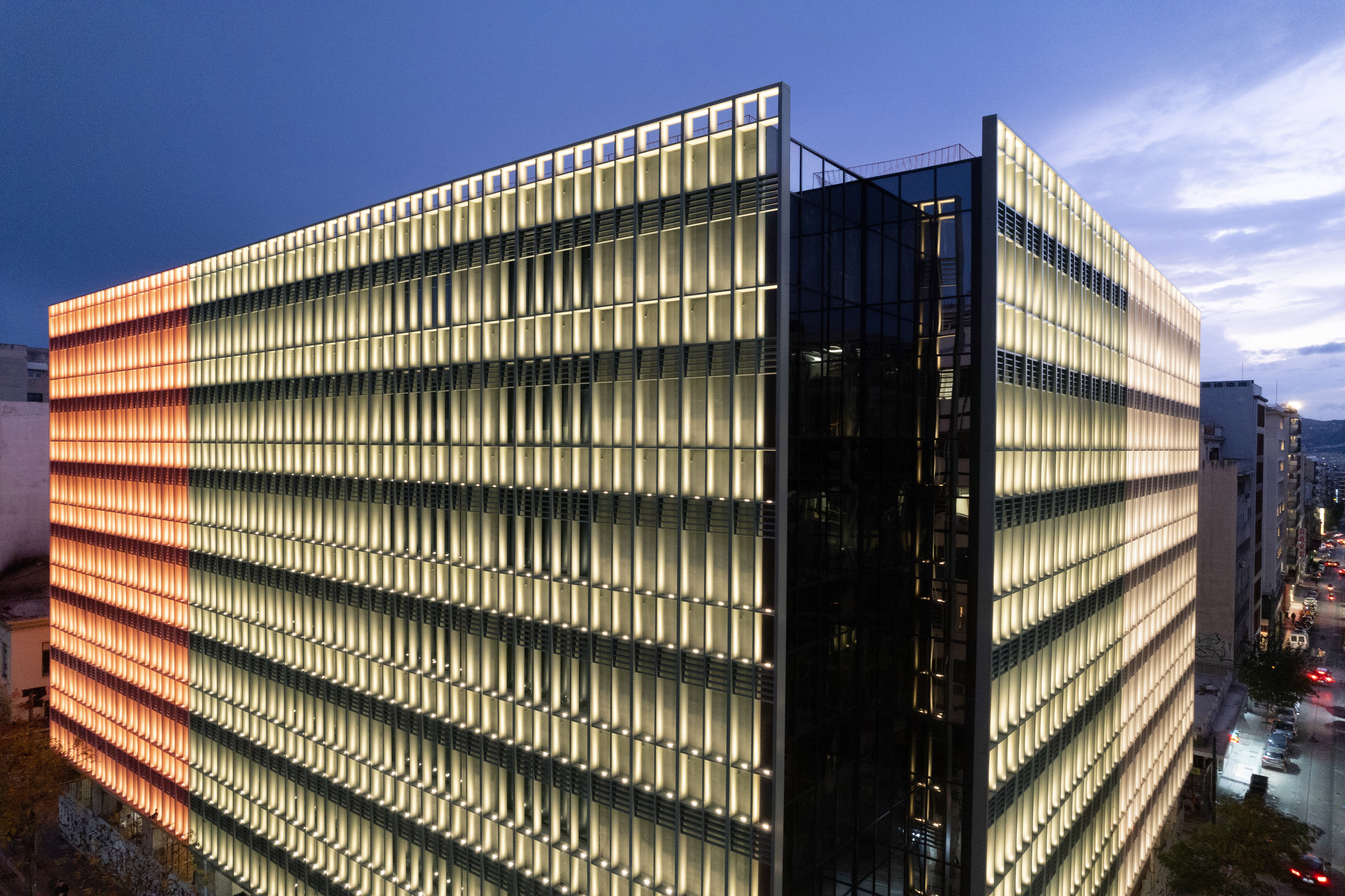 A ‘less is more’ lighting design approach was followed, aiming to accentuate each aluminum frame with white static light in a consistent, repetitive pattern. This mundane yet elegant repetition allows the façade’s plasticity to be subtly emphasized while gently revealing the specific color of each segment. The lighting enhances the facade at night, contributing to the regeneration of the Omonia Square area and its nightscape.