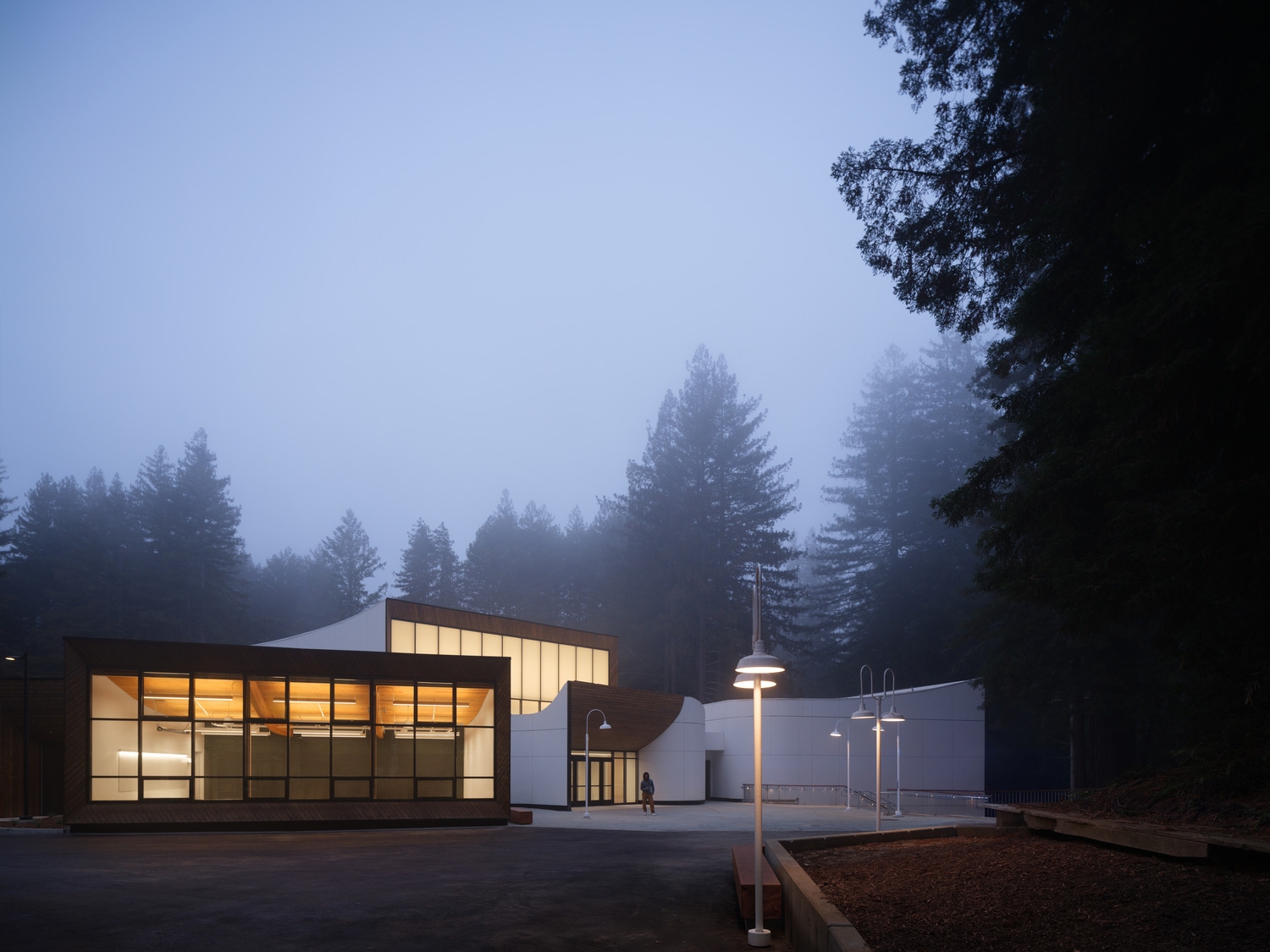 Entry DescriptionNestled within a serene redwood forest, this university campus renewal reimagines exterior lighting for a historic campus, supporting its expansion while preserving its timeless charm. The original 1970s architecture, defined by its rustic ambiance, is complemented by new residential and academic buildings that doubled the campus’s capacity. The design required a lighting approach that harmonizes with the environment, ensuring safe navigation, minimizing glare, and maintaining the forest’s natural darkness.