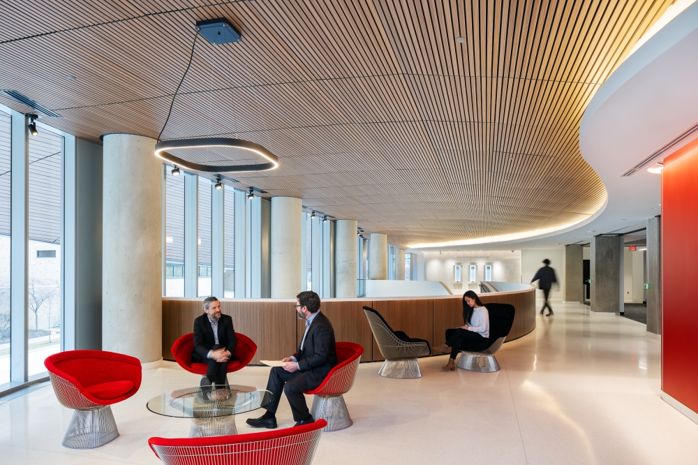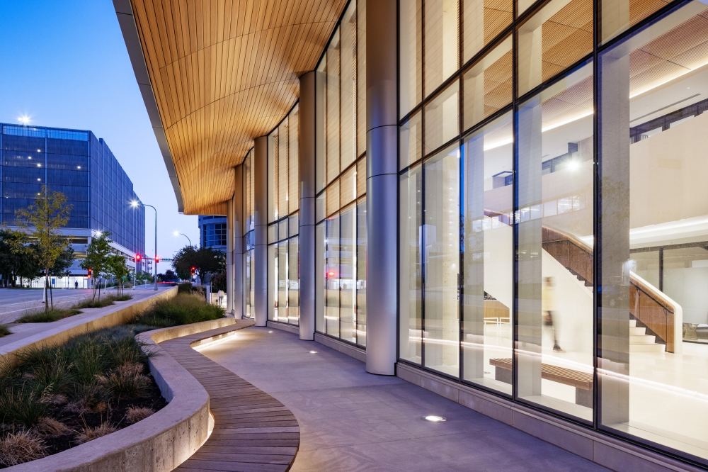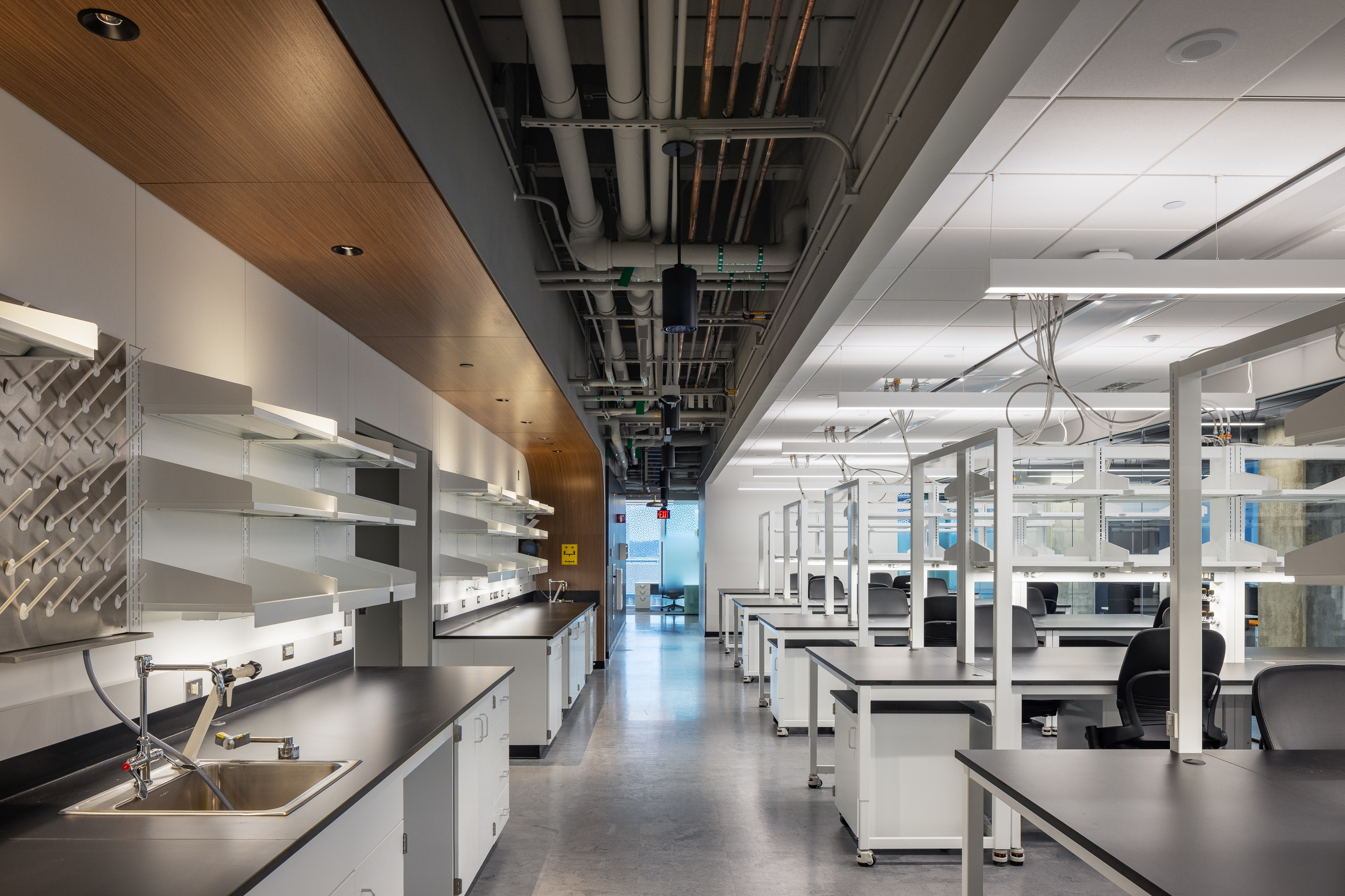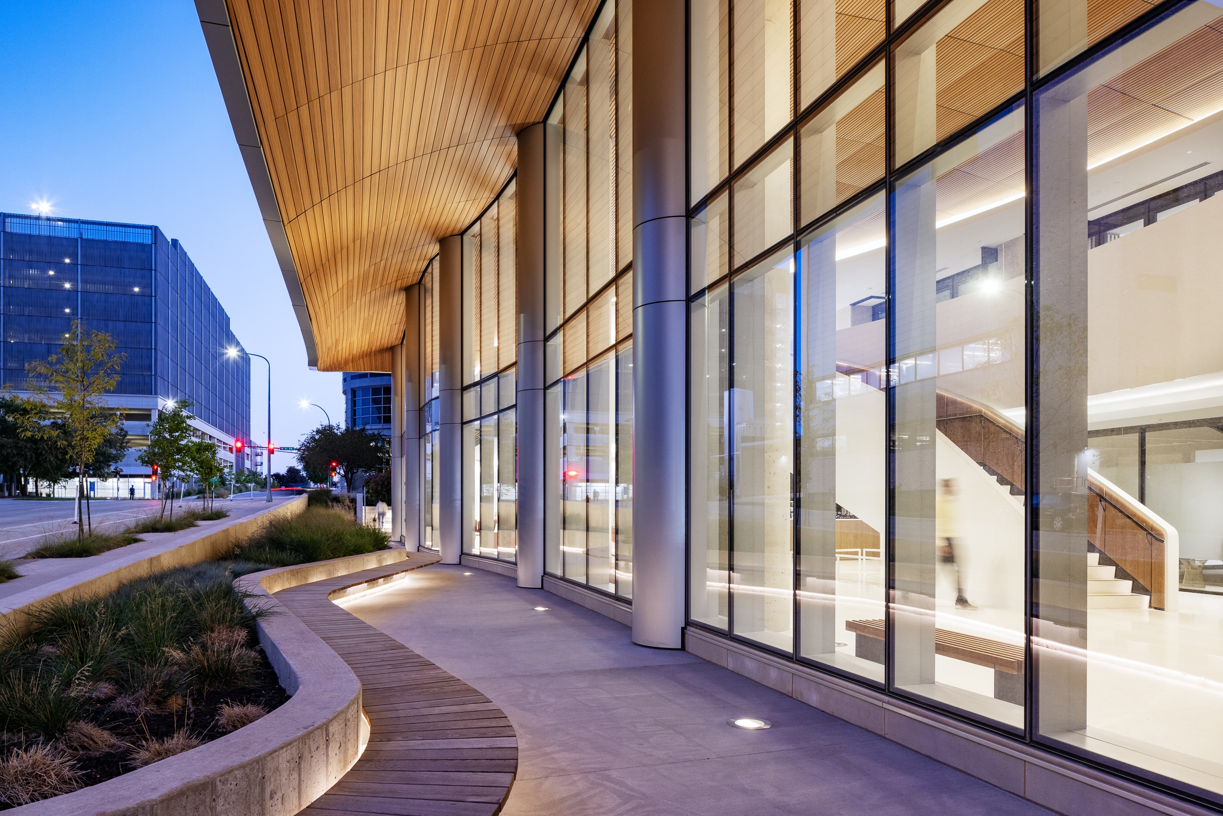 Sustainability ApproachSustainability is integral to this 24-hour research facility. Interior daylight harvesting controls minimize energy use while supporting circadian rhythms. Floor-to-ceiling glazing provides daylight and views, aided by a custom scrim that reduces glare without blocking visibility. Lighting materials feature recycled content and zero-VOC finishes. The exterior lighting design minimized material use through custom mounts and louvers, eliminating bulky housing and conduit while reducing glare. Digital controls maintain coordinated energy performance across interior and exterior zones. These strategies combine to reduce environmental impact, improve occupant wellness, and support the lab’s mission to advance human health.