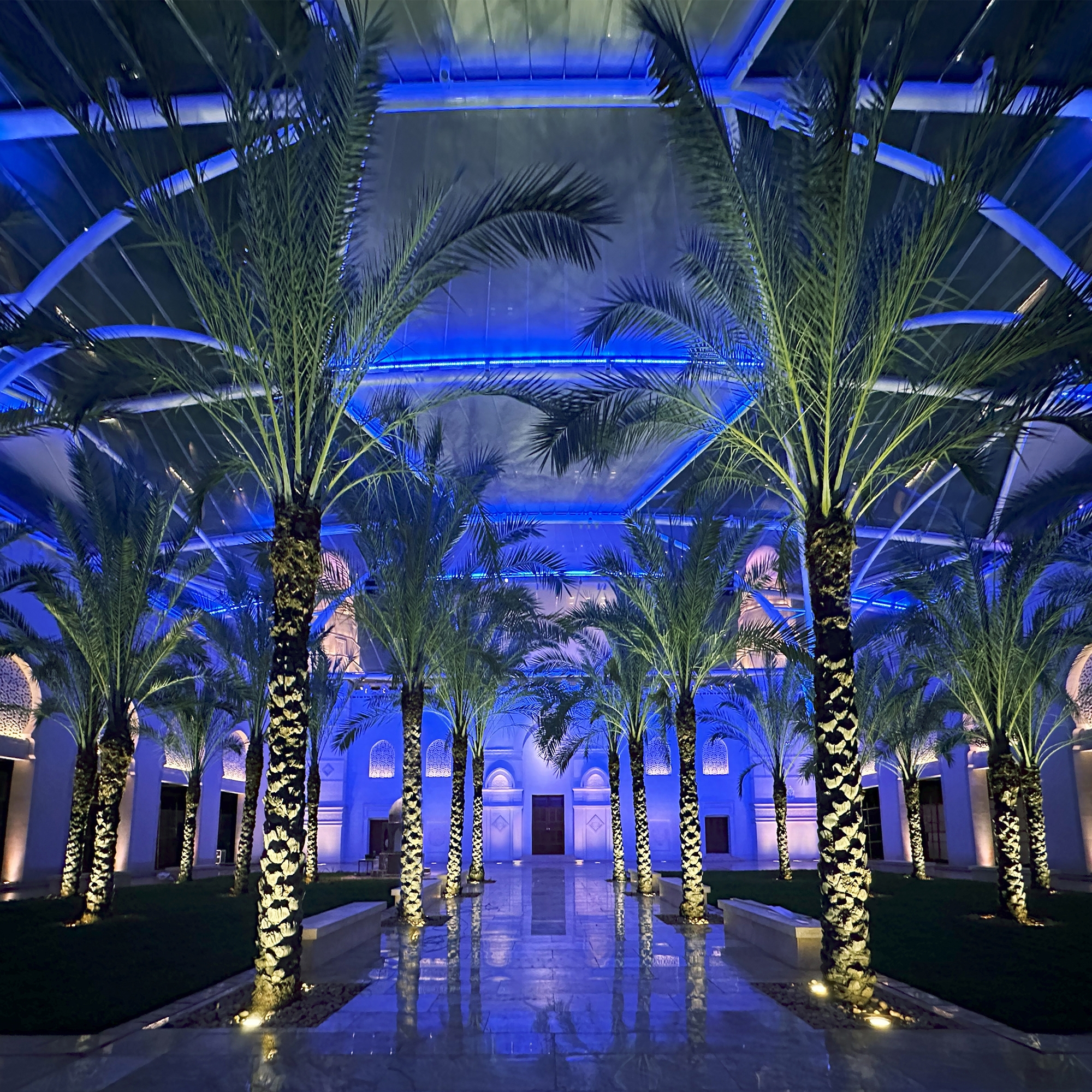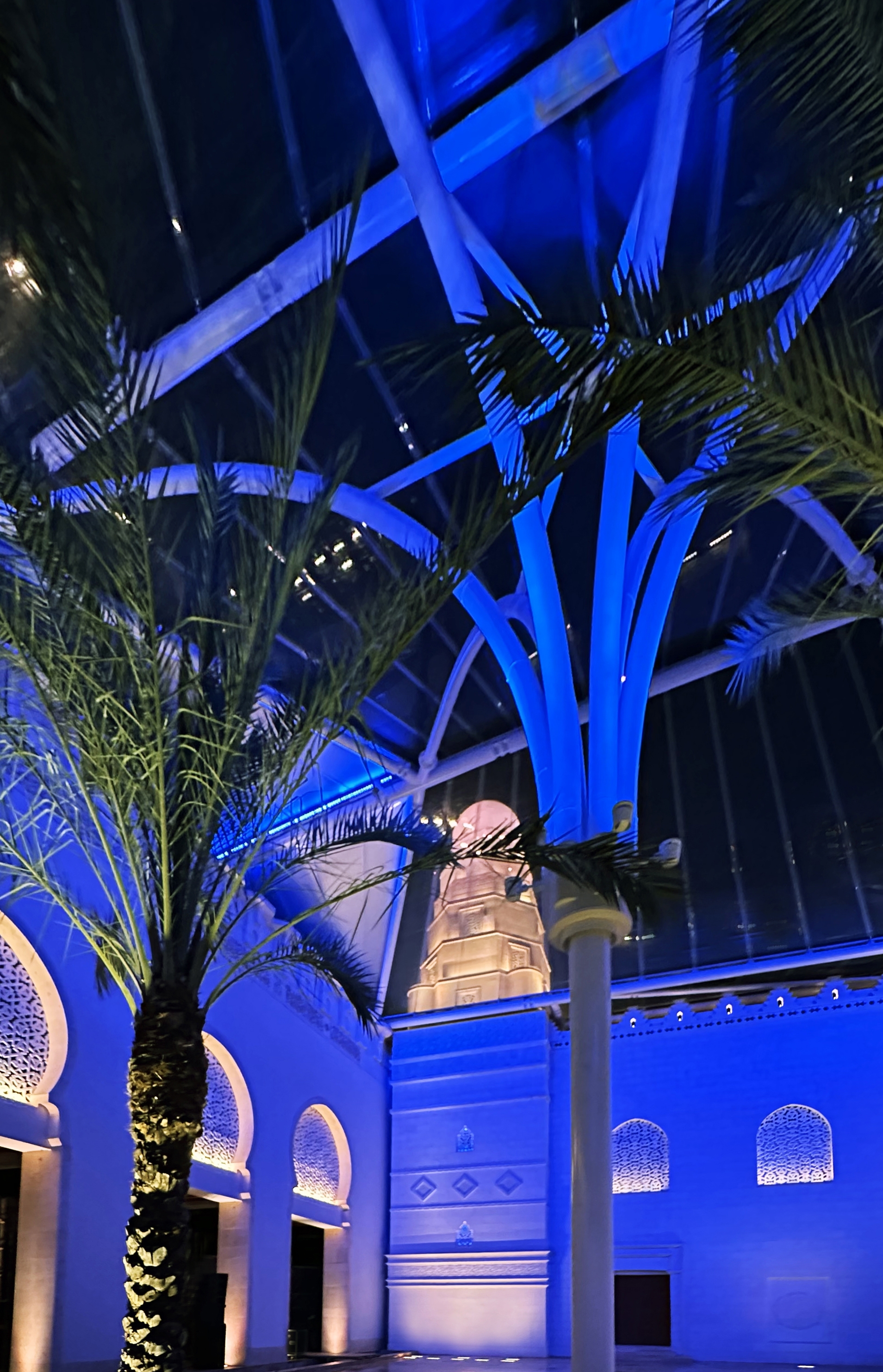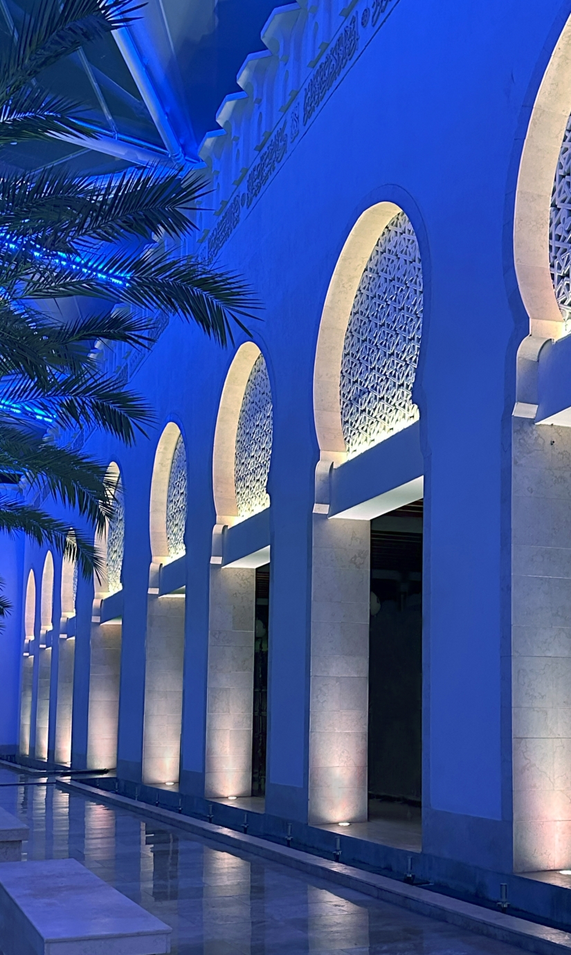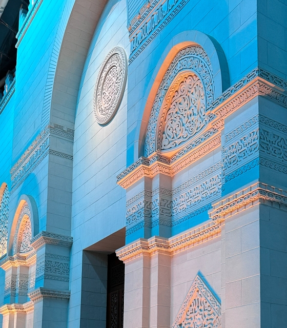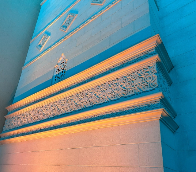 Entry DescriptionIn AlJamea tus Saifiyah University’s main courtyard, architecture bridges past and present, creating a gathering space framed by facades inspired by 10th-century Fatimid architecture and covered by a contemporary ETFE canopy supported by soaring steel arches. By day, it is a hub of student activity; by night, it transforms into a luminous sanctuary for reflection, prayer, and events. The lighting honors both historic heritage and modern functionality. Mosque and colonnade facades with intricate carvings, stone medallions, and recessed arches are revealed by strategically placed low-profile accent fixtures, while 8-degree narrow-beam grazers along canopy arches create ribbons of light overhead. Recessed in-grades softly wash the details while maintaining low ambient levels. The design prioritizes user comfort with louvers, shielding, and precise aiming to prevent glare, and support natural adaptation. Programmable RGBW luminaires with preset scenes produce illuminance ranging from 5–25 lux for calm reflection to 250 lux for AV/stage needs, with an overall 0.06 W/sq.ft. installed. At quiet hours, shadows reveal intricate stonework, creating meditative stillness; during celebrations, the courtyard pulses with color and energy, uniting the community in joy. This interplay of calm and vibrancy demonstrates lighting’s power as an emotional medium, blending historical craftsmanship.