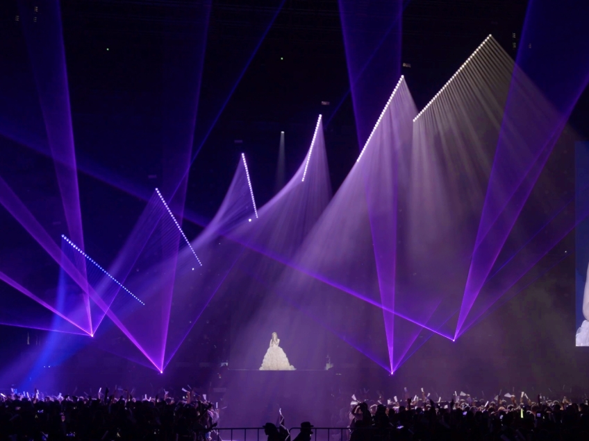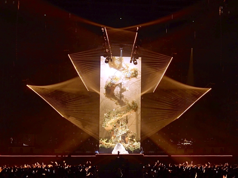 Linear and radiating arrangements formed a layered dome-like composition, evoking the spiritual grandeur of a cathedral while symbolizing the purity and depth of human emotion. The lighting incorporated motifs of rose petals—rendered in cascading layers that blossomed and receded with the music’s rhythm—reflecting the tender yet powerful emotions conveyed in each song. At the heart of the stage, intersecting beams formed an “X”-shaped focal field, generating a prayer-like sense of intimacy that enveloped the audience in the intertwined energy of light and sound. The overall approach emphasized breath and balance rather than spectacle—achieving depth through simplicity and emotional subtlety within scale.