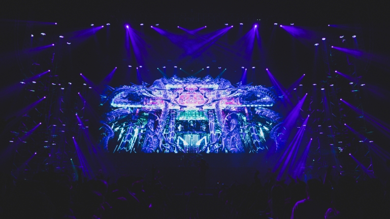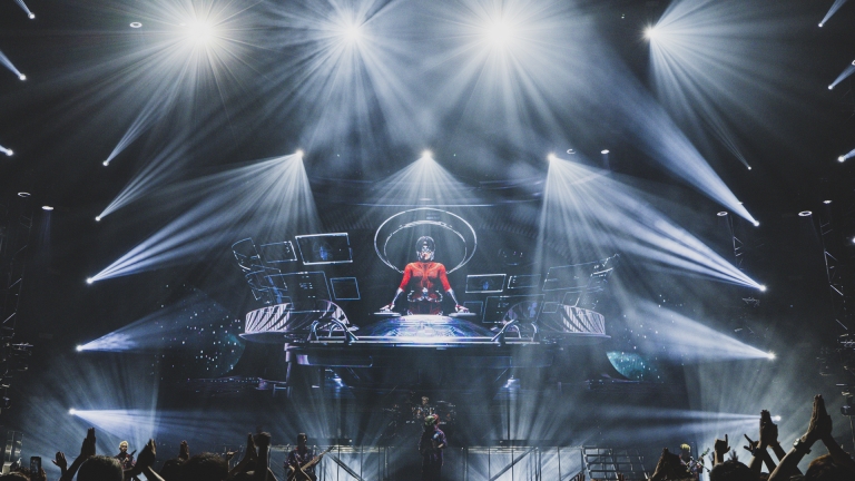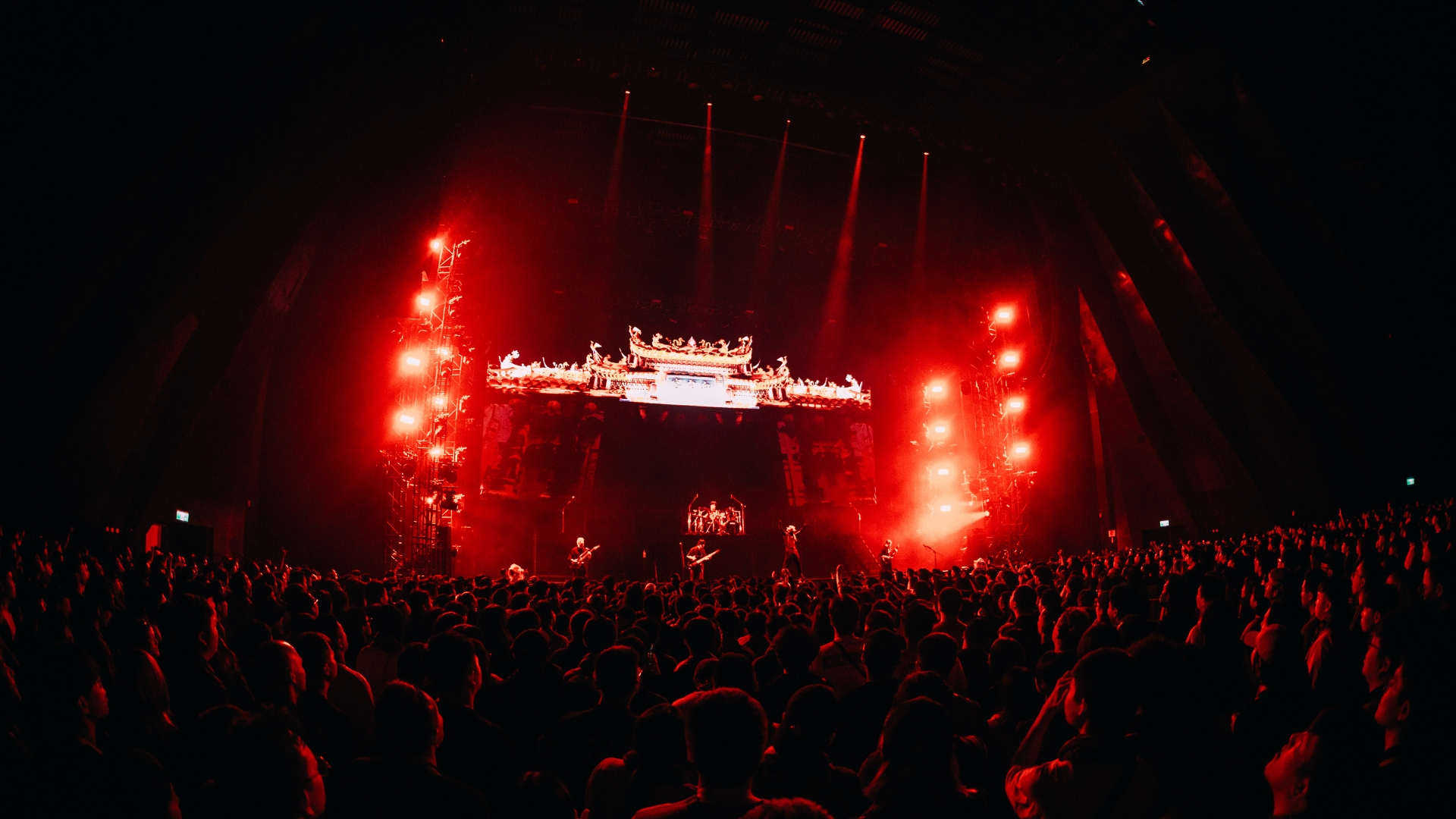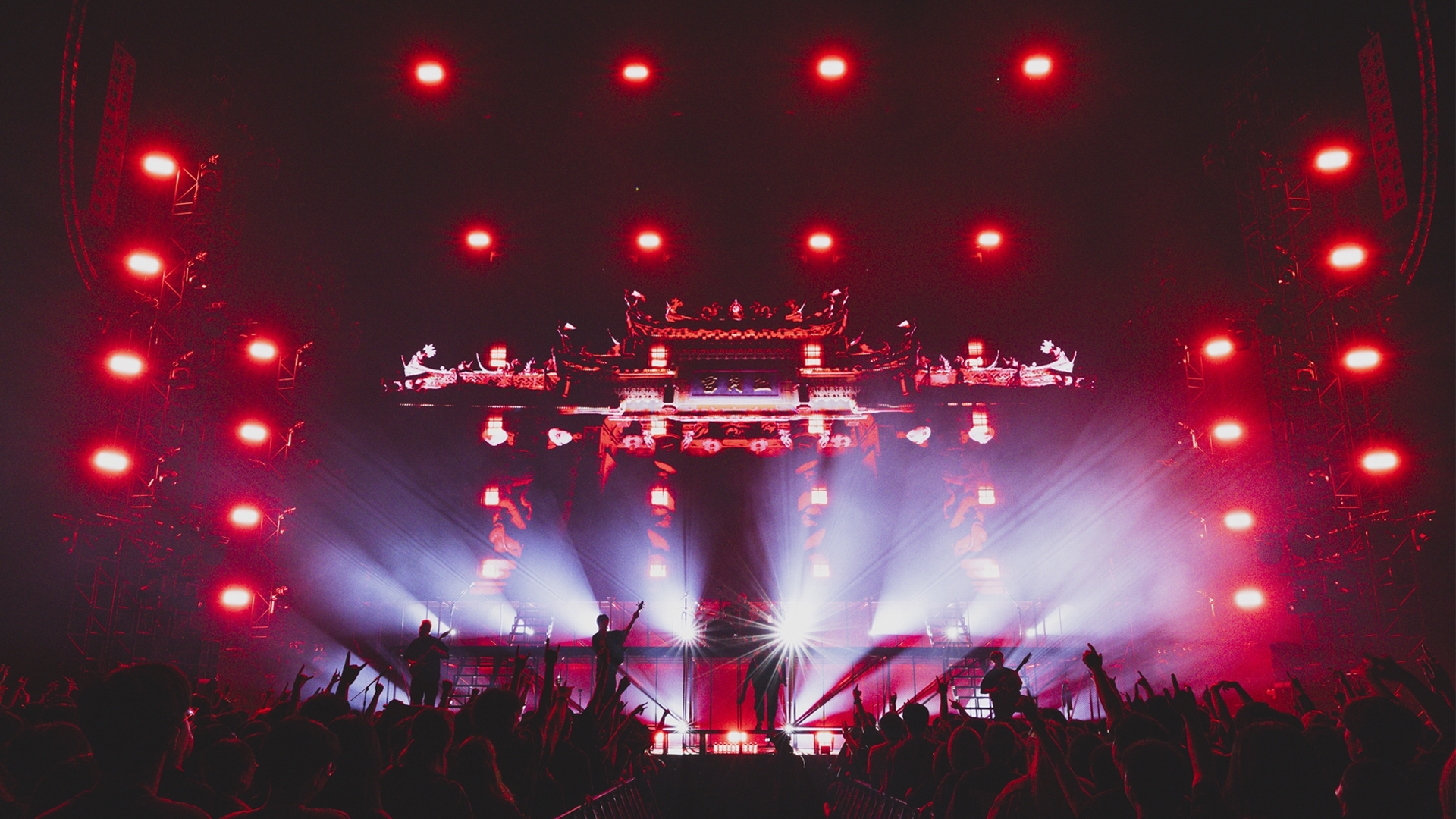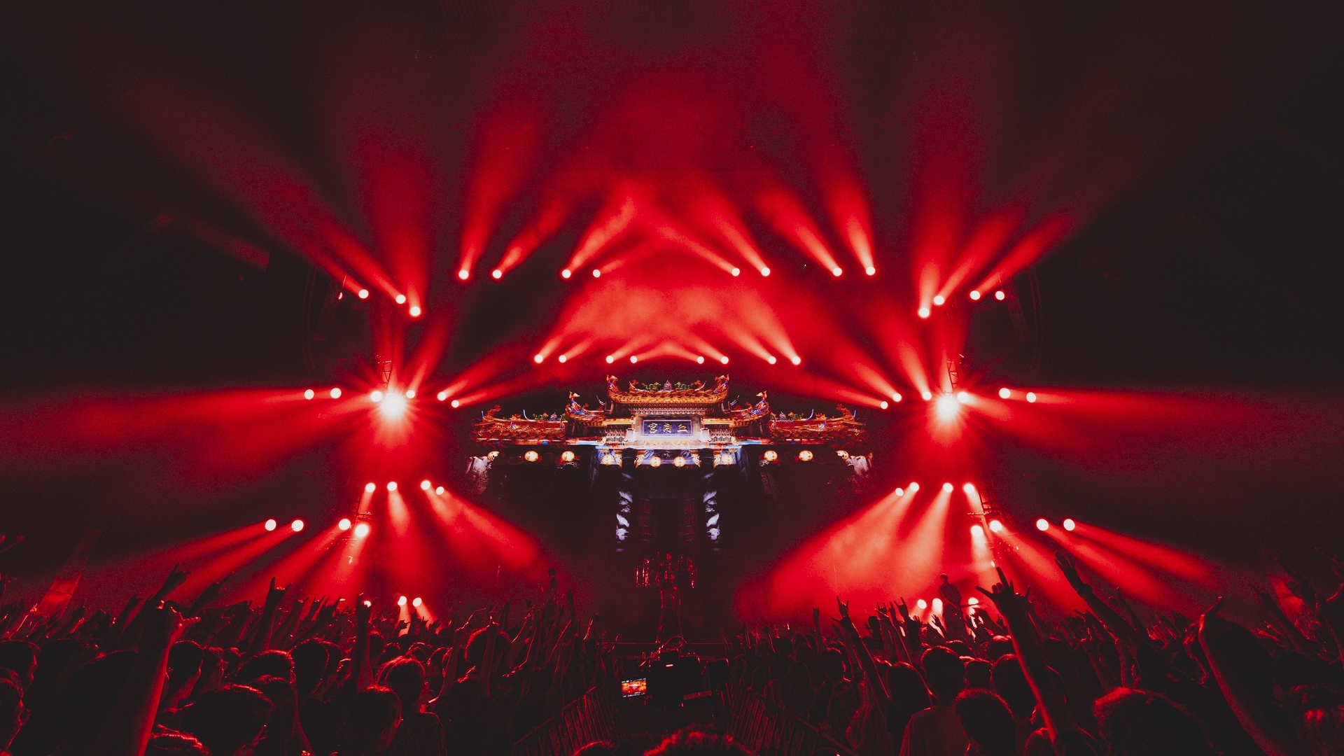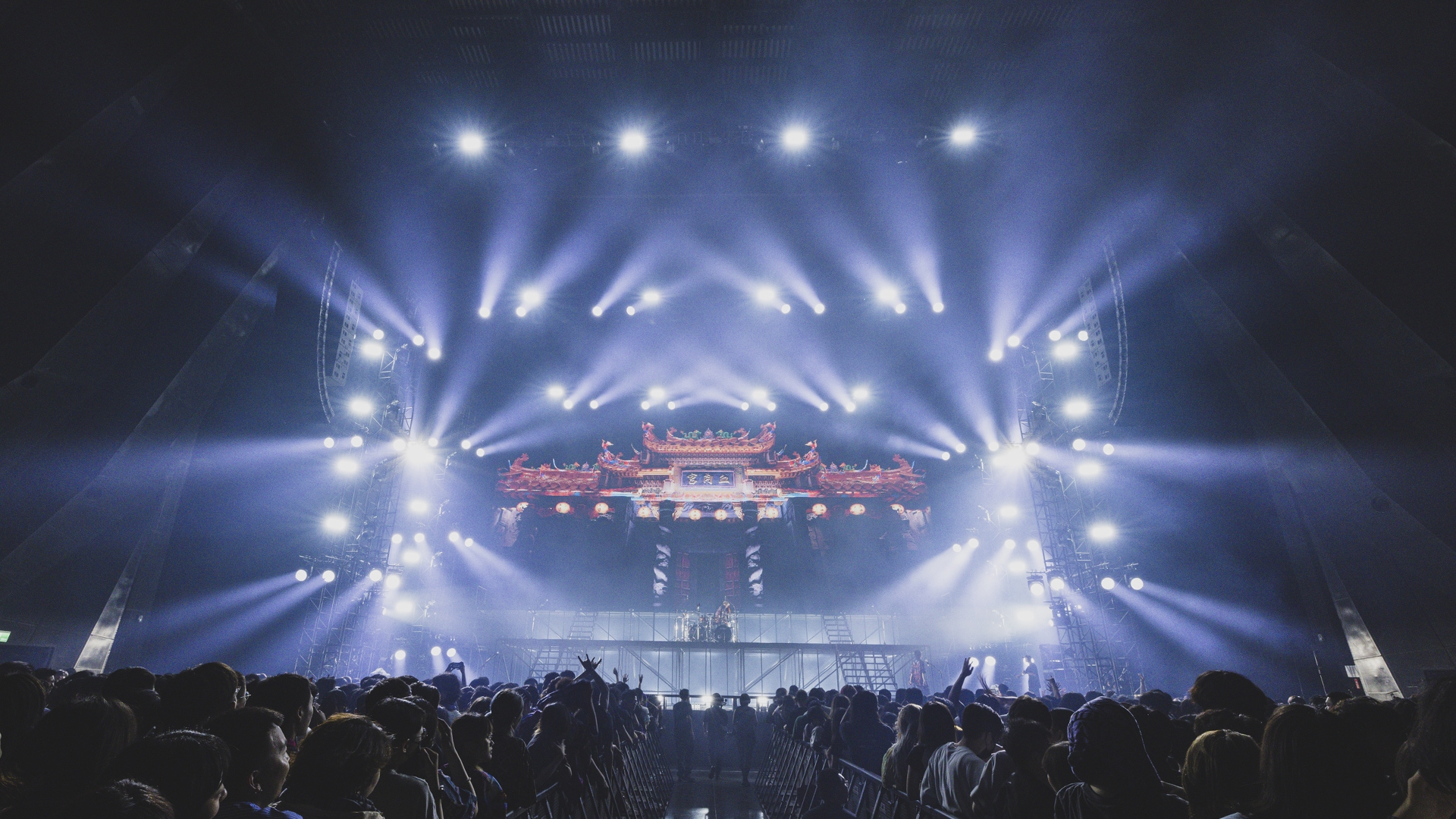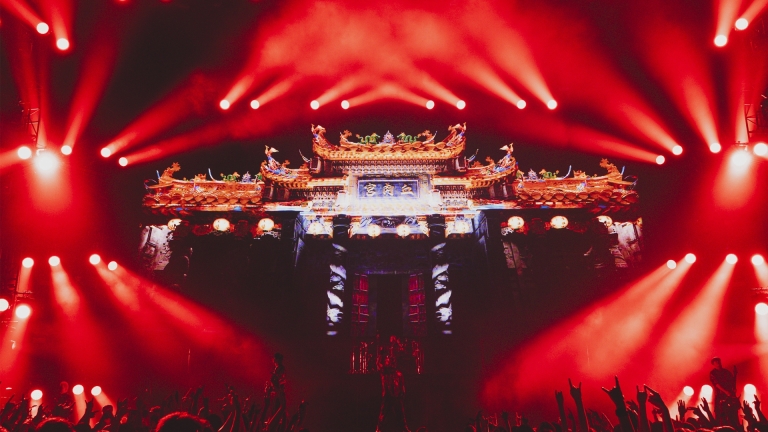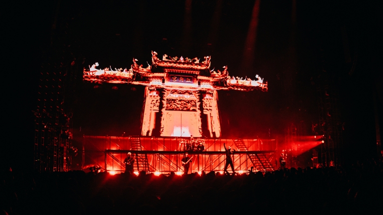 A three-story “Flesh Temple” was built on stage, with lighting structures forming the temple's dragon pillars. Wash lights arranged in clusters of four resembled intricate carvings, delivering dynamic movement and retro visuals akin to traditional lanterns. The industrial stage design, featuring a gate made of metal mesh, combined with heavy smoke and intense backlighting, created a look rarely seen in mainstream music.