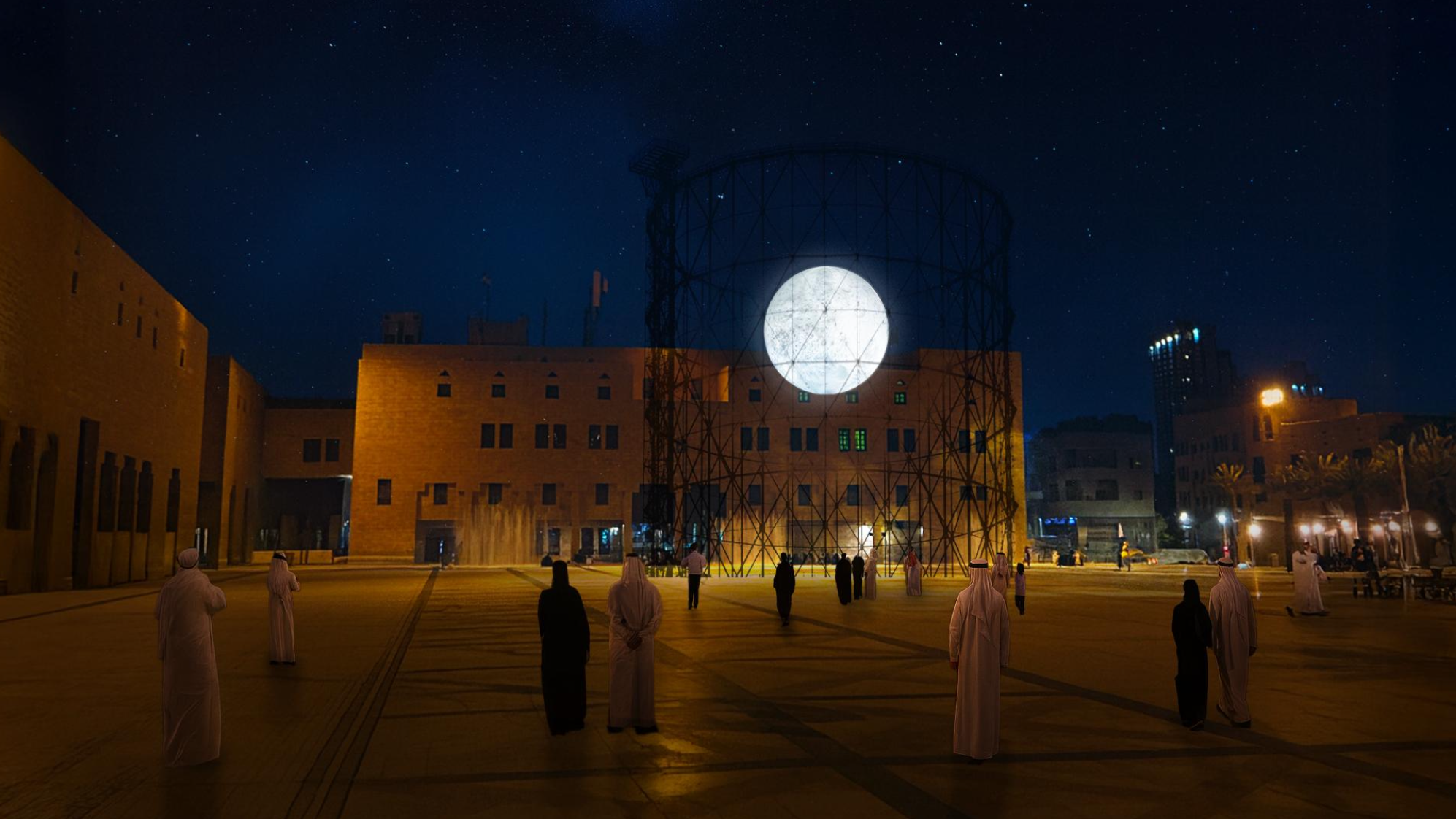 The work features a monumental 360° projected sphere suspended within a structure, visible rom various points in the surrounding environment. Given the scale of the work, Luna Somnium encourages people to view the installation from multiple perspectives while also initiating an individual, emotional exchange with the environment where the experience takes place.