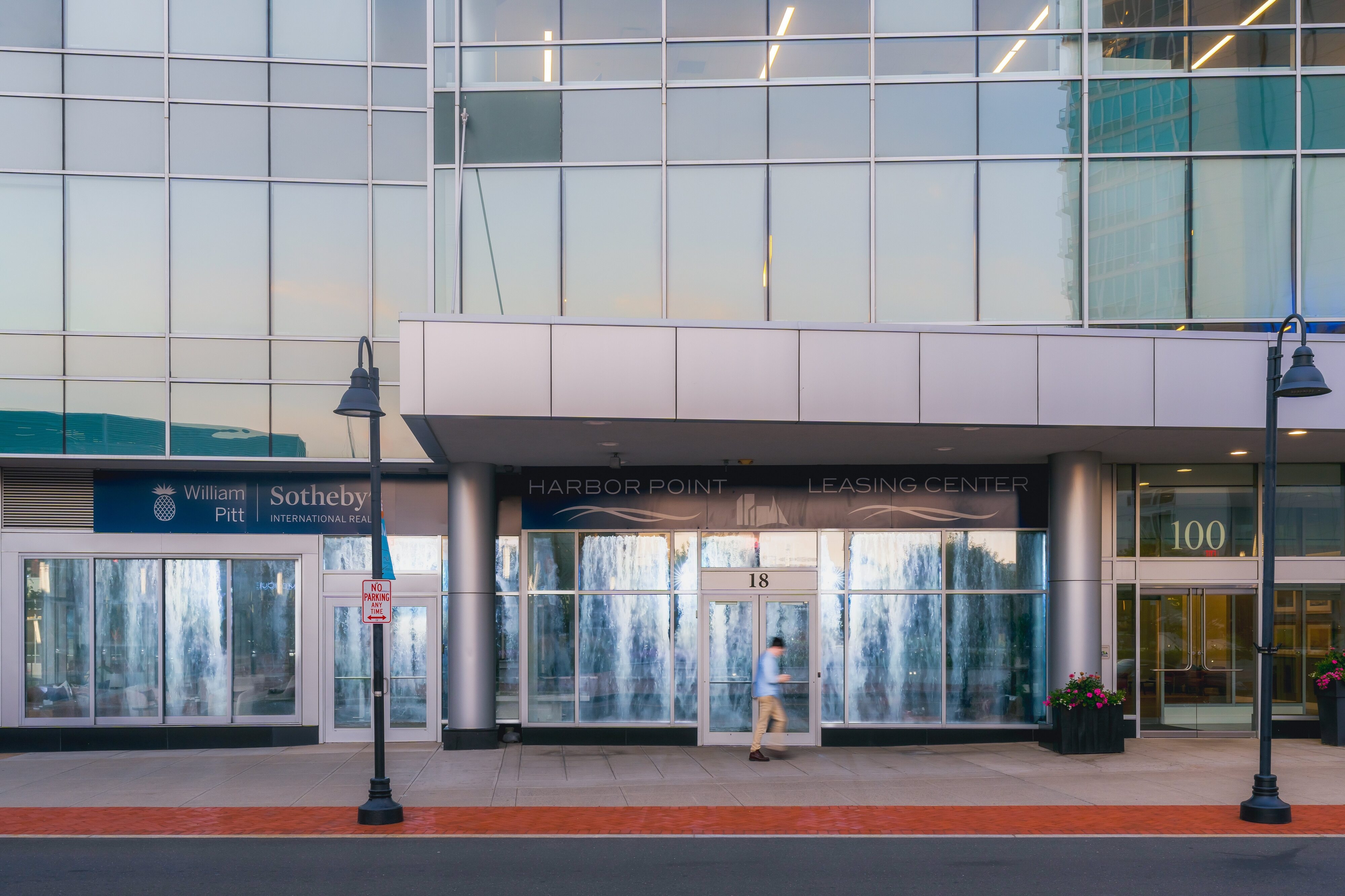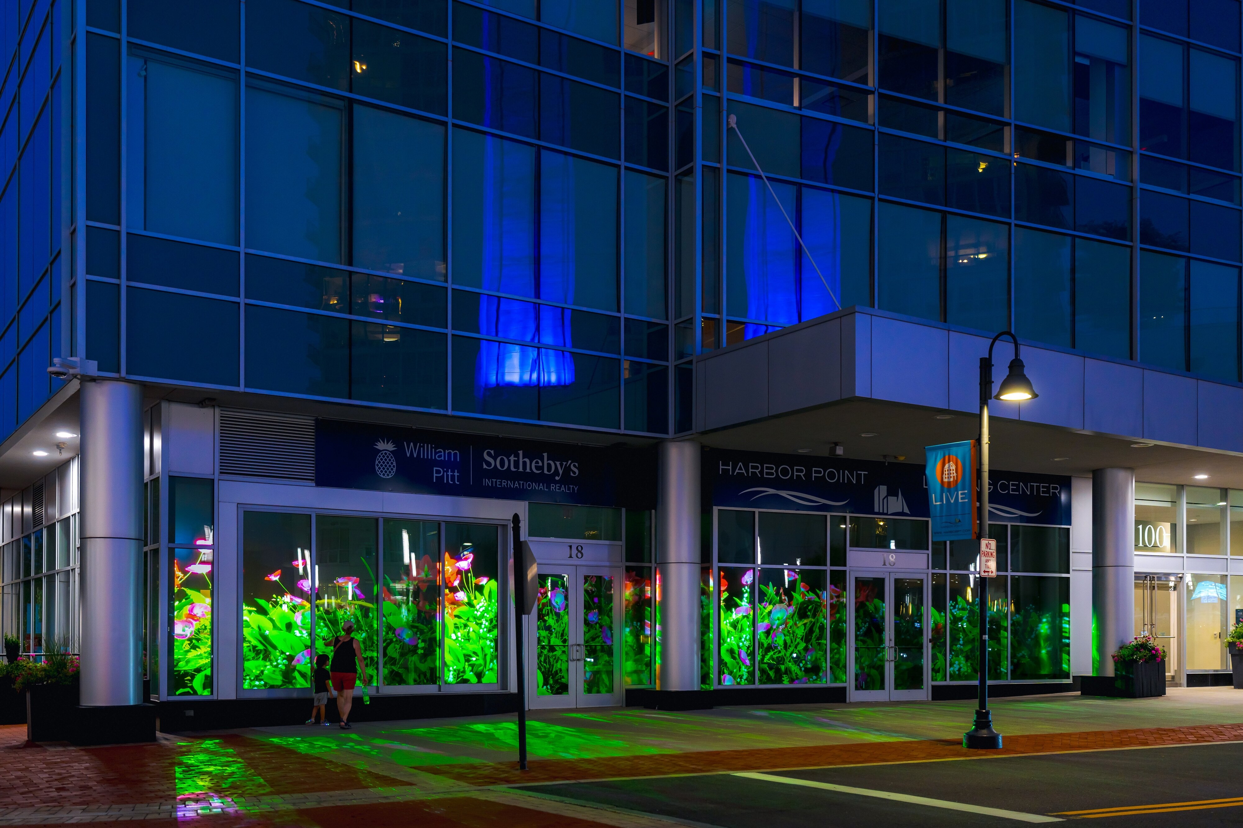 A rising sun illuminates the morning routes of passing joggers; dogs chase bouncing tennis balls as they catapult across the windows; and kids watch the space fill suddenly with a cascading waterfall, then empty and transform to a field of flowers.