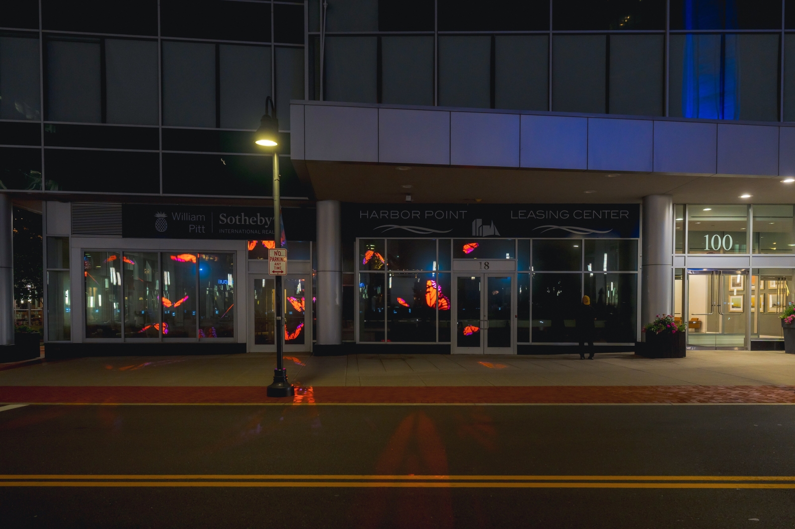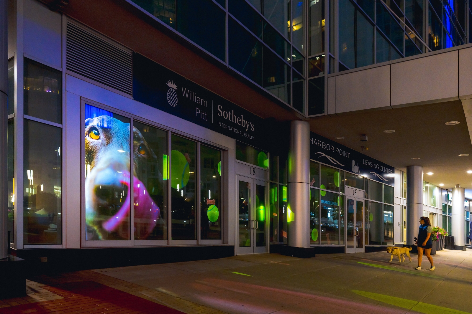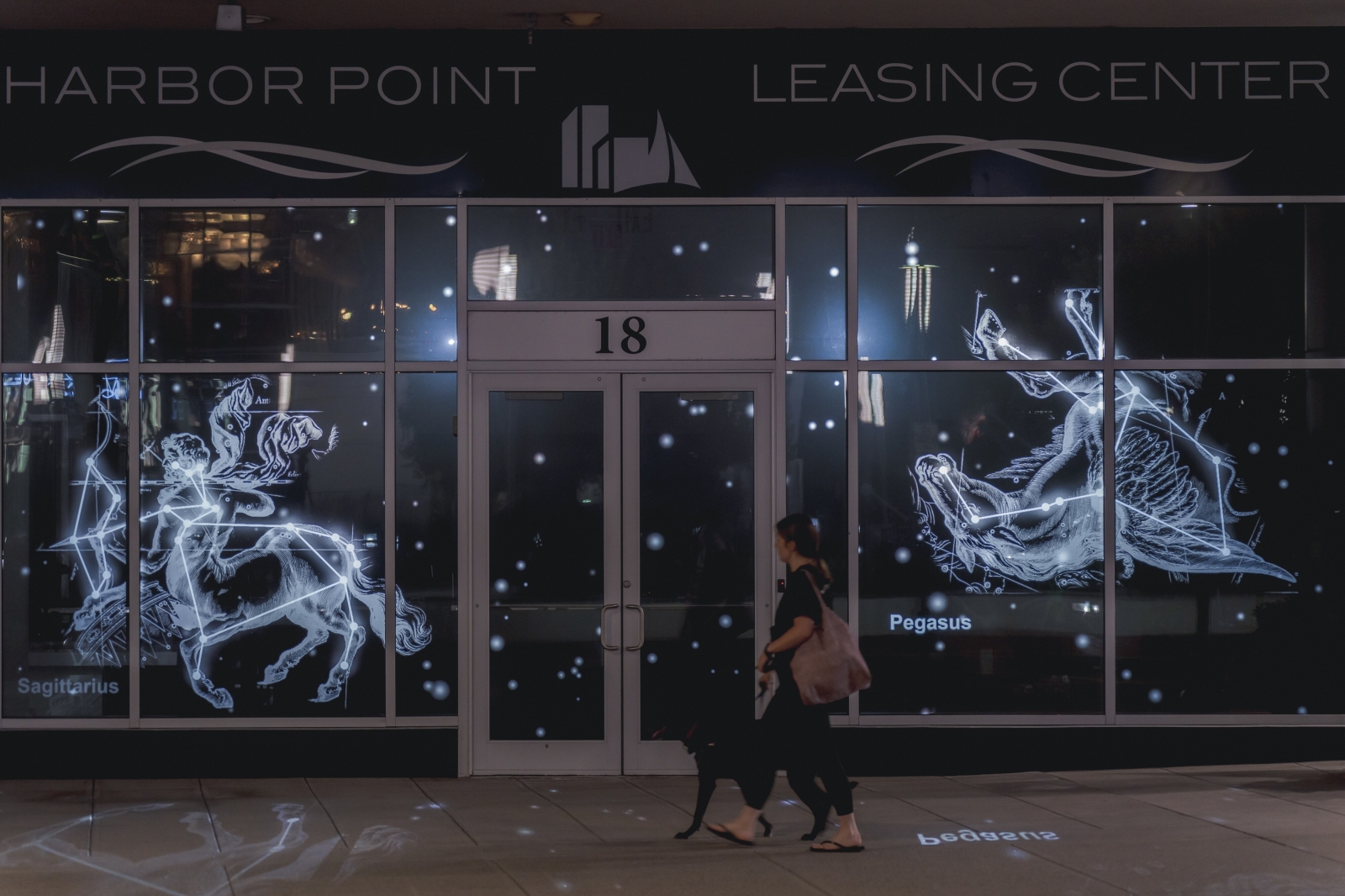 The clips are projected onto street-level windows of the developmentās leasing center in the evenings, enlivening the sidewalk for passersby and projecting the messaging of the center outside the building after the interior has closed down for the day.