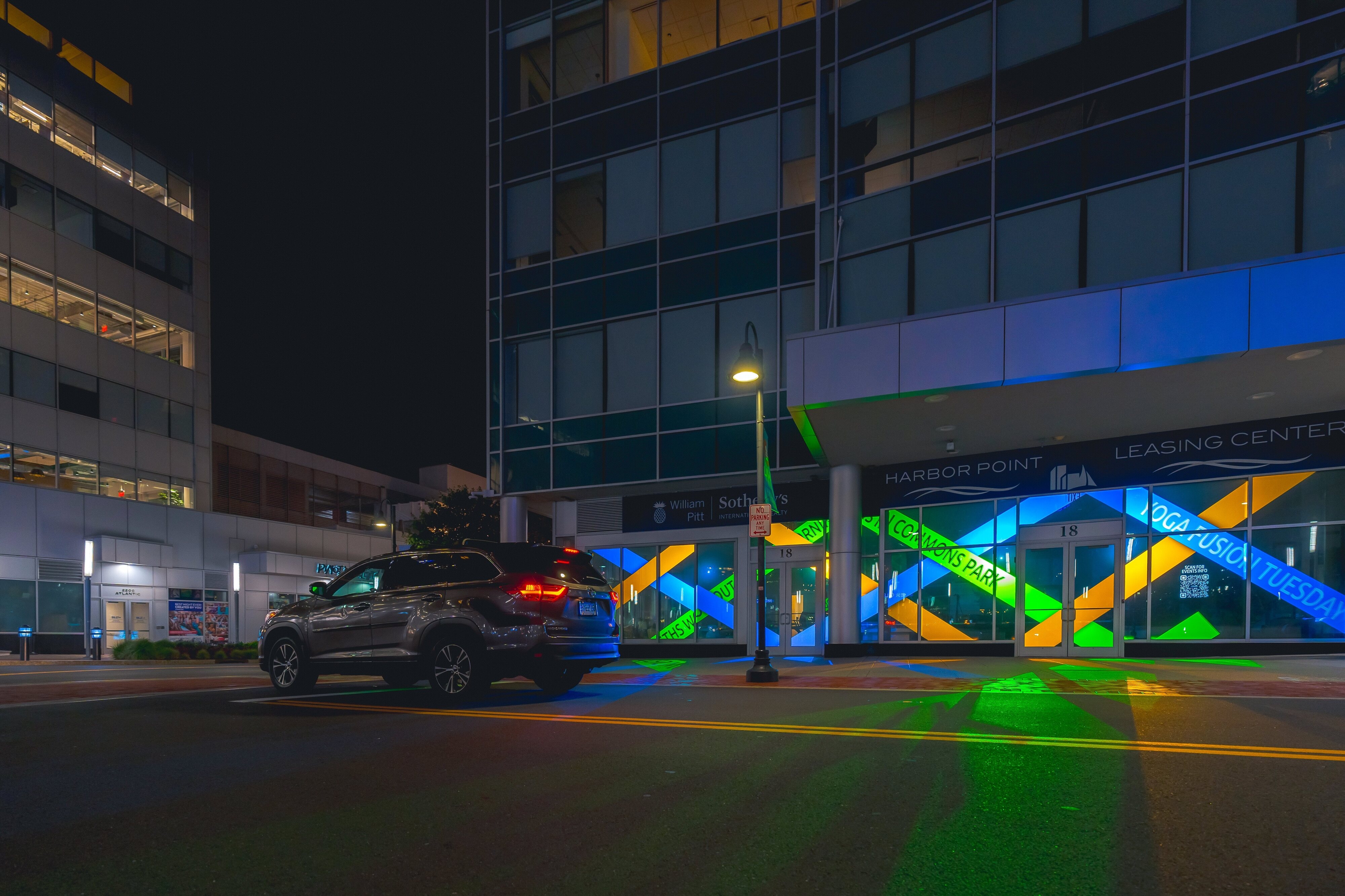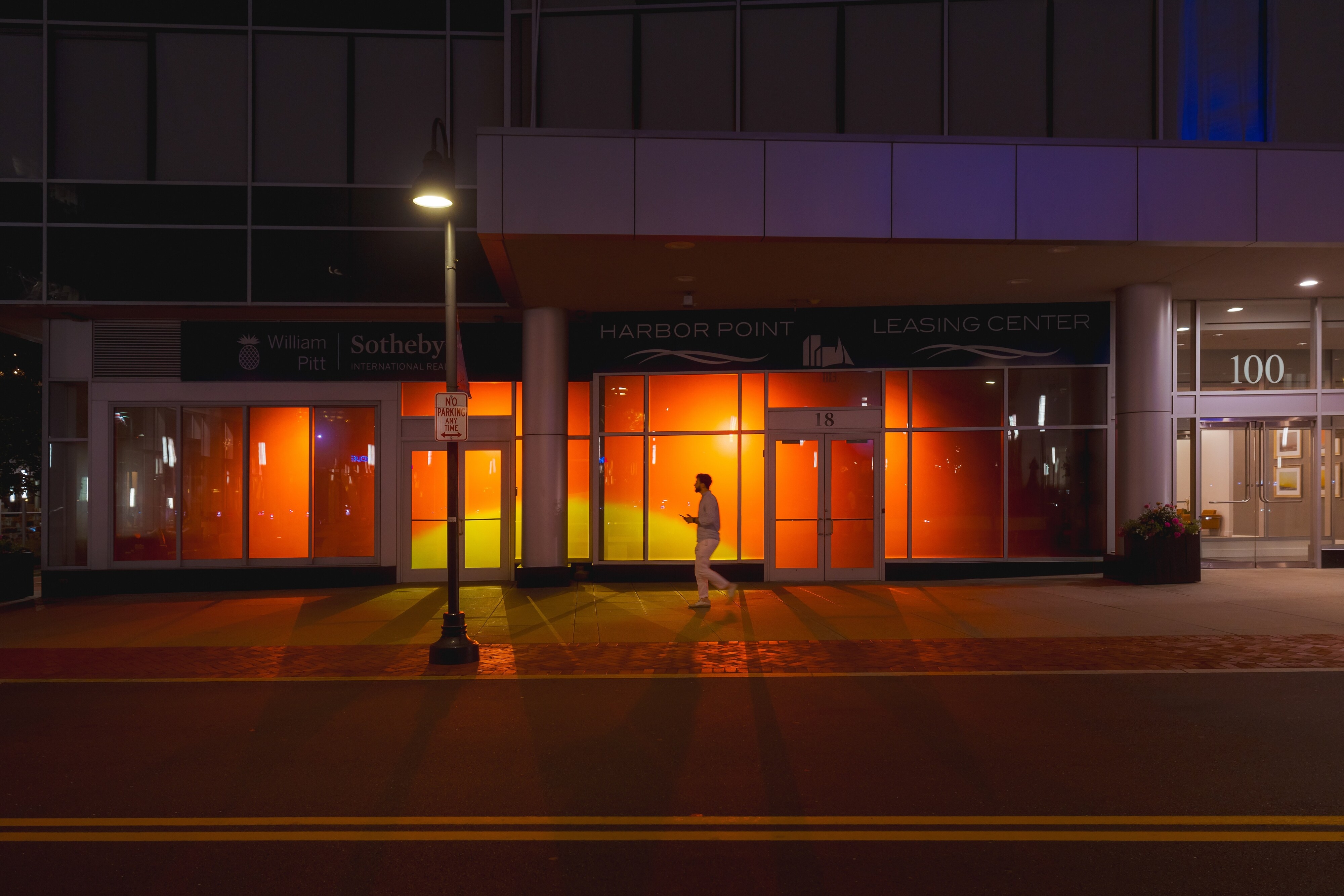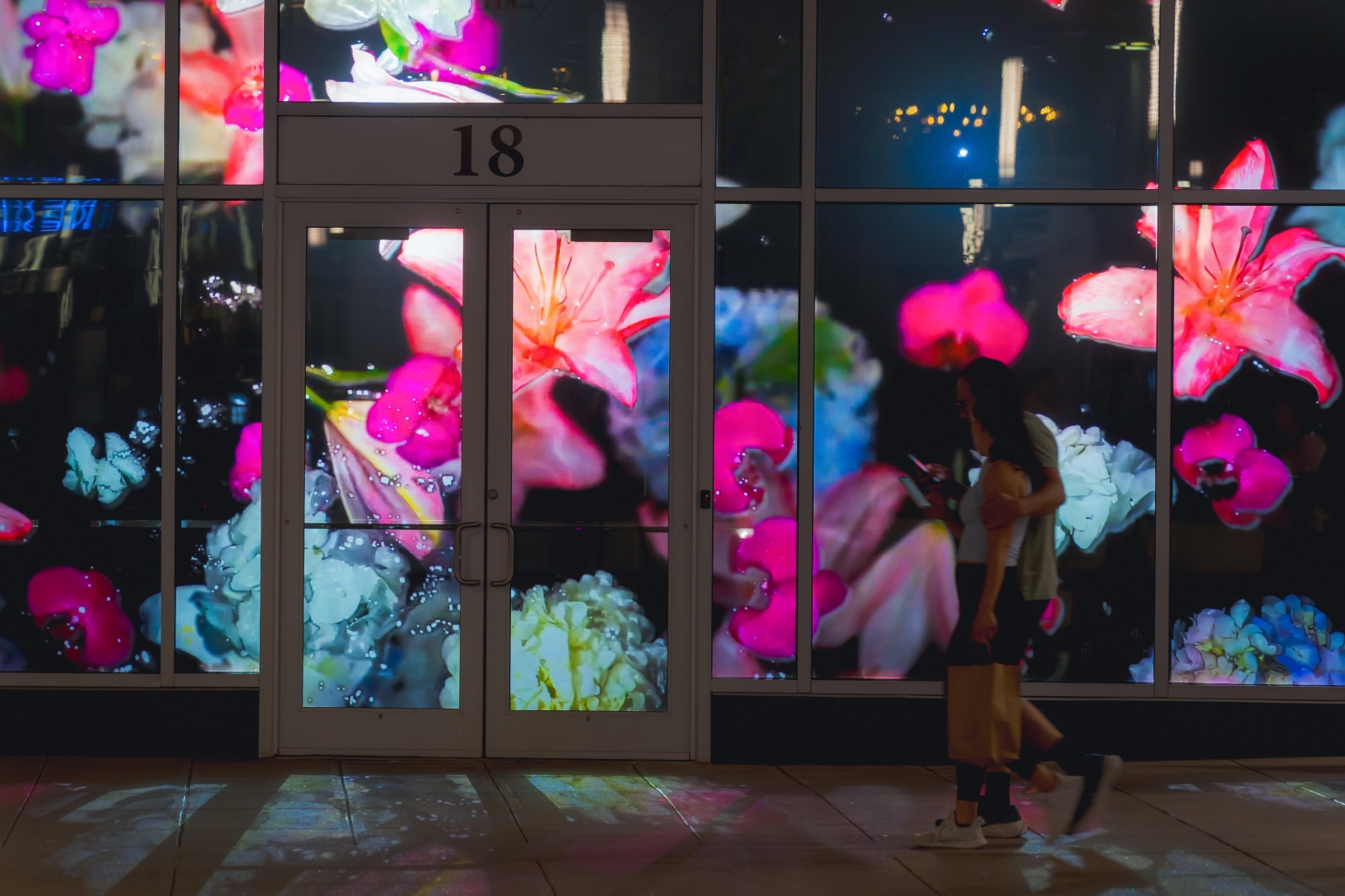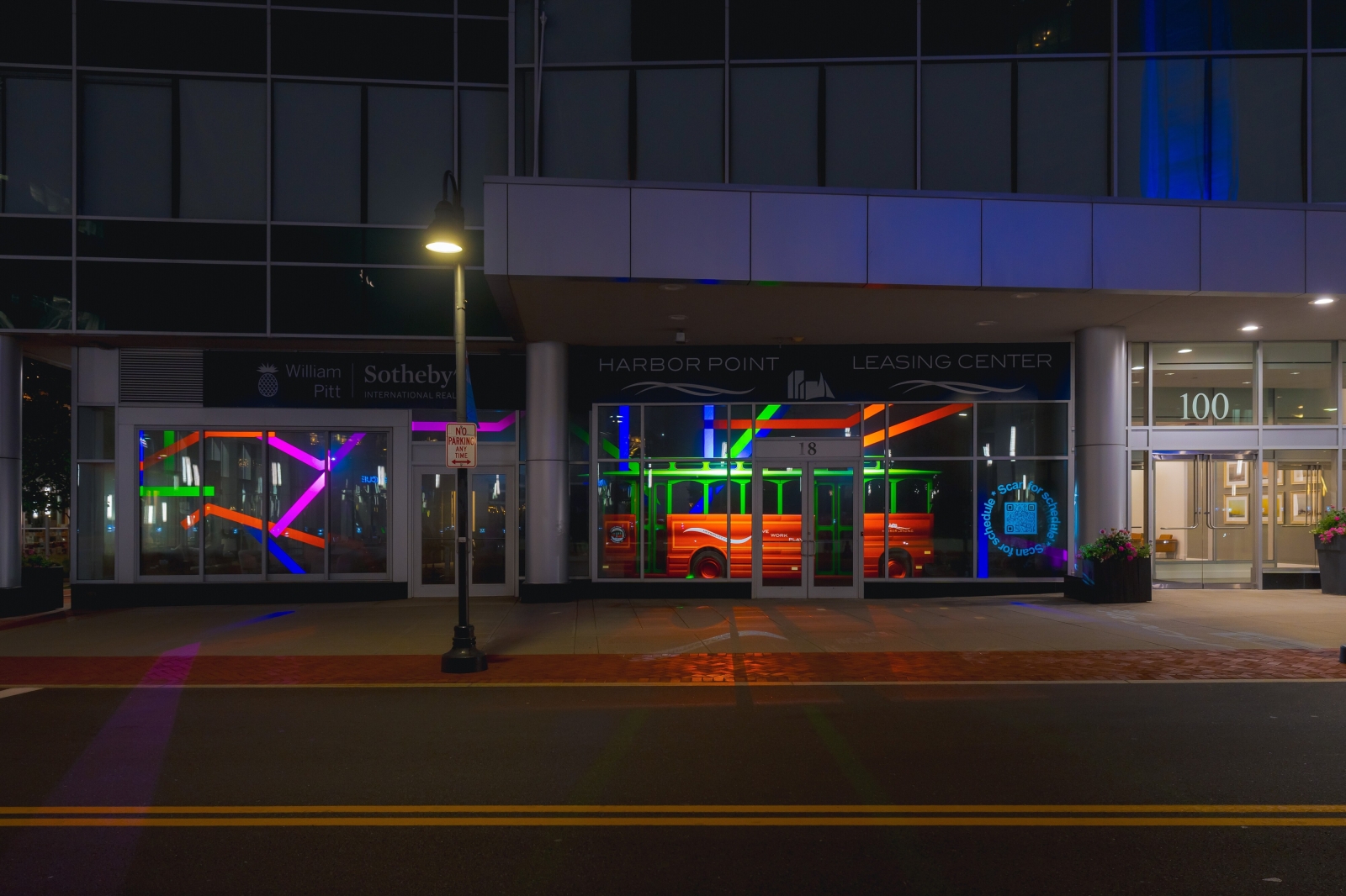 The clips are projected onto street-level windows of the developmentās leasing center in the evenings, enlivening the sidewalk for passersby and projecting the messaging of the center outside the building after the interior has closed down for the day.