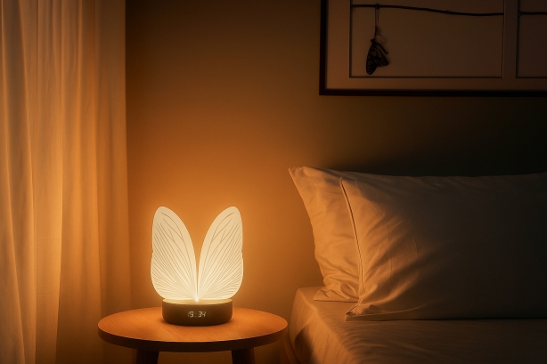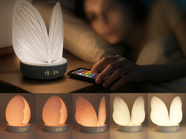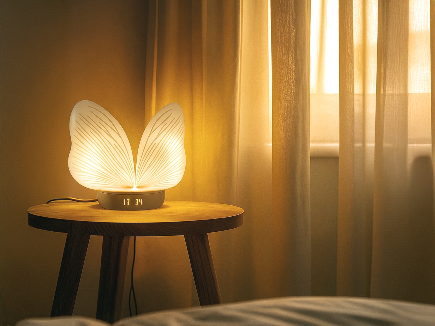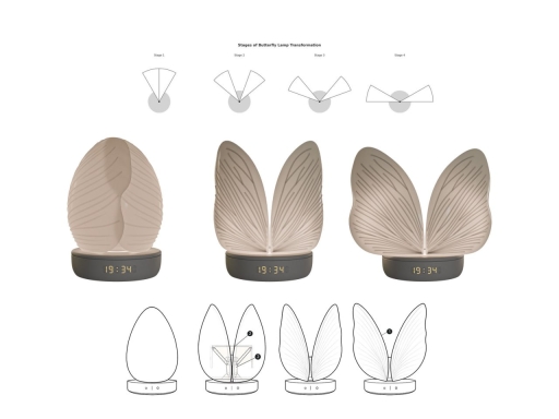 Entry DescriptionInspired by the delicate metamorphosis of a butterfly, this bedside lamp transforms soft illumination into a poetic and calming experience. Its sculptural wings, made of resin, gradually open to emit a warm, breathing light designed to create a sense of peace and relaxation.Based on my experience of life in the Netherlands, where overcast skies and limited morning sunlight can make waking up difficult, the lamp integrates circadian lighting principles to support the body’s natural rhythm. Simulating sunrise and gentle transitions of light, it provides a healthier, more natural start to the day, particularly for windowless or low-light environments.The minimalist base features a subtle digital clock, while smart app controls and low-energy LED technology enhance both convenience and sustainability. With a timeless aesthetic and modular design for easy maintenance, this lamp blends artistry and functionality to enrich everyday living spaces.