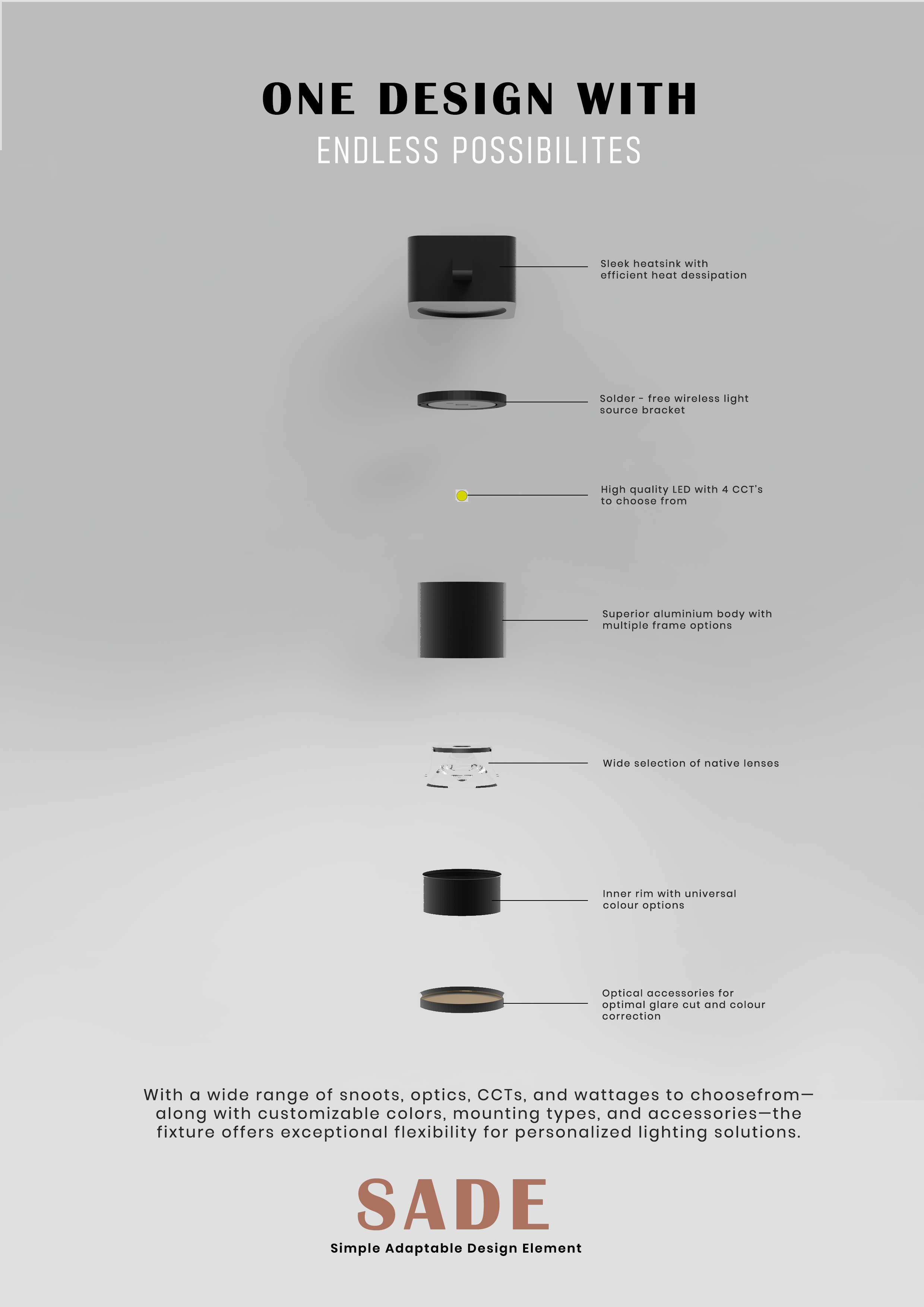 The philosophy, Simple Adaptable Design Element, reflects flexibility without losing visual coherence. Every component—from light modules to trims and accessories—is interchangeable, allowing rotation, replacement, and repositioning to meet evolving spatial needs.
