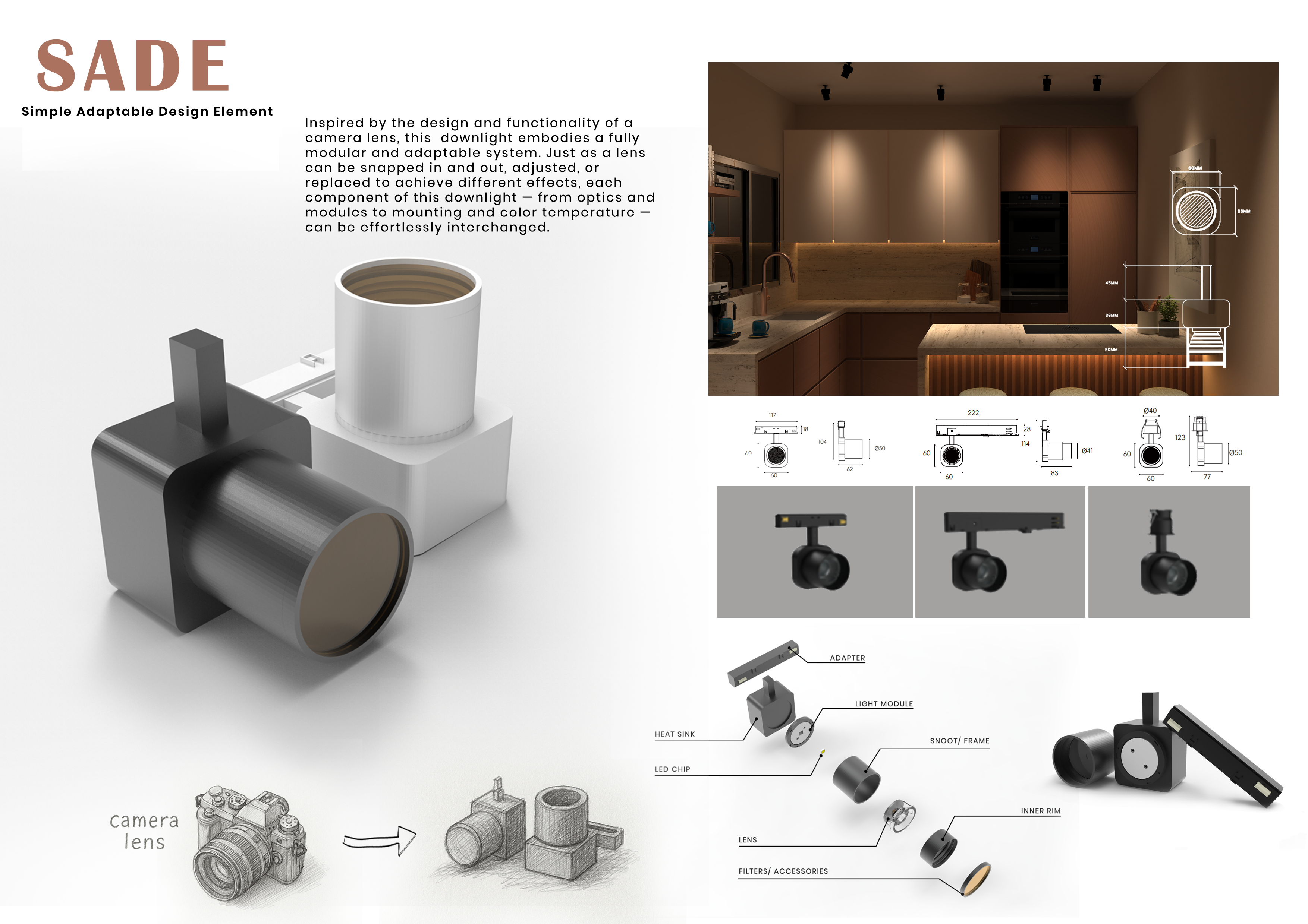 Developed in collaboration with Regent Lighting Switzerland, the SADE Series redefines architectural lighting for residential and retail spaces through a unified design language that blends seamlessly with architecture. Inspired by the precision of a camera lens, SADE embodies modularity, intelligence, and versatility—offering designers precise control over focus, contrast, and ambience.