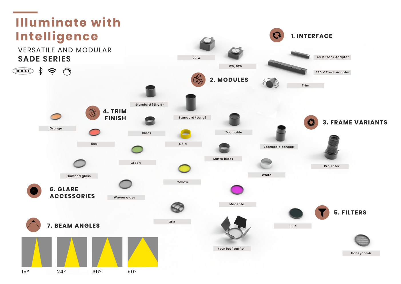 * Interface options for 48V or 220V tracks or trim mounts.