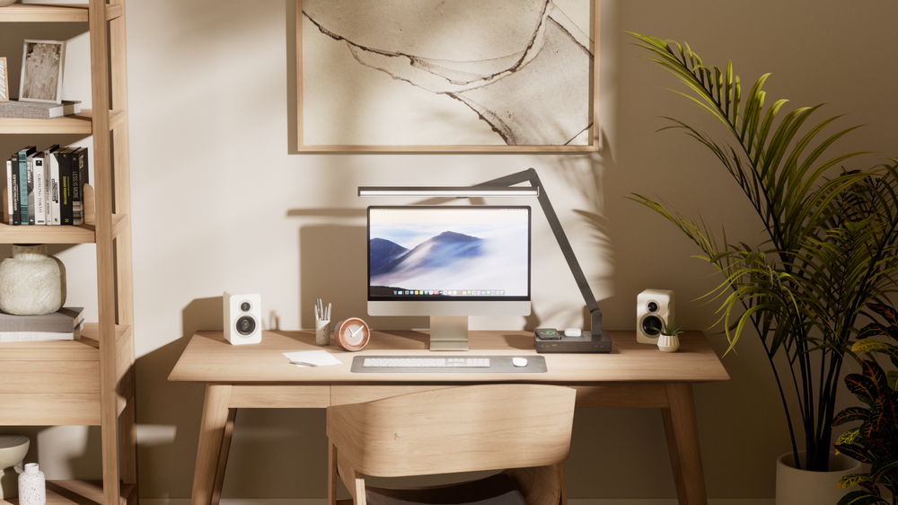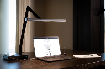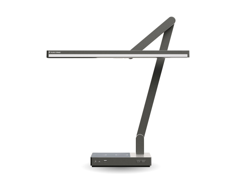 Entry DescriptionThis design reimagines the functionality and versatility of a traditional desk lamp by seamlessly integrating multiple features into a single, elegant solution. The lamp features two independently controlled light sources: one for task lighting and another optimized for video conferencing, both fully dimmable and tunable between 2700K and 6000K with a minimum CRI of 90. Crafted from premium materials and weighing 14.5 pounds, the lamp is designed for stability and durability, ensuring a lifetime of use. Its unique folding design allows it to compactly collapse when not in use, while four pivot points and base rotation provide unmatched adjustability, achieving heights from 8” to 33”. The task light is thoughtfully designed with an asymmetric beam to prevent glare on monitor screens and ensure the light source remains invisible to the user’s eye, promoting comfort during prolonged use. Additionally, the lamp includes advanced functionality such as a built-in vacancy sensor, two wireless charging pads, a USB-A port, a USB-C port with 65W power output, and an HDMI port, enabling it to double as a docking station. The video conferencing light delivers an even, flattering glow. This thoughtful design reduces reliance on overhead lighting, lowers energy consumption, and combines utility with sophisticated aesthetics to enhance modern workspaces.