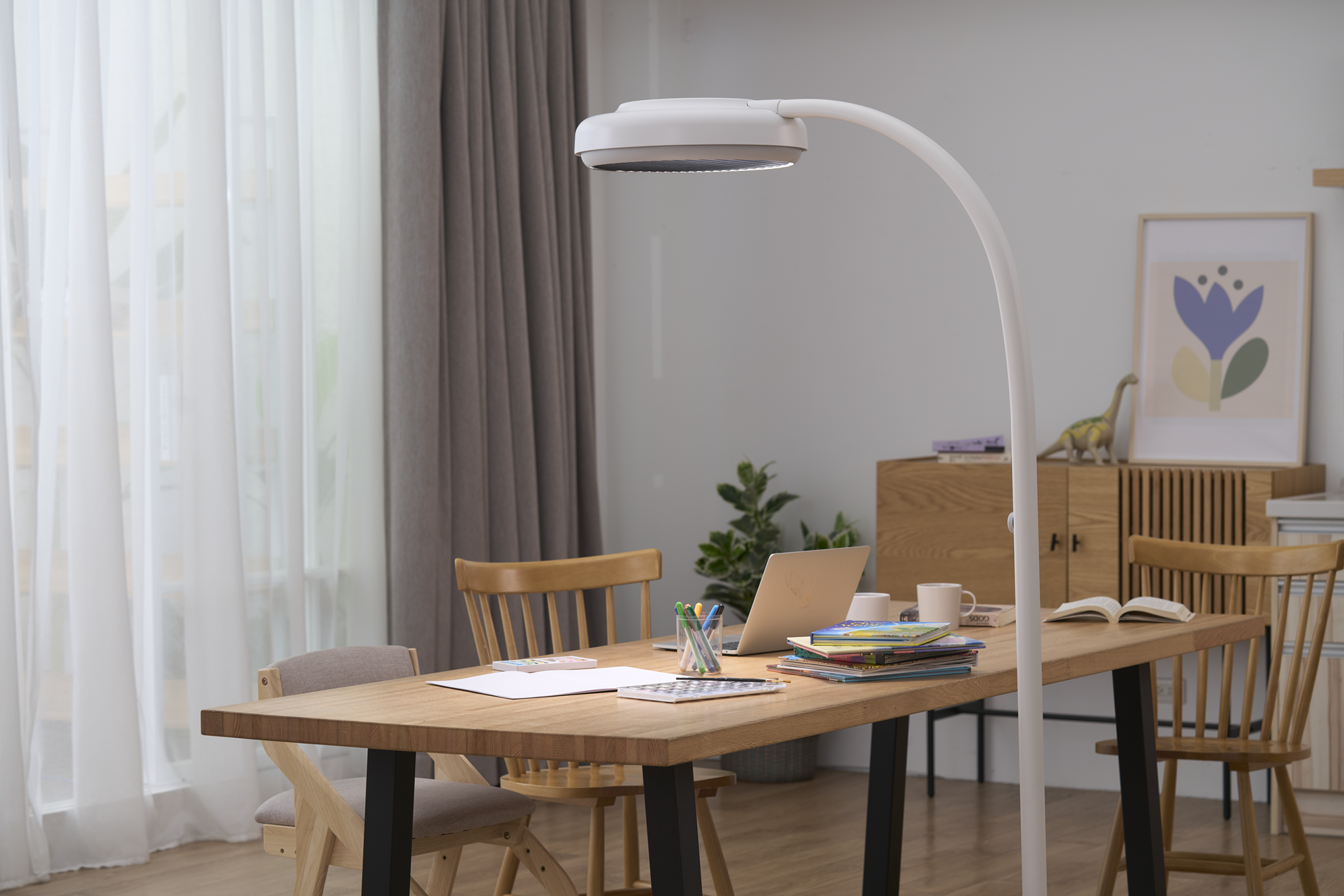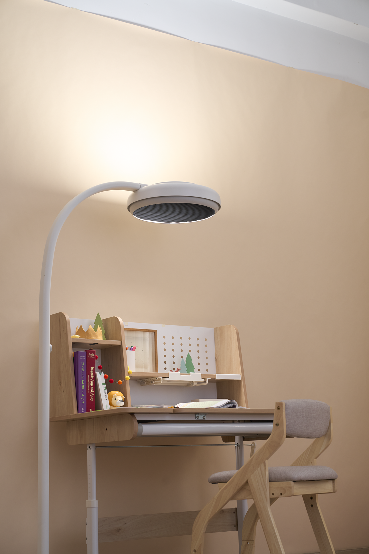 In terms of appearance, its rounded, child-friendly design blends seamlessly into home interiors, avoiding the industrial feel of typical office floor lamps. Available in white, purple, and green, it brings a touch of color and joy to every child’s space.