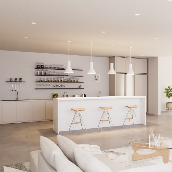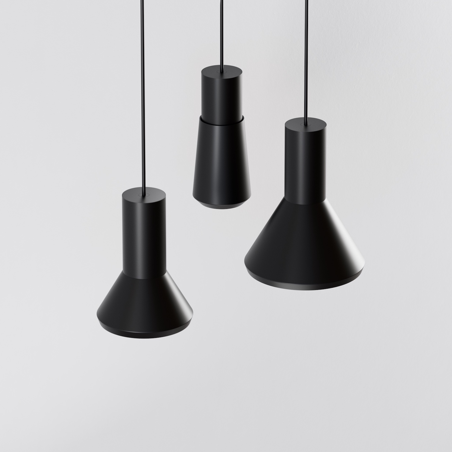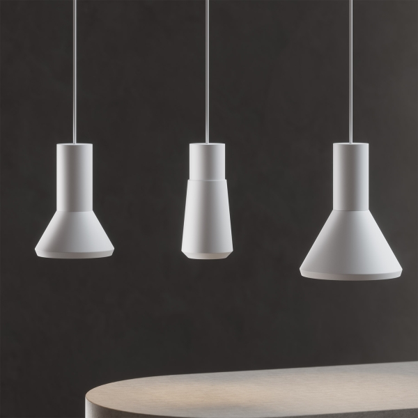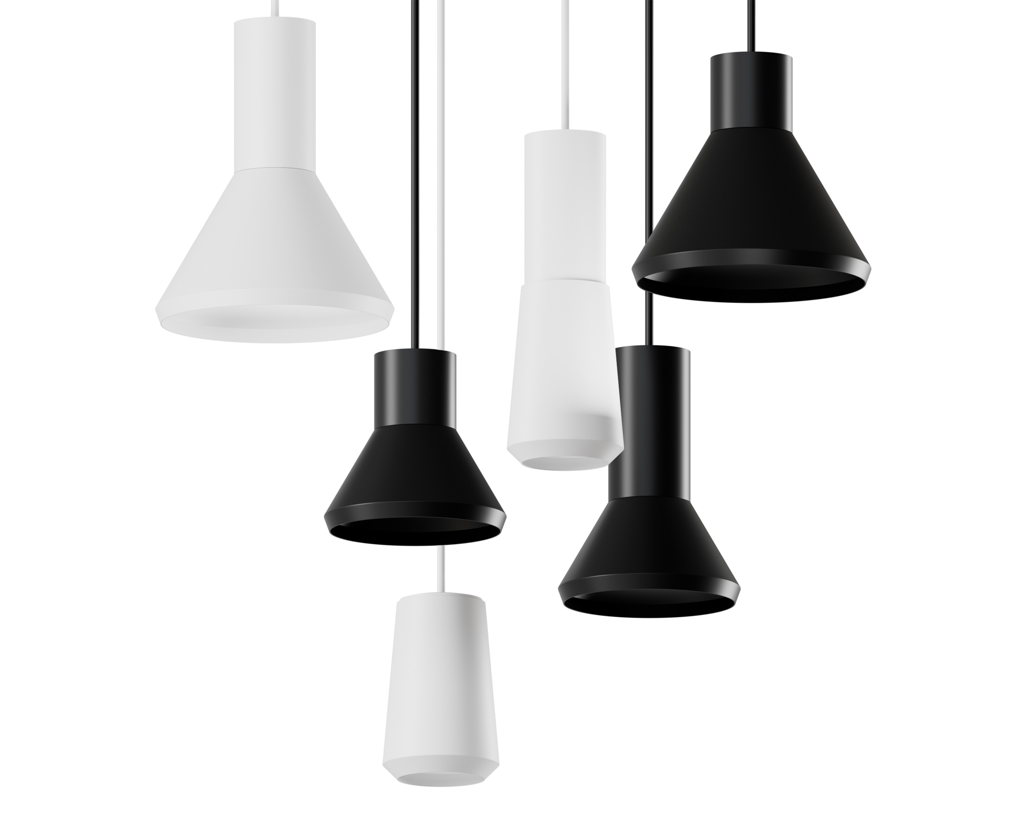 The Pendants feature concealed hardware, allowing the high-quality die-cast aluminum shades to seamlessly integrate into the pendant, resulting in a sleek and symmetrical aesthetic. The shadowless uplight option allows for direct and indirect lighting from a single pendant.